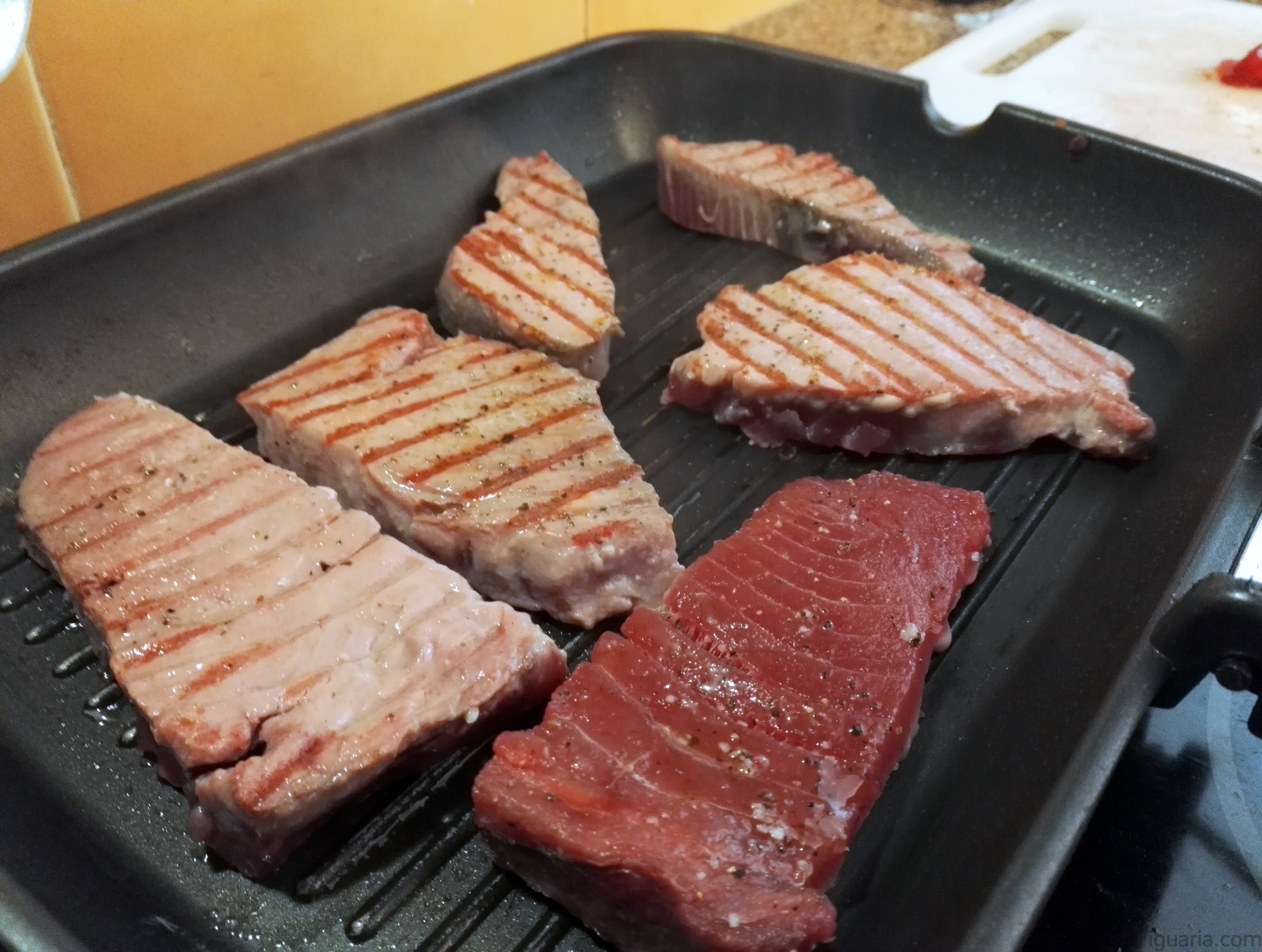- Corta uns bifes de atum, tempera com sal e pimenta e leva a grelhar até ficarem ao teu gosto.