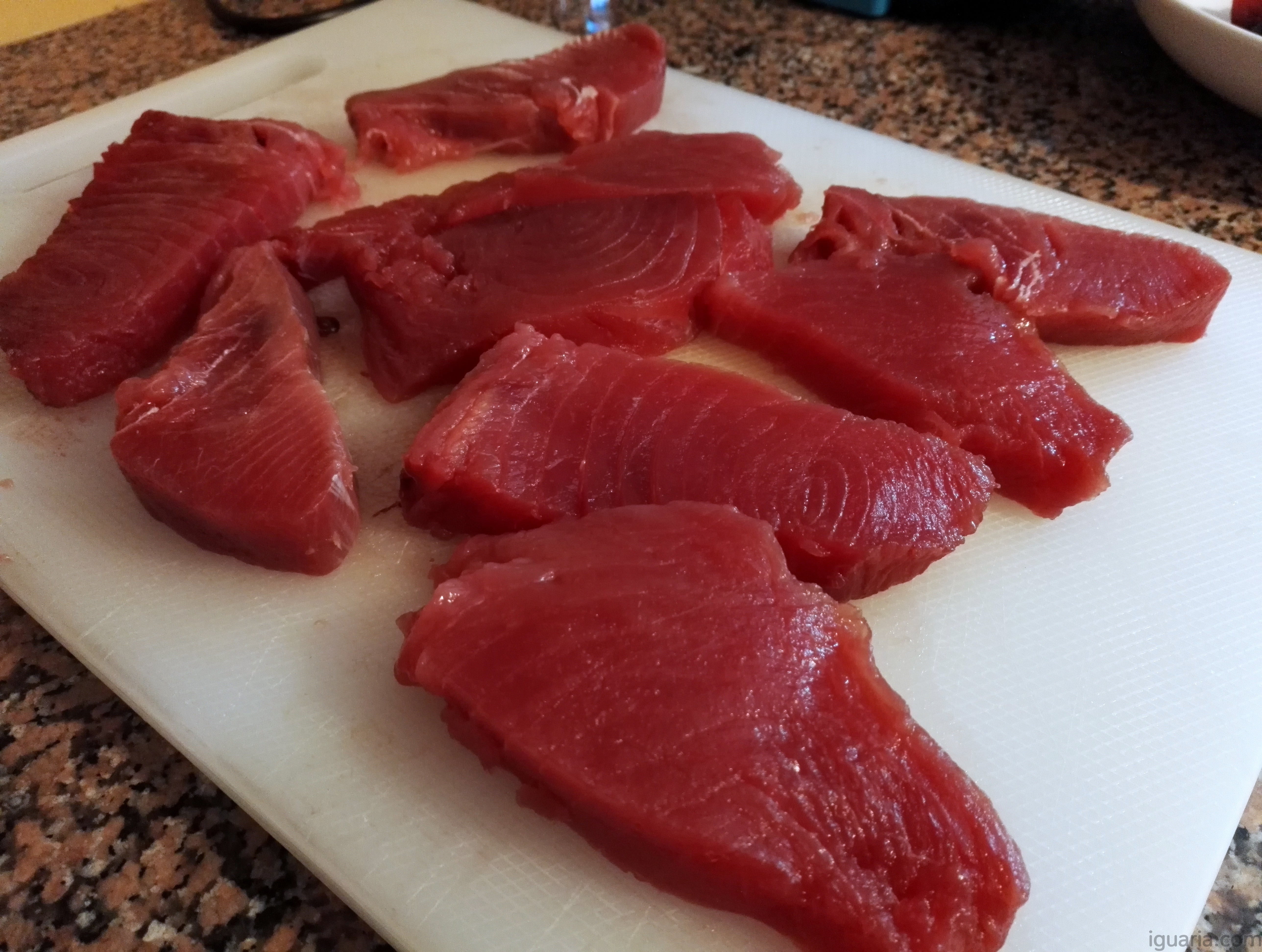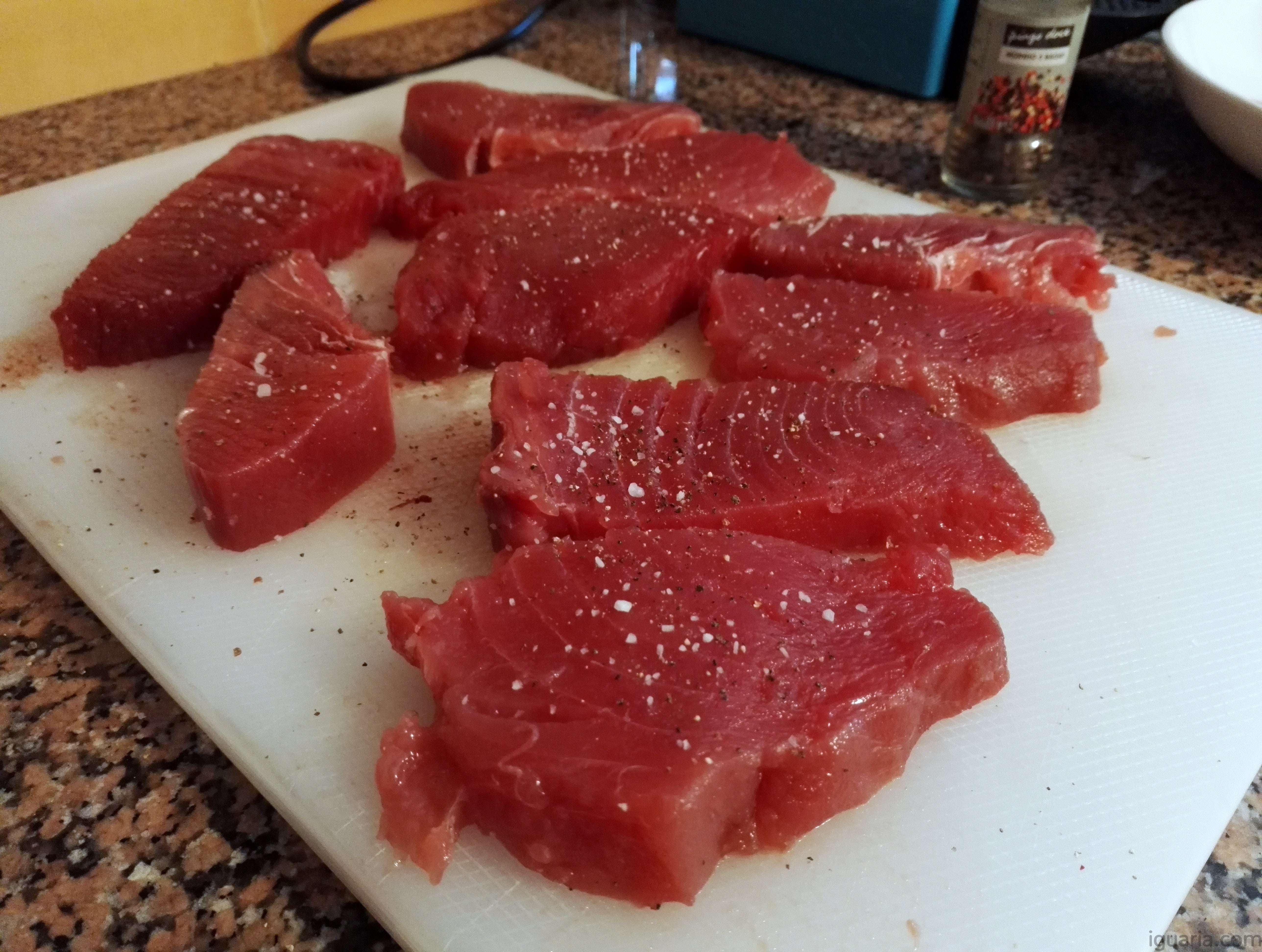 - Se compraste um naco de atum, corta este em bifes, neste caso cortei +/- 6 bifes, mas claro podes comprar bifes já cortados ao teu gosto e/ou a quantidade que precisas, depois tempera os bifes com uma pitada de sal grosso e pimenta, aquece um grelhador ou frigideira de grelhar.