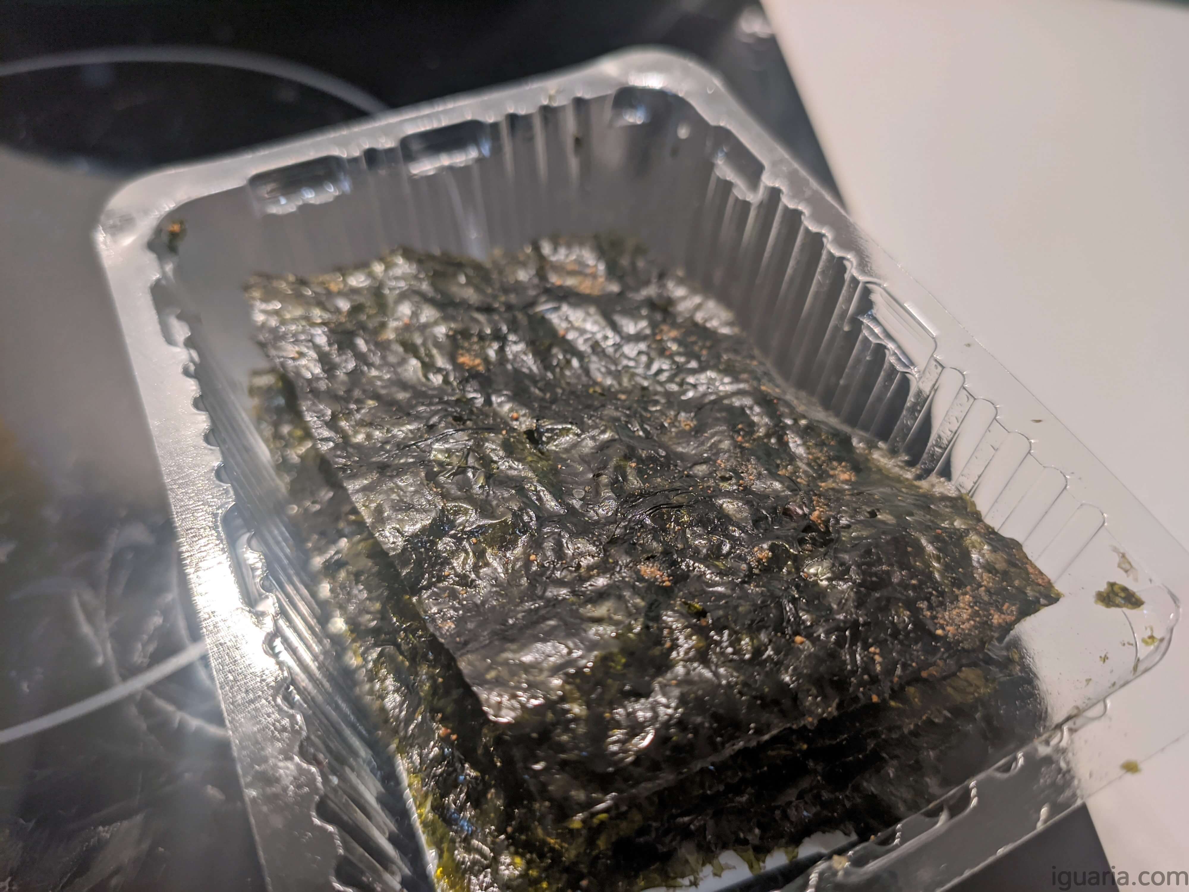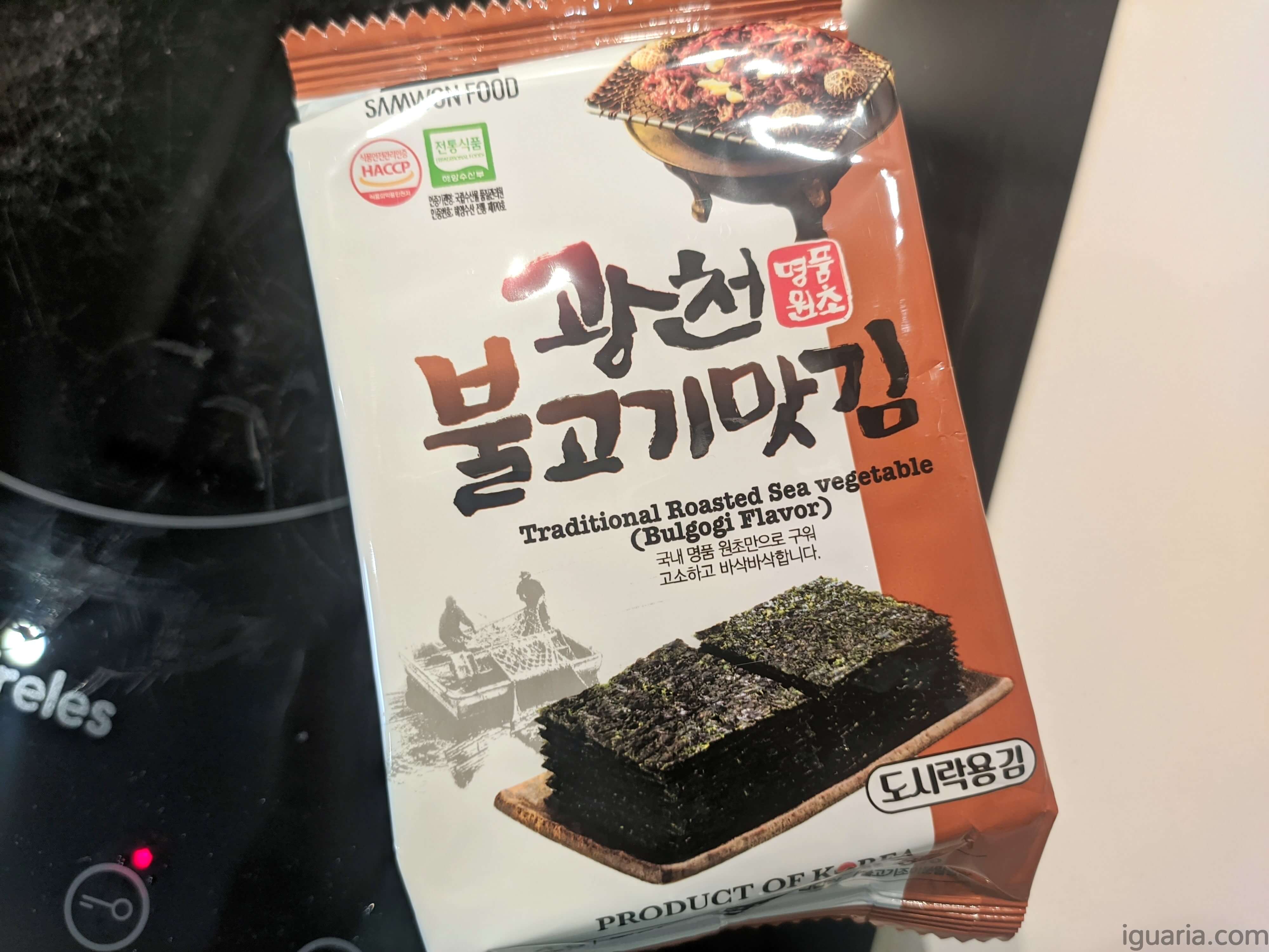 Também usei algas nori fritas coreanas, porque era o que tinha, o mais comum é usar algas nori simples e cortas estas em retangulos mais pequenos ou em tiras, mas para variar estas versões coreanas também são deliciosas mesmo que um pouco menos saudáveis porque em vez de secas são fritas.