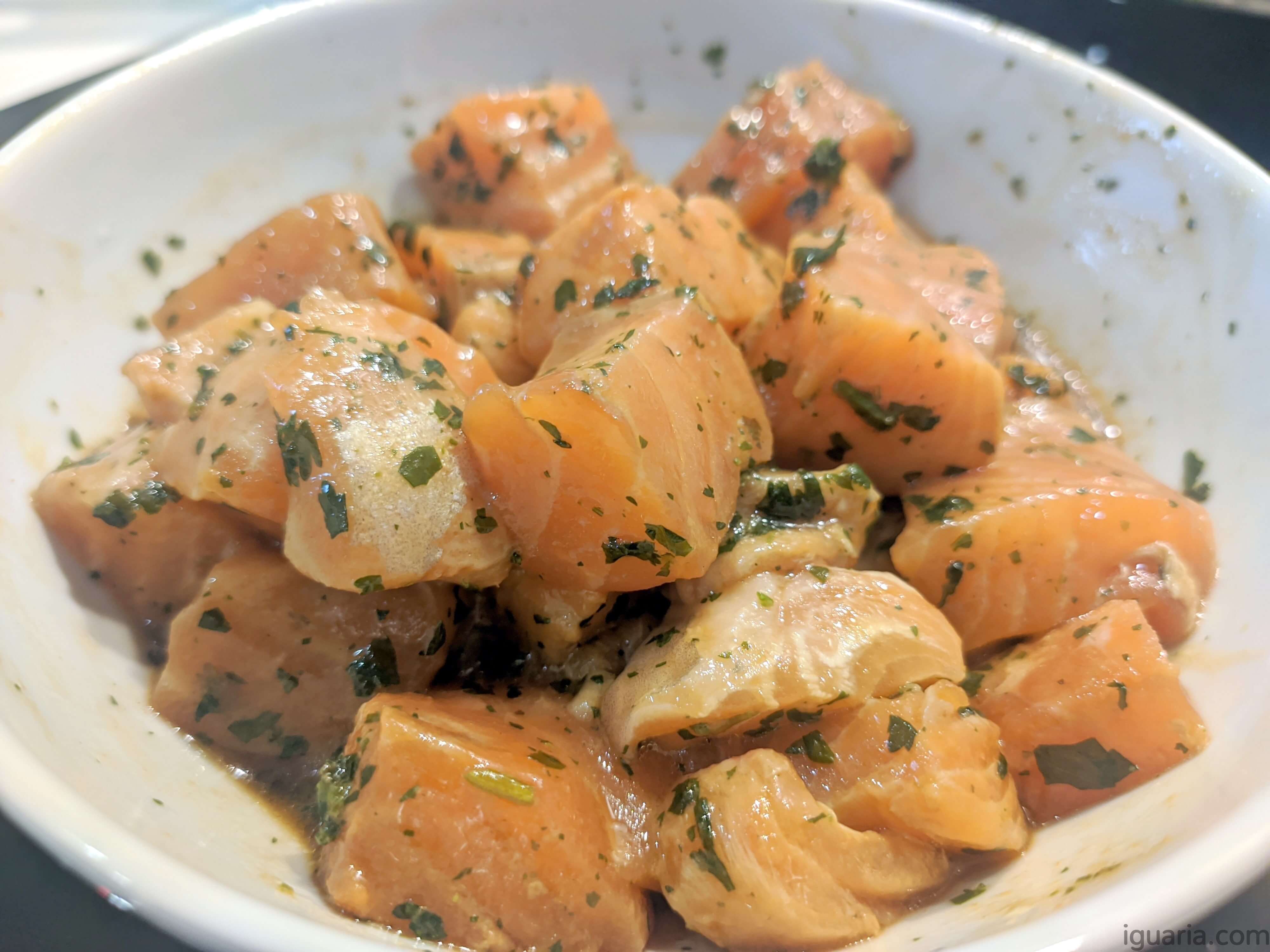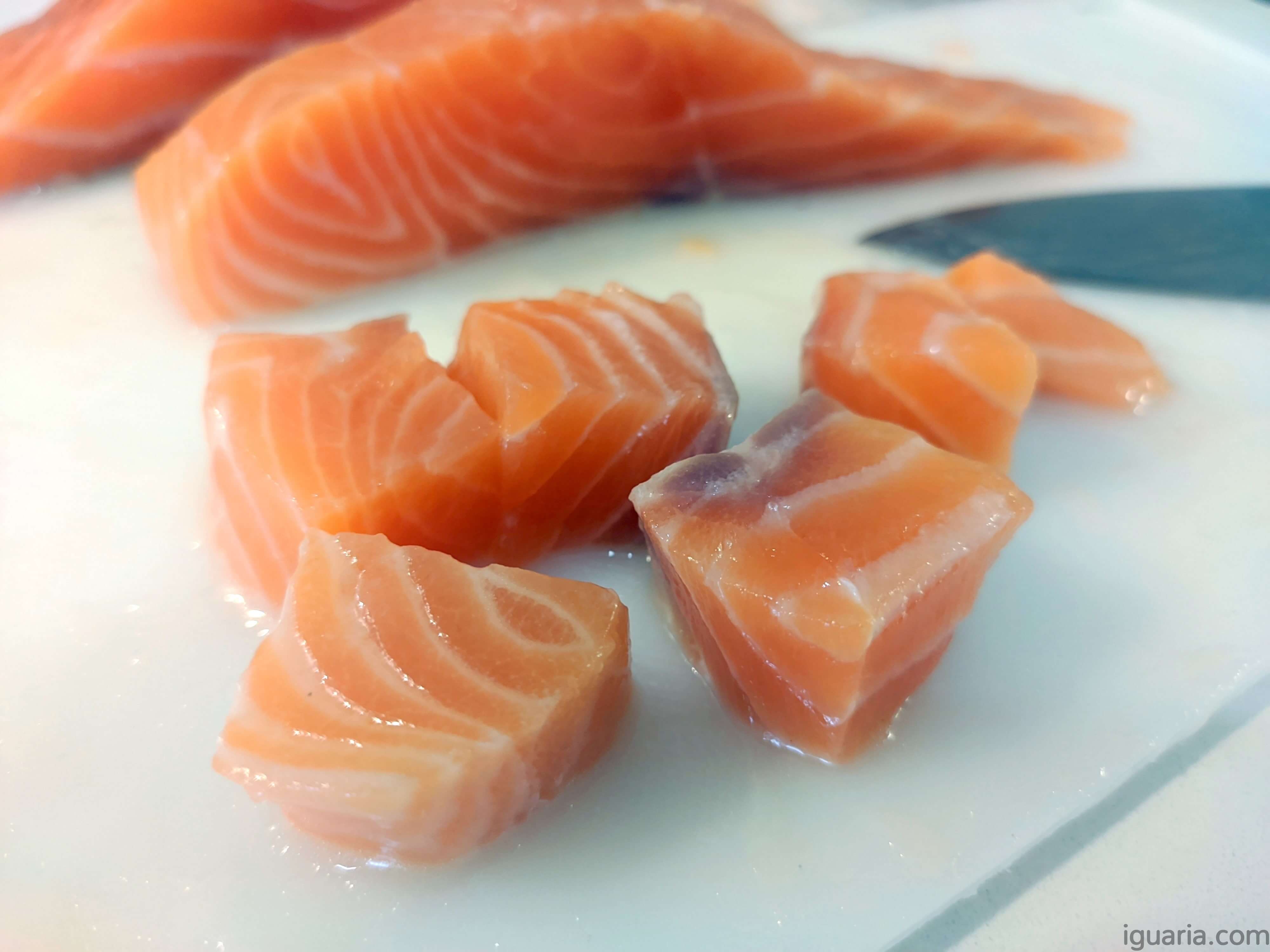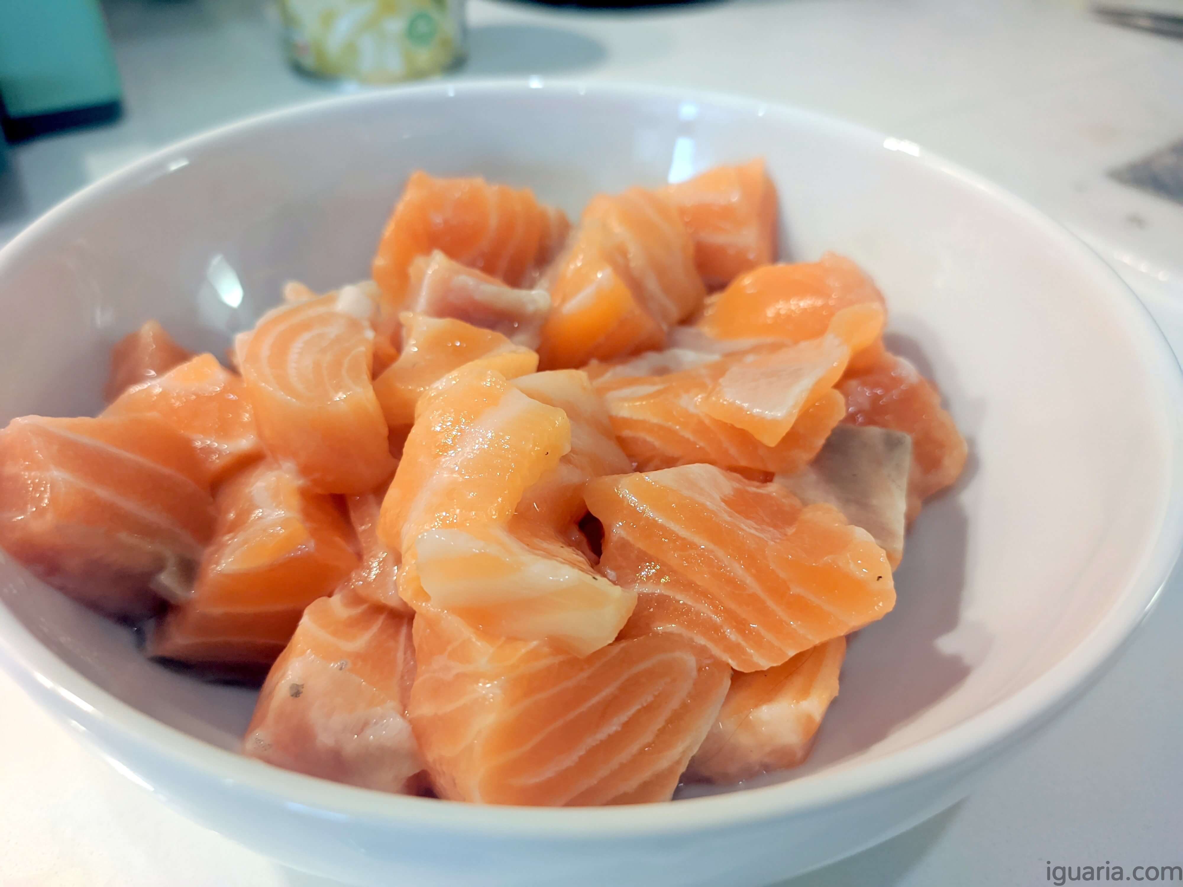 - Retira a pele dos lombos de salmão, e corta este em cubos de mais ou menos o mesmo tamanho, no meu caso os lombos eram grossos, por isso eu cortei os lombos em metades antes de cortar tudo em cubos, adiciona o salmão a tigela com a marinada, mistura bem, cobre com película aderente e leva ao frigorífico por pelo menos 15 minutos ao máximo de 1 hora (se deixares mais de 1 hora o peixe vai começar a cozinhar na marinada, logo em vez de peixe tenro e delicioso vais começar a ter peixe mole a desfazer, eu normalmente deixo uns 25 minutos).