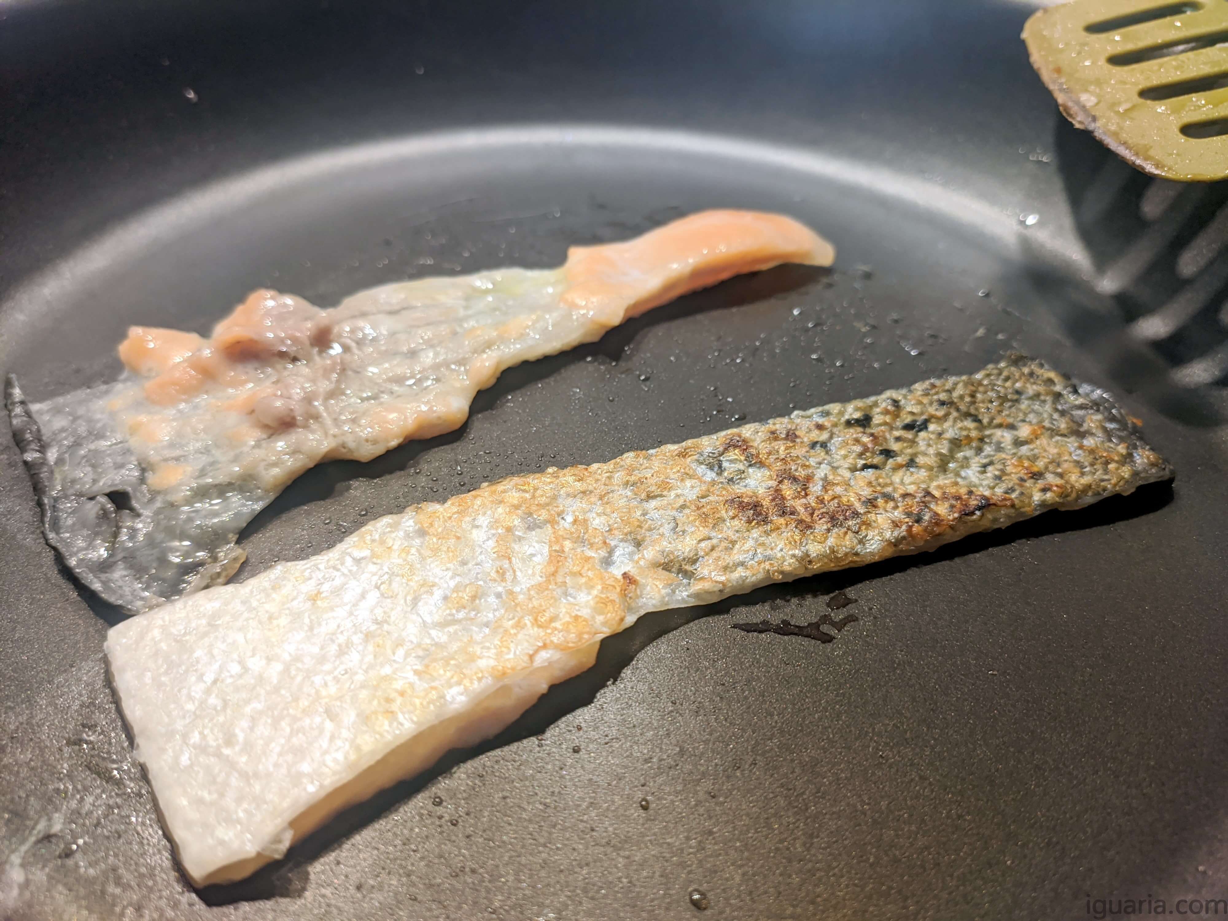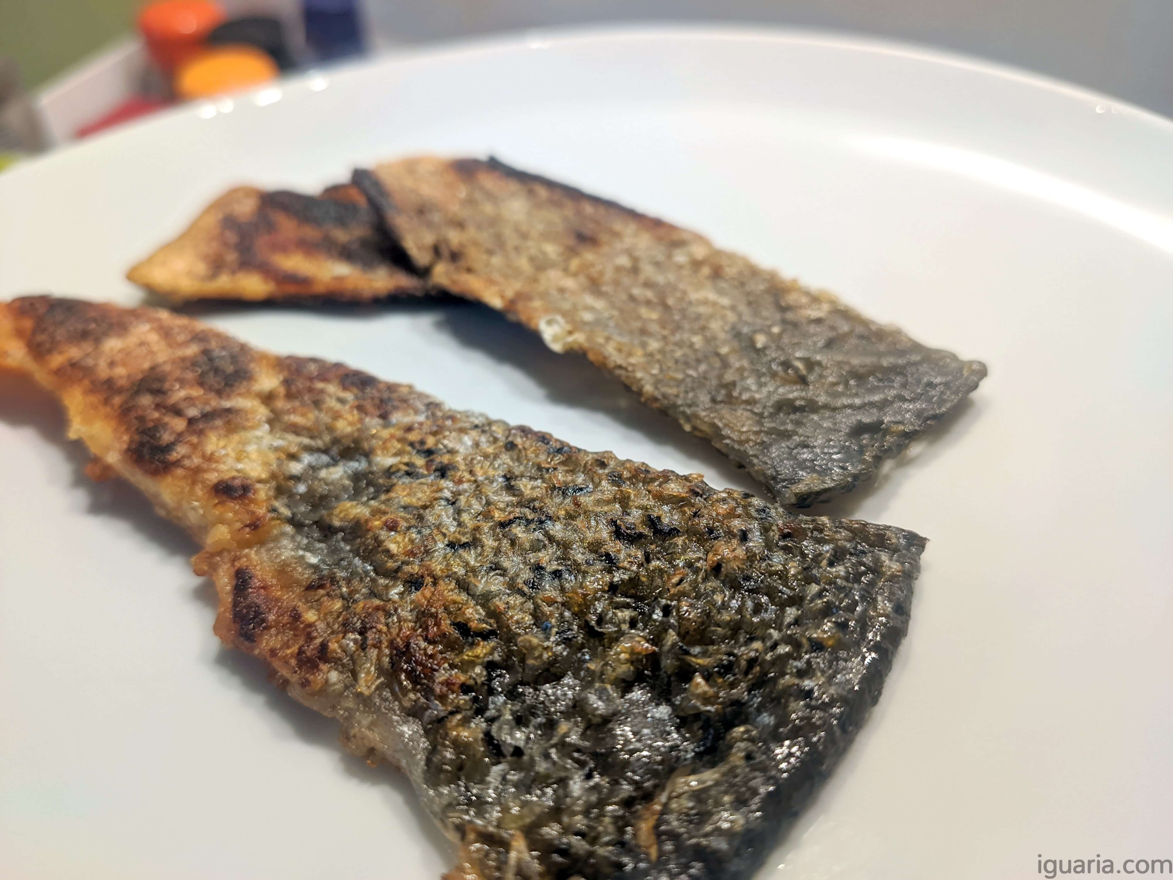 - Enquanto o salmão está a marinar, prepara a pele de salmão, numa frigideira anti-aderente leva põe a pele do salmão virada para baixo e cozinha em lume médio, normalmente vais fritar, virar a pele para render melhor a gordura e acabar por fritar a pele até ficar bem estaladiça, vai verificando tu queres dourada e estaladiça, não queimada, retirado do lume quando estiverem boas.