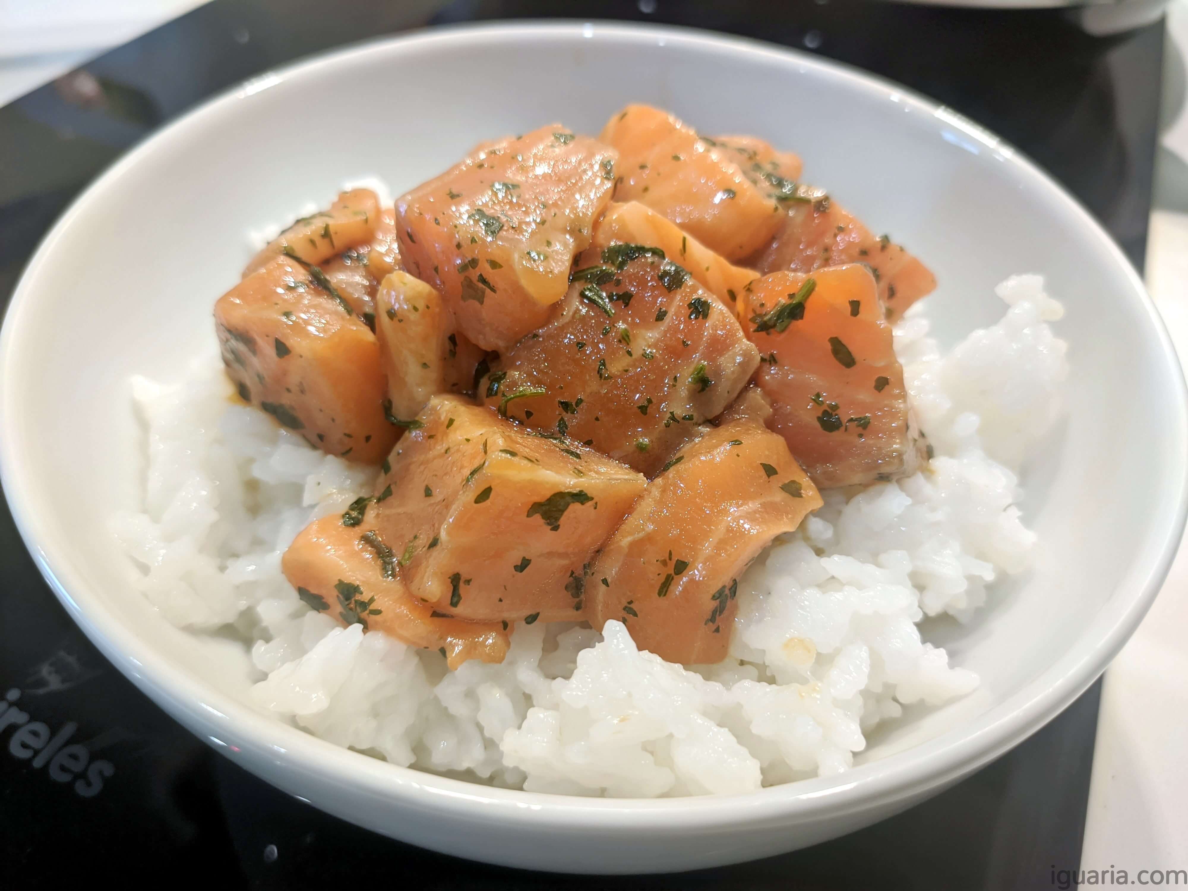 É comum servir um poke bowl com arroz de sushi, isto é um arroz de grão curto cozido e depois temperado com uma mistura de vinagre de arroz, açúcar e sal, mas neste caso eu fiz um arroz simples carolino que temperei com sumo de limão e manteiga.