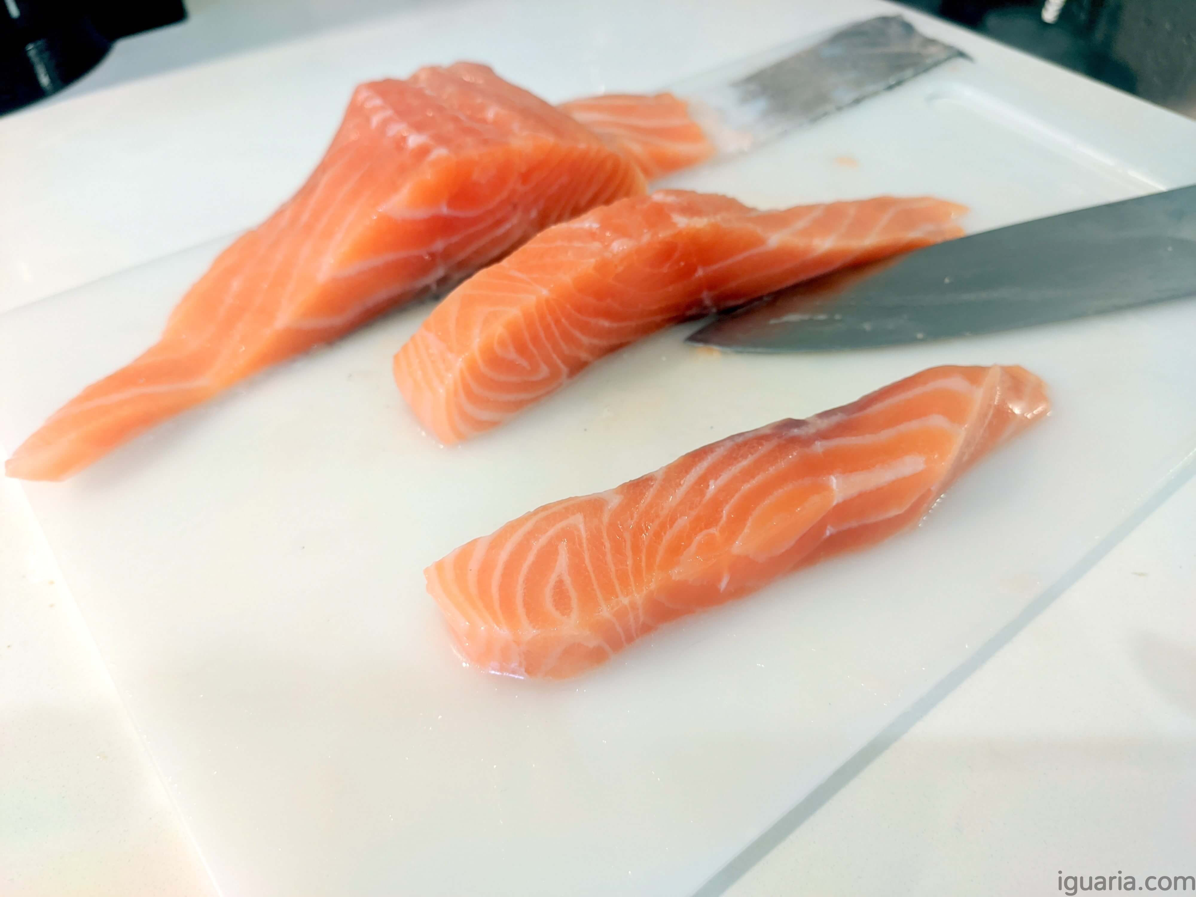 Uma vez fui a peixaria comprar um belo lombo de salmão e quando a peixeira retirou a pele sem me dizer, quase ativou o meu “Che Guevara” e eu estava a preparar-me para lançar uma pequena revolução hahaha, a culpa foi em parte minha eu reservei o salmão a dizer que queria um lombo grande para sushi, a ideia é que não existe necessariamente um selo de qualidade para peixe para sushi, mas o ideal é ir uns dias antes a peixeira e encomendar o peixe, assim este vai ver fresco e vai estar sempre guardado bem no frio da arca até a altura de ser cortado para ti, evitando ter sido cortado antes, ou estar exposto por várias horas no expositor. E claro na altura de encomendar dizer que é para fazer sushi, assim quando foi na altura de cortar o meu lombo a peixeira só queria facilitar a minha vida e retirou a pele num instante :D e sim, claro que eu trouxe o salmão, a pele e a espinha comigo hehehe da espinha podes usar uma colher de chá para raspar os pequenos pedaços de salmão e gordura de salmão que estão entre as espinhas e que são absolutamente deliciosos e depois usar a espinha para fazer caldo de peixe).