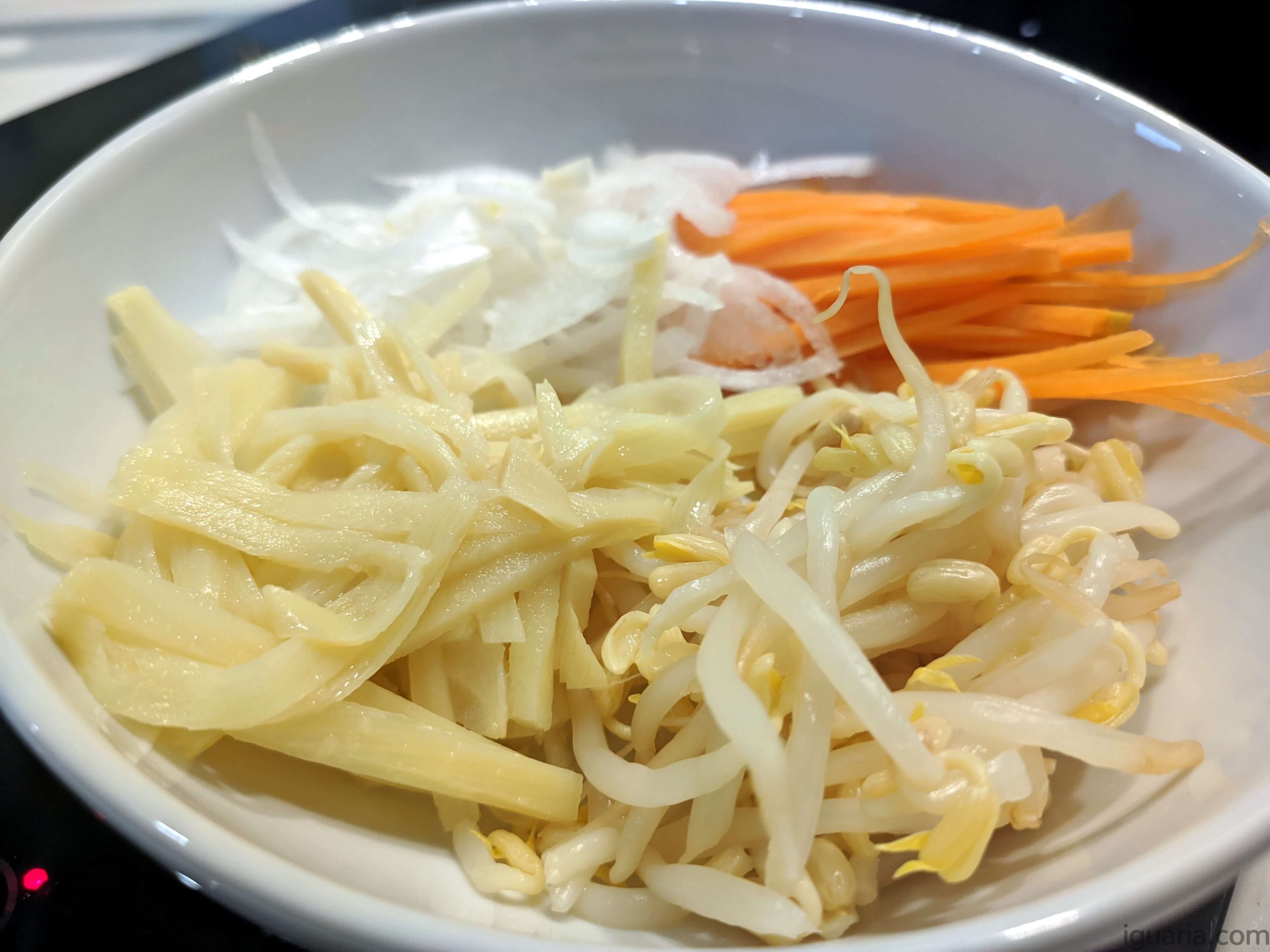 - Aproveita para cortar a cebola muito finamente, a cenoura e os rebentos de bambu em juliana, escorrer os rebentos de soja e cortar as folhas nori em retângulos mais pequenos.
