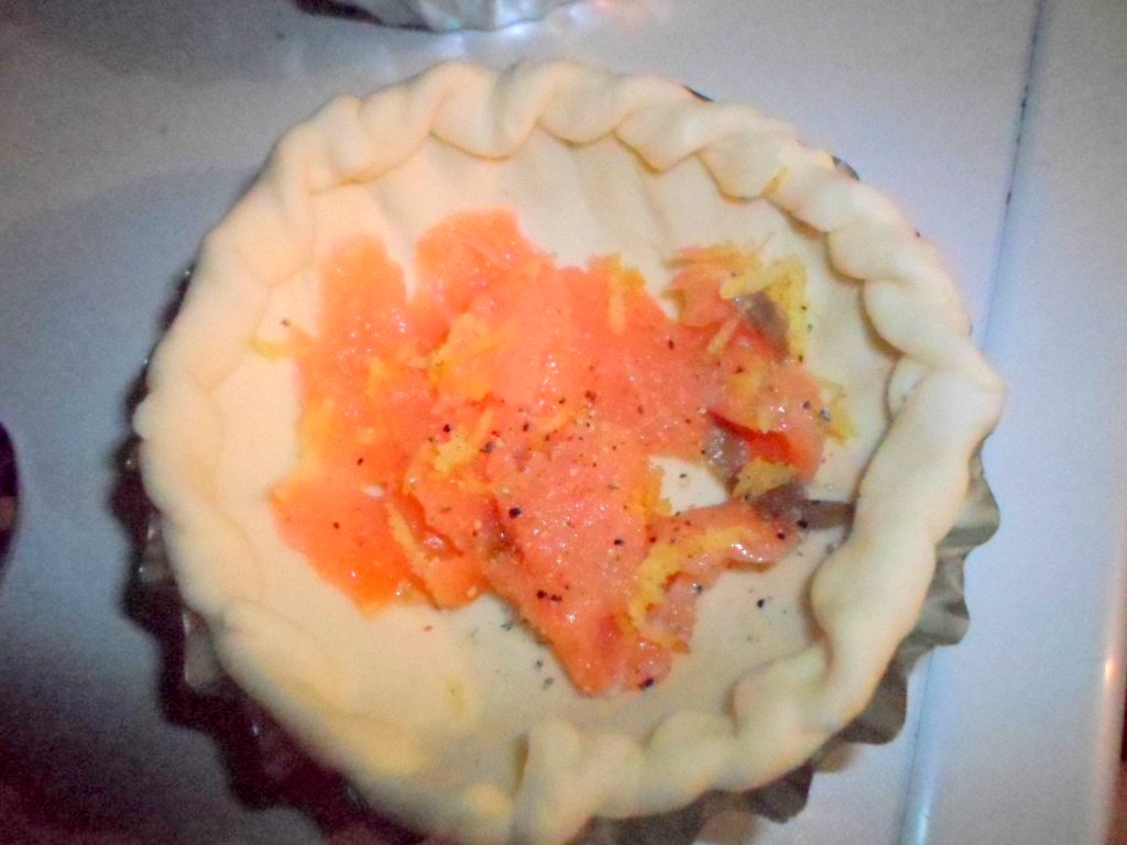 Para fazer estas tartes dá jeito teres forminhas ou formas de queques que podes forrar, de resto é só montar, temperar e levar ao forno.