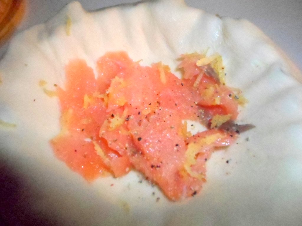 4. Corte bocadinhos de salmão fumado e coloque no fundo da forma. Tempere com pimenta e raspa de  limão.