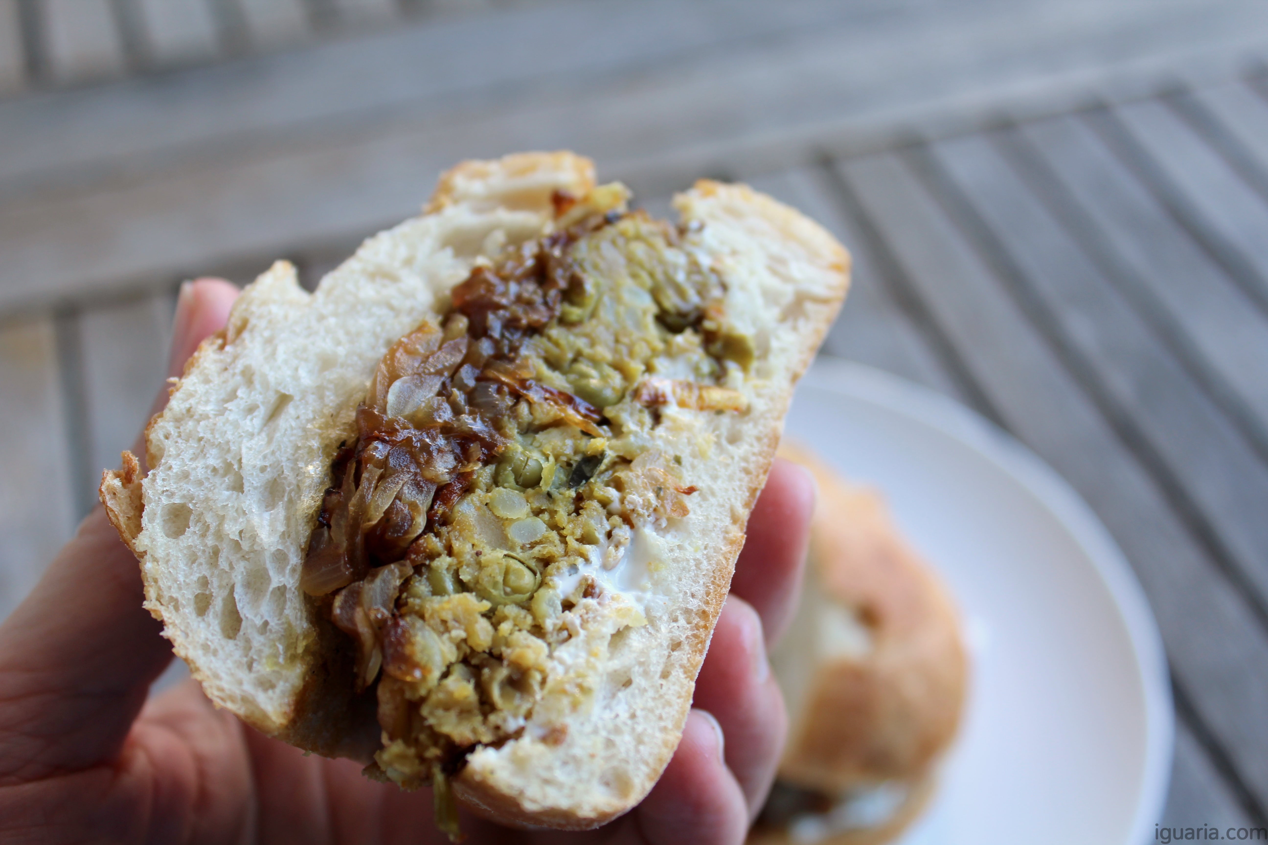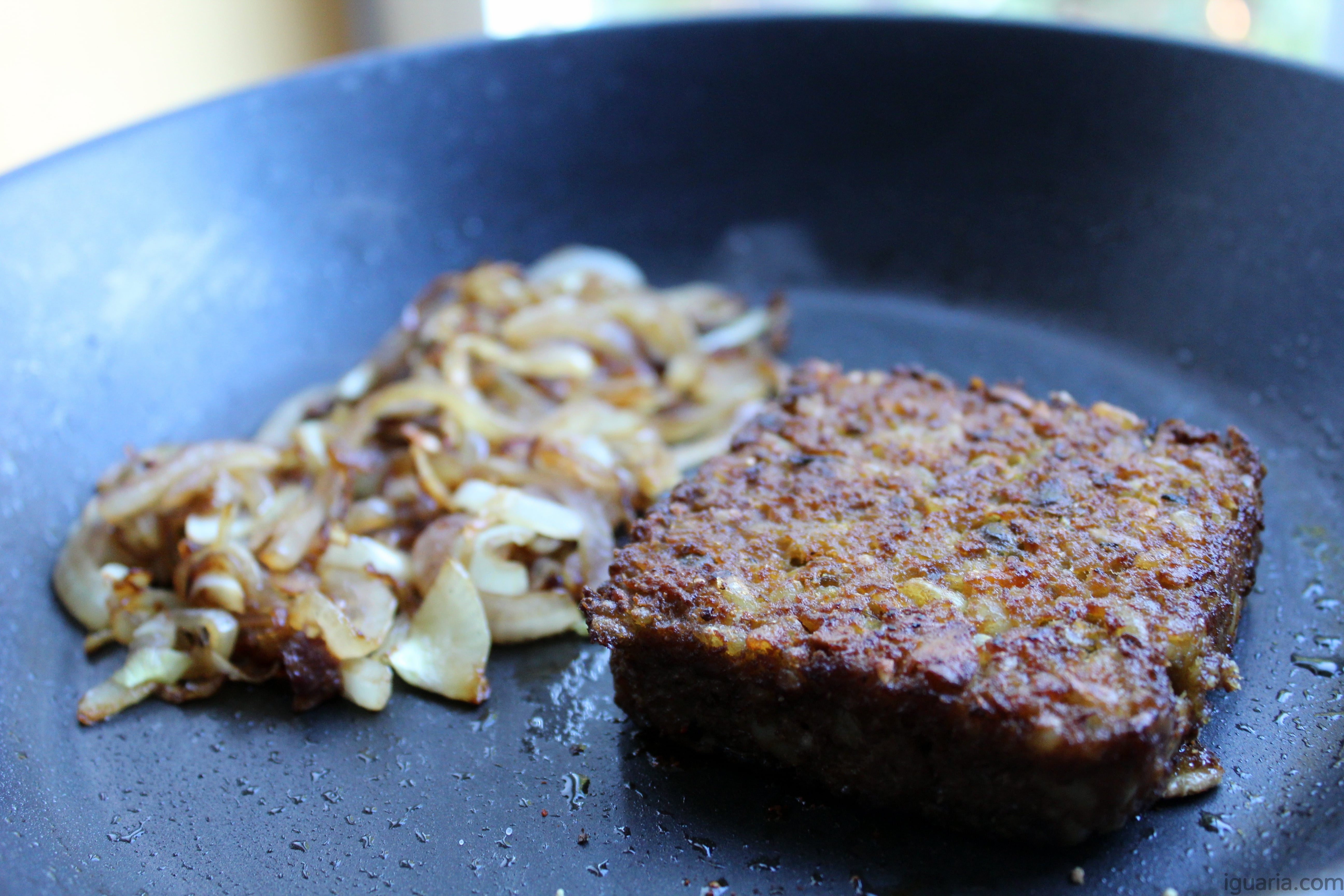 - Quando o hambúrguer de seitan estiver bem dourado e a cebola bem caramelizada, retira a frigideira do lume.