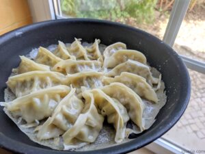 - De seguida deita uma colher de sopa de óleo de girassol numa frigideira num lume médio com uma tampa e enche a frigideira com as gyoza até estas cobrirem o fundo, frita por uns 3 minutos até começarem a dourar no fundo.