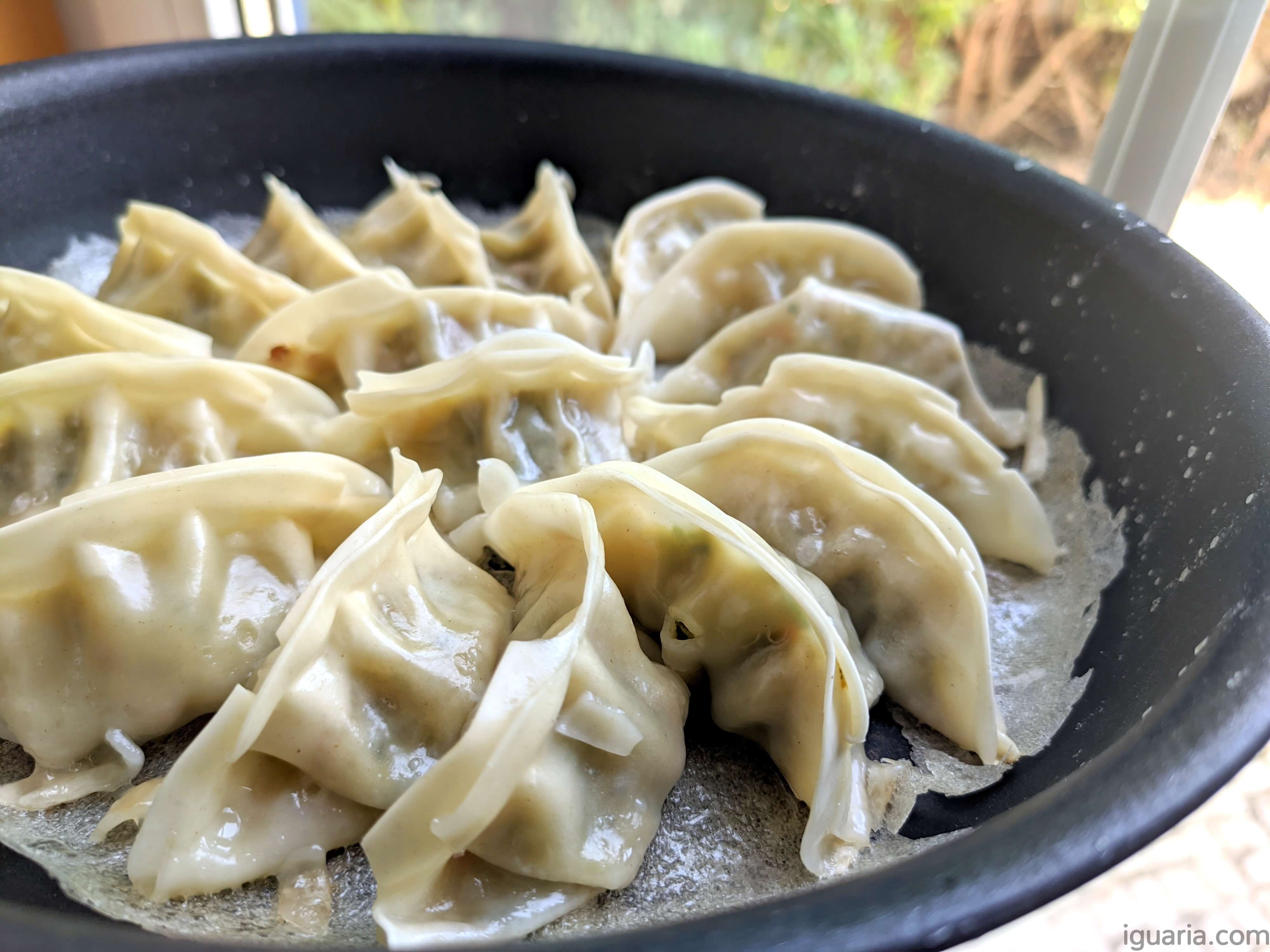 - Adiciona então esta mistura de farinha e água com as gyozas e tapa, deixa cozer em vapor por mais uns 3 minutos até a massa começar a ficar transparente, retira então a tampa e deixa fritar até evaporar toda a água do fundo e cada gyoza fique com o fundo bem dourado e estaladiço, retira então a frigideira do lume e dispõe as gyozas. Bom Apetite!