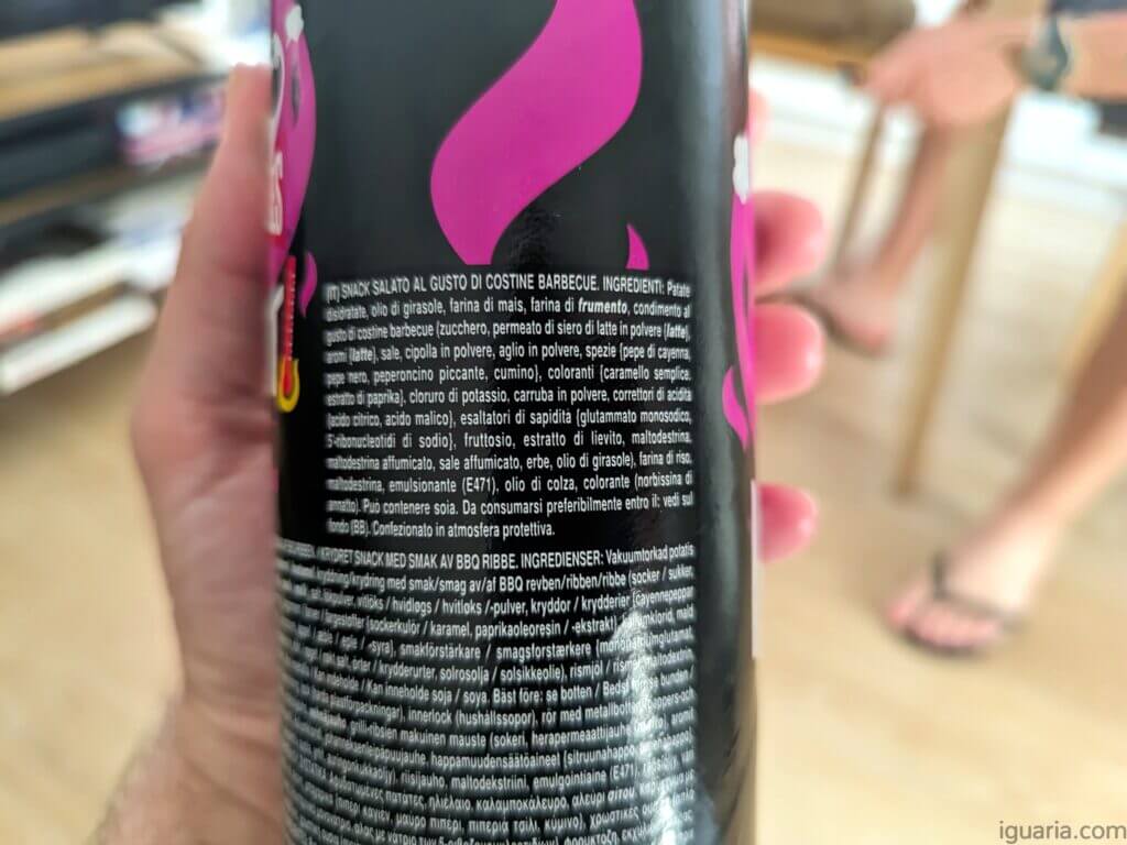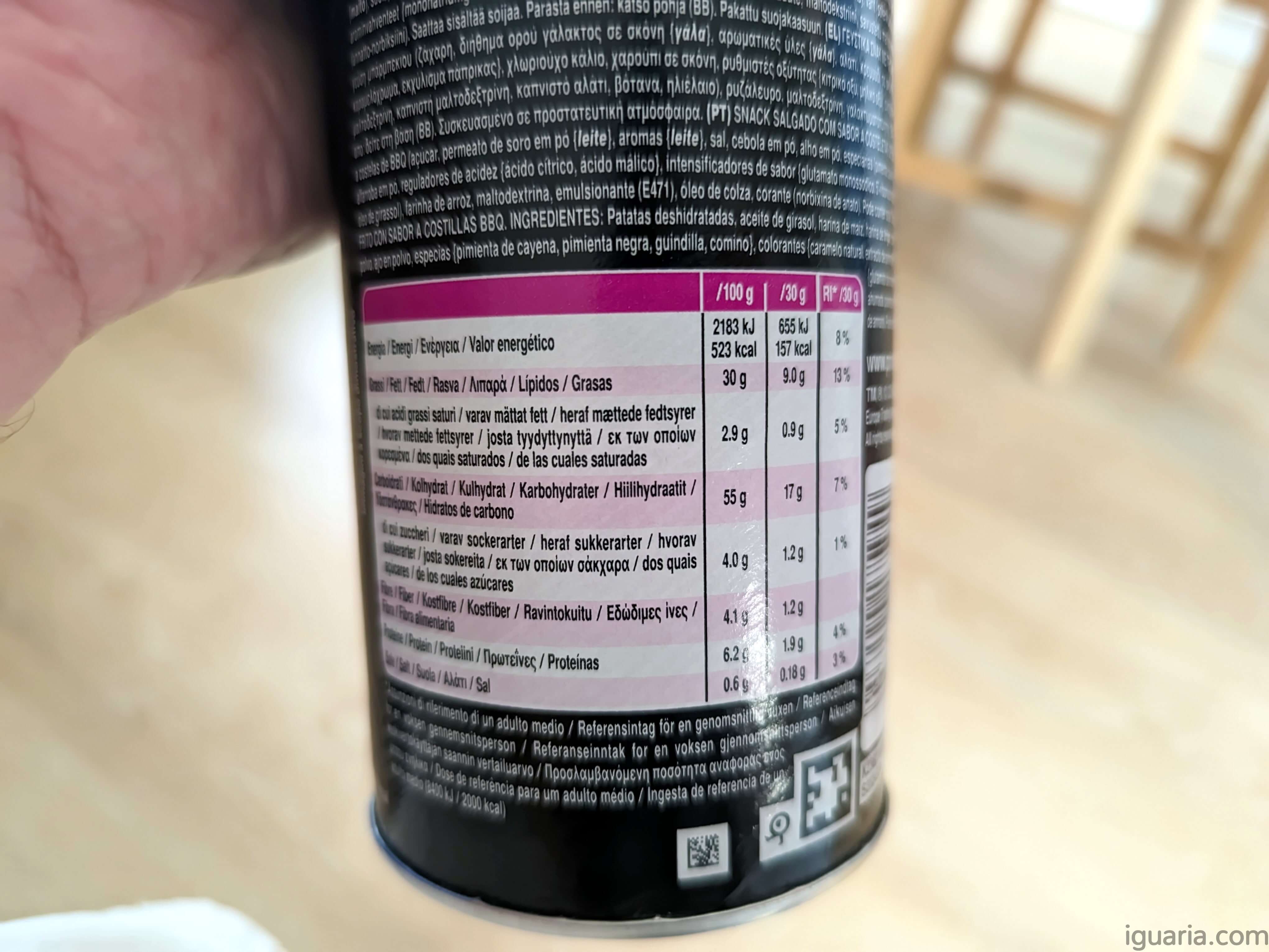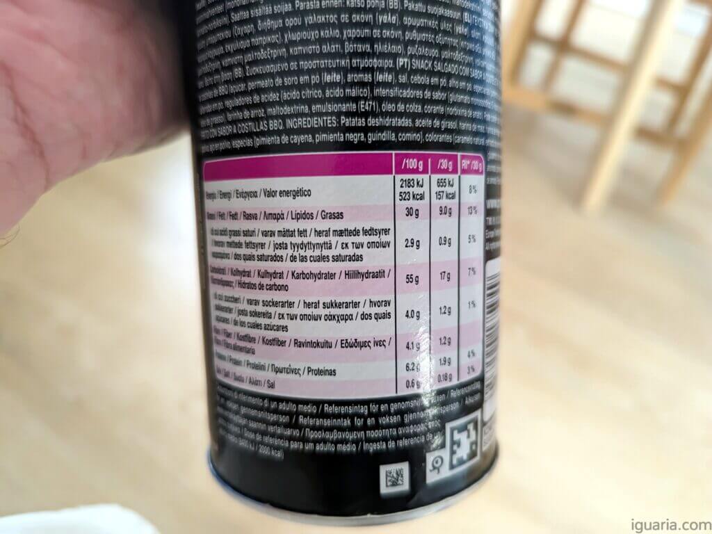 Os ingredientes são: Batatas desidratadas, óleo de girassol, farinha de milho, farinha de trigo, tempero com sabor a costelas de BBQ (açúcar, permeato de soro em pó {leite}, aromas {leite}, sal, cebola em pó, alho em pó, especiarias {pimenta caiena, pimenta preta, pimenta picante, cominho}, corantes {caramelo simples, extrato de pimentão}, cloreto de potássio, alfarroba em pó, reguladores de acidez {ácido cítrico, ácido málico}, intensificadores de sabor {glutamato monossódico, 5′-ribonucleótidos dissódicos}, frutose, extrato de levedura, maltodextrina, maltodextrina fumada, sal fumado, plantas aromáticas, óleo de girassol), farinha de arroz, maltodextrina, emulsionante (E471), óleo de colza, corante (norbixina de anato). Jesus cristo tantos ingredientes é um claro exemplo de um produto ultra processado! Com 523kcal por cada 100gr este é um produto altamente calórico que deve ser consumido com moderação.