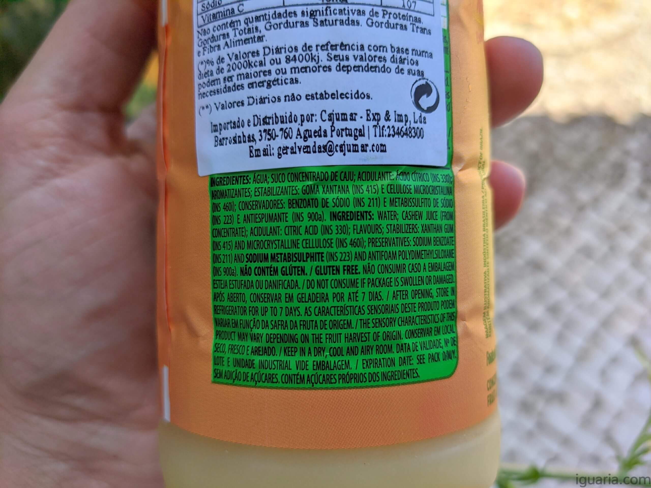 Os ingredientes para a versão de Caju são: Água, sumo concentrado de caju, ácido citrico, aromas, goma xantana, celulose microcristalina, benzoato de sódio, metabisulfito de sódio e antiespumante 900a. Com 24 kcal por cada 100ml.