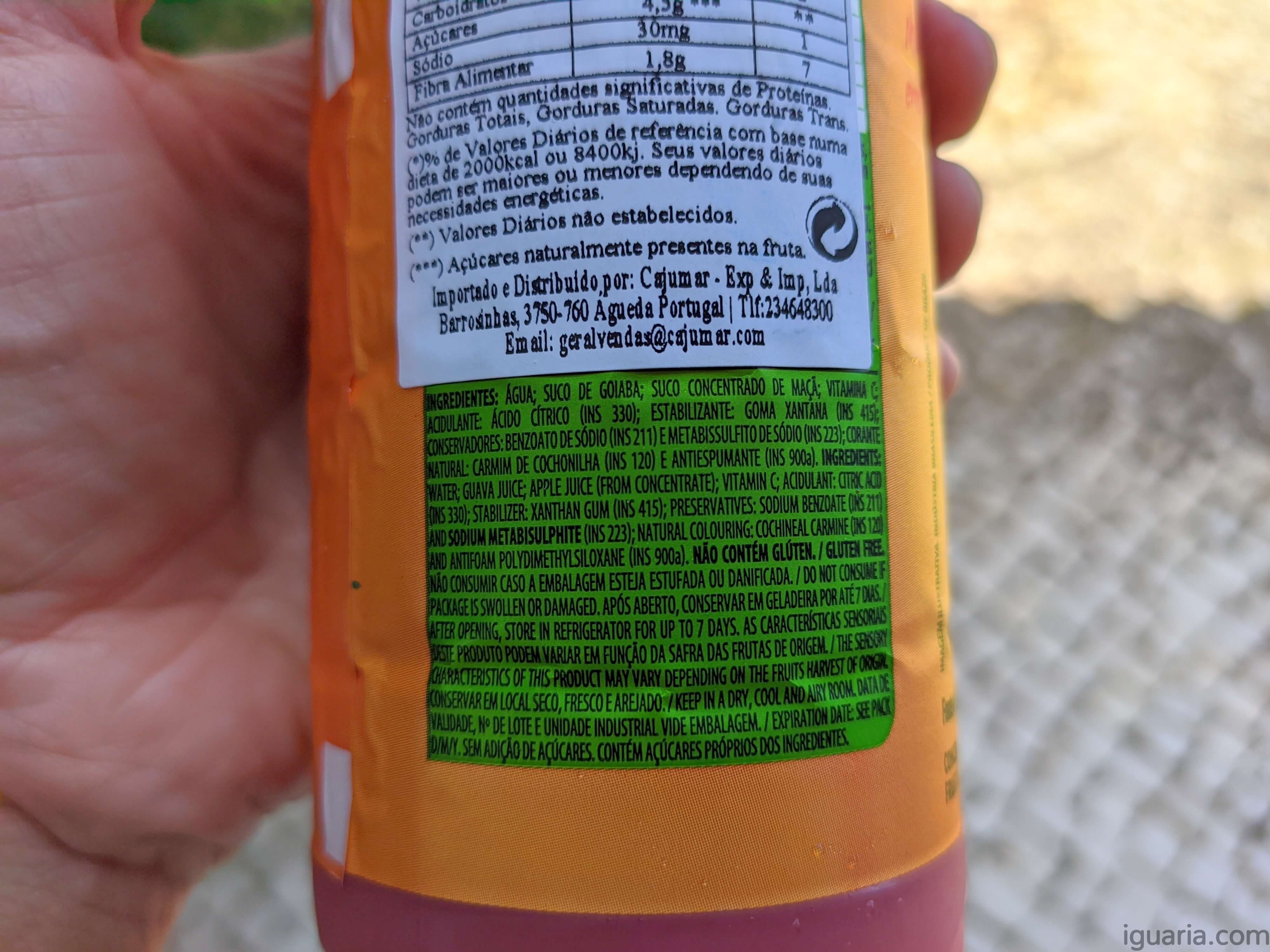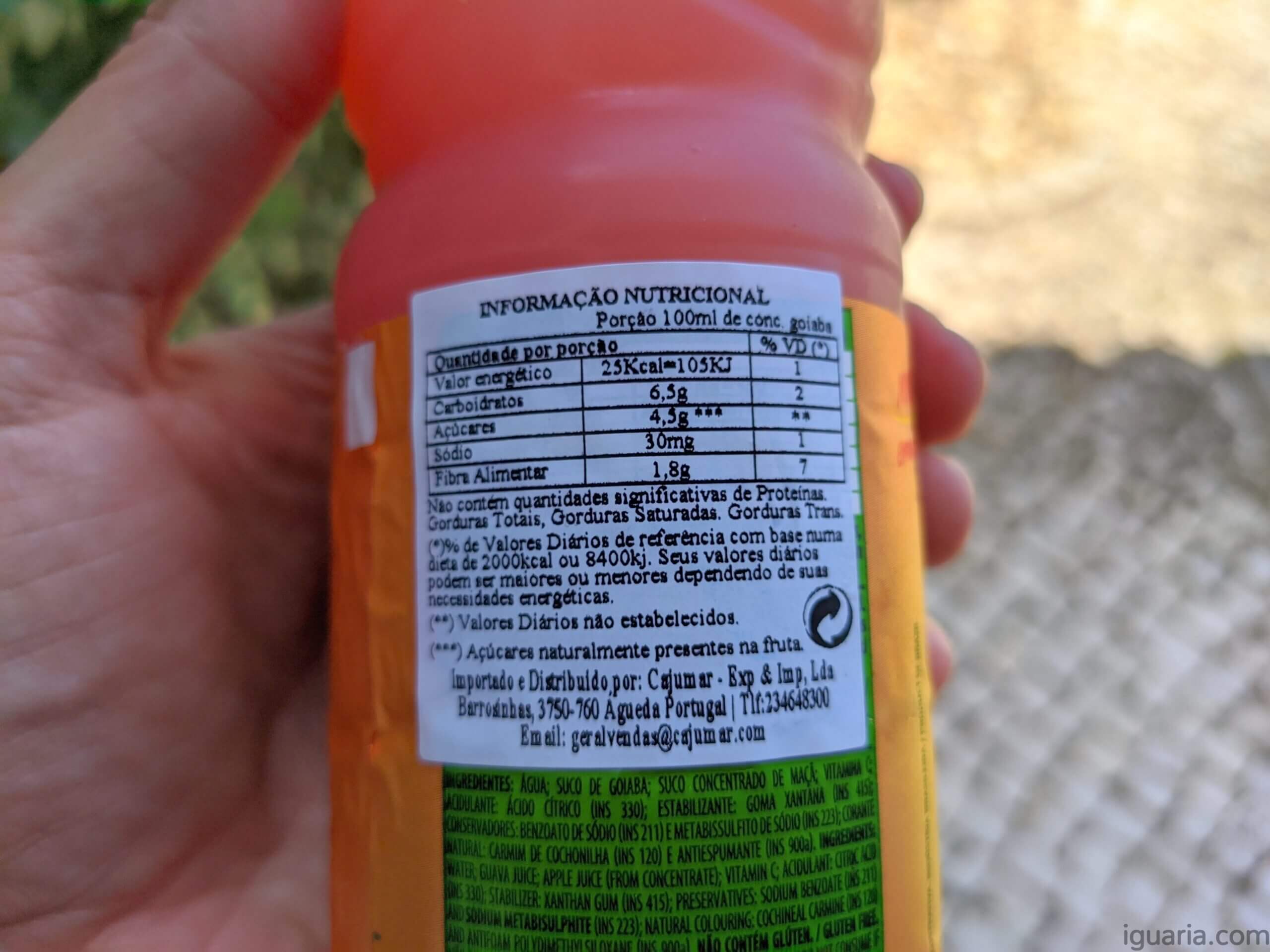Os ingredientes para a versão de Goiaba são: Água, sumo de goiaba, sumo concentrado de maçã, vitamina C, ácido citrico, goma xantana, benzoato de sódio, metabisulfito de sódio, carmin de cochonilha e antiespumante 900a. Com 25kcal por cada 100ml, ambos os produtos até têm muito poucas calorias para um produto concentrado, o que não quer dizer que deva-se beber á vontade, não deixa de ser um produto á base de concentrado com pouco valor nutricional e logo ambos devem ser consumidos com moderação.