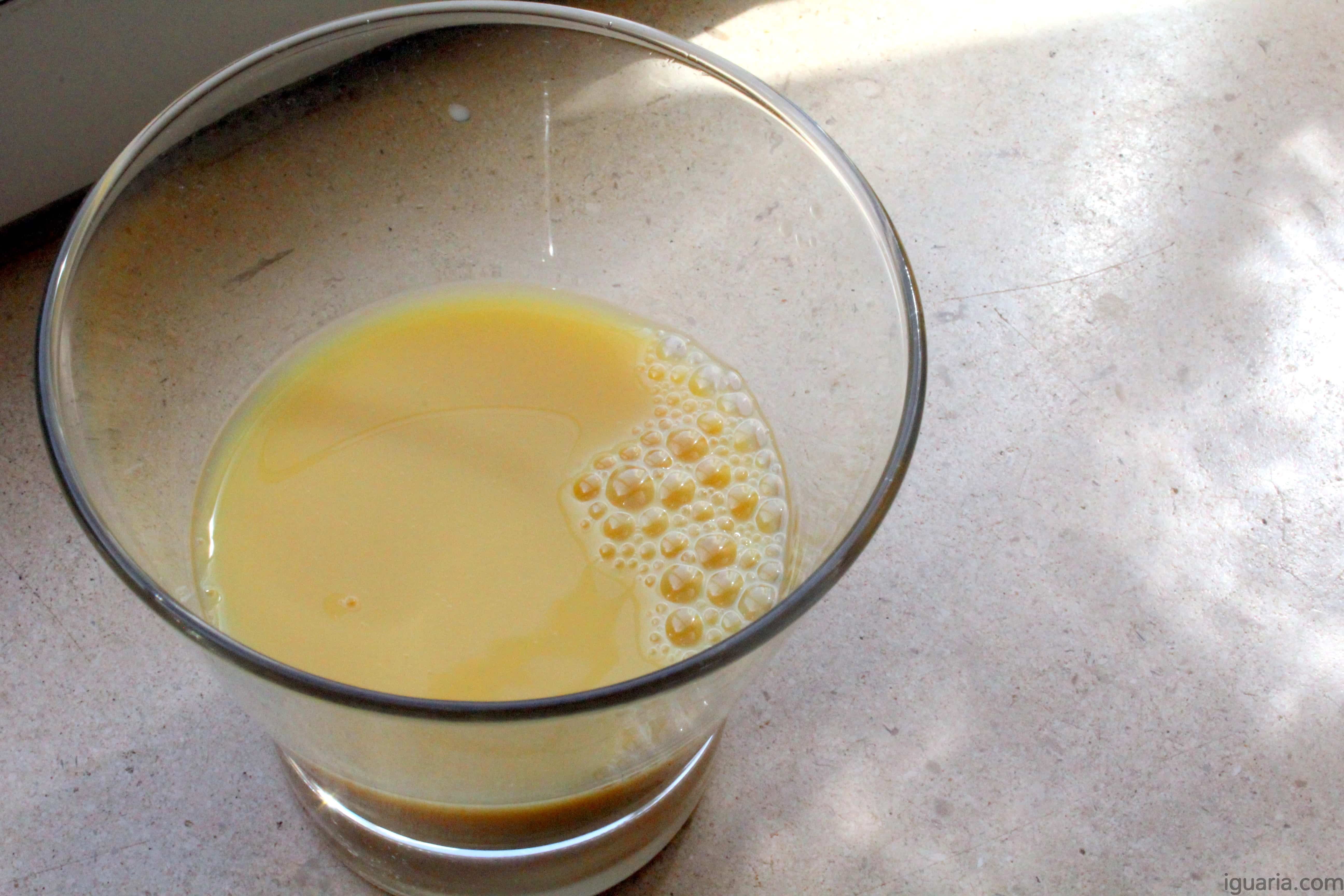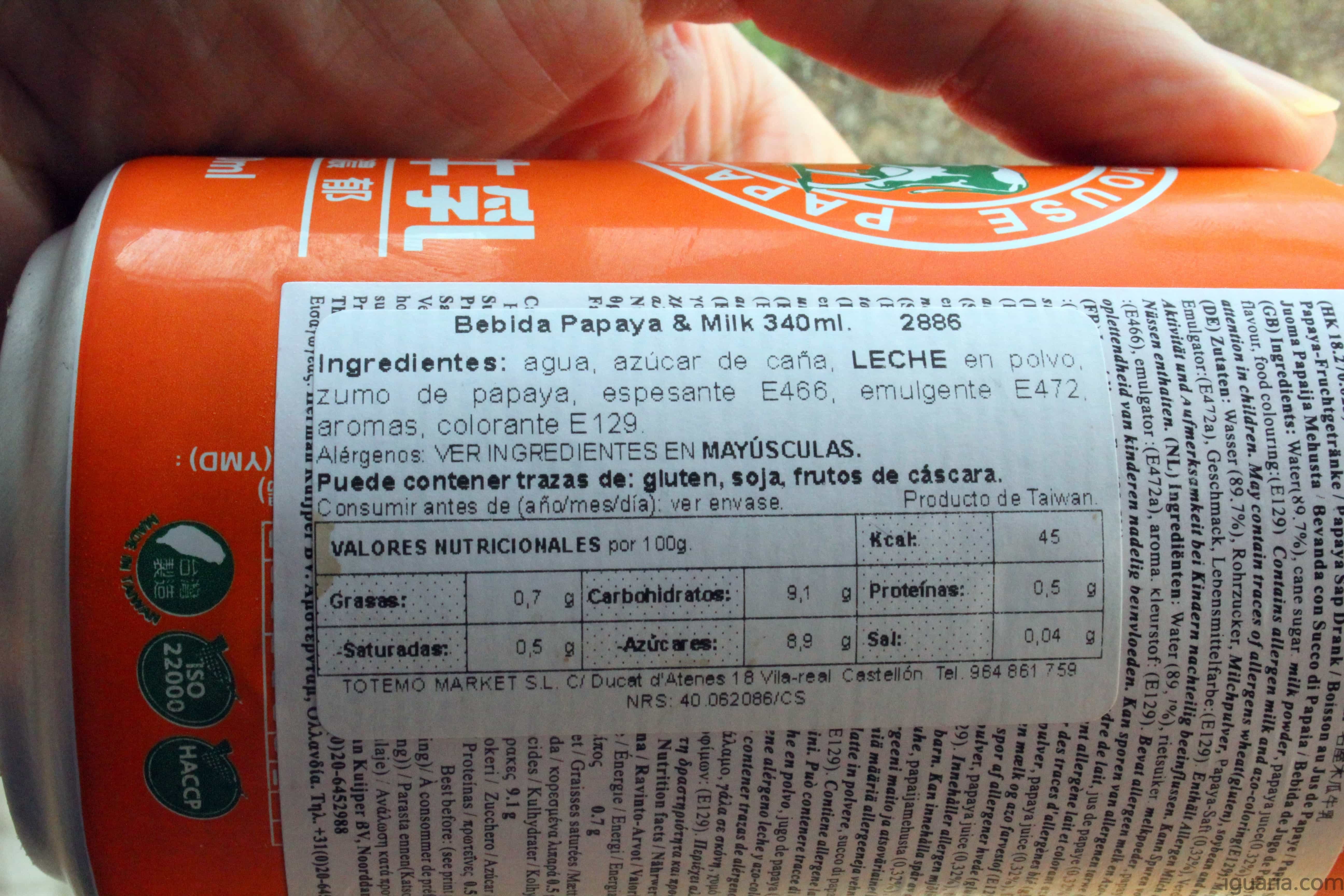 Os ingredientes são: Água, açúcar de cana, leite em pó, sumo de papaia, espessante E466, emulsificante E472, aromas e corante E129. Com 45kcal por 100ml é um produto com baixo nivel de calorias.