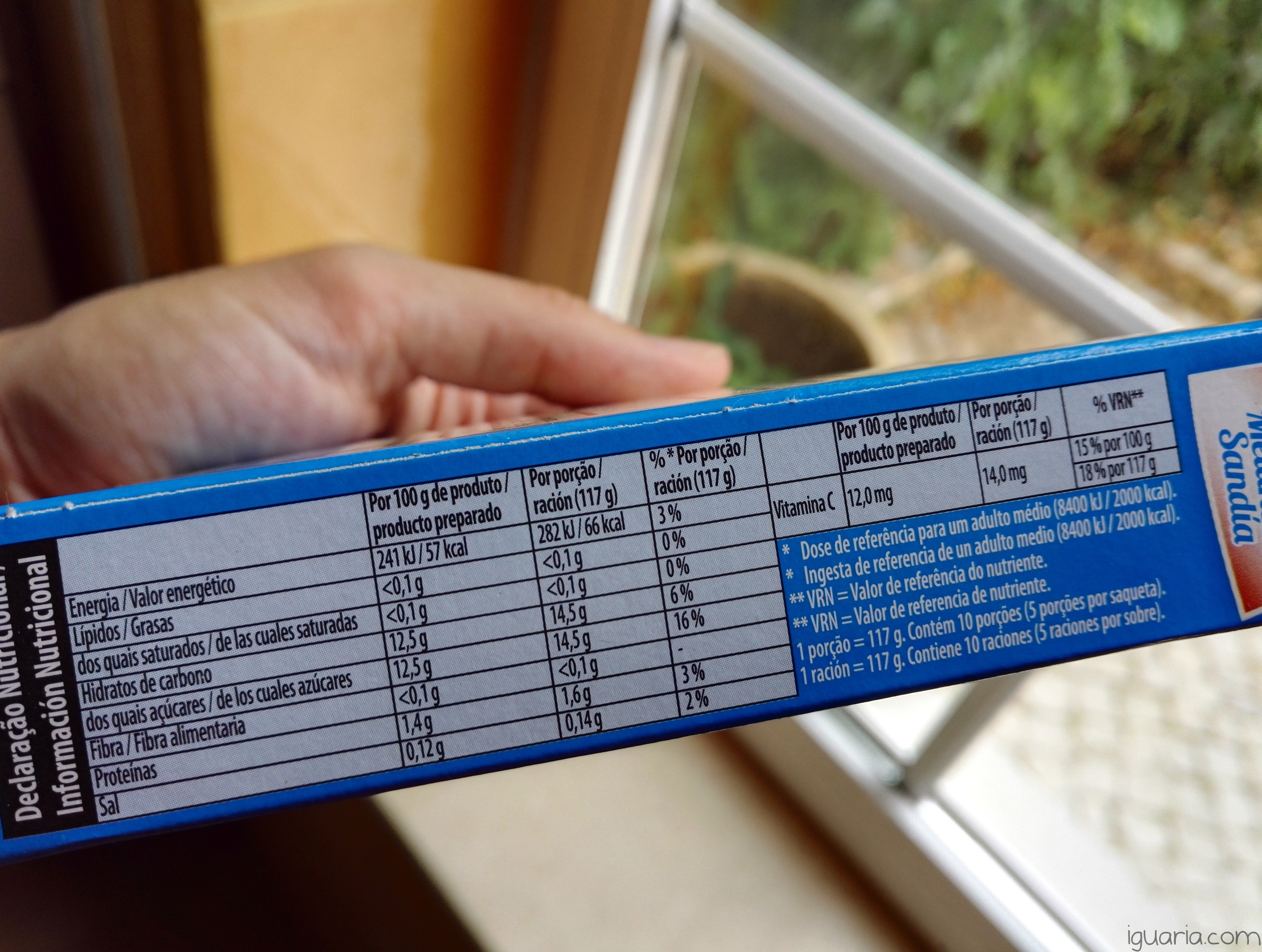 Os ingredientes são: Açúcar, Gelatina (11%), Reguladores de Acidez (Ácido Fumárico, Citrato Trissódico), Aromas, Vitamina C, Corantes (E-120, E-100). Como é normal em gelatinas o açúcar é o ingrediente principal, claro que depois de dissolvido com a água tem uma concentração mais baixa, mas não deixa de ser uma sobremesa baseada em açúcar e como tal deve ser ingerida com moderação.
