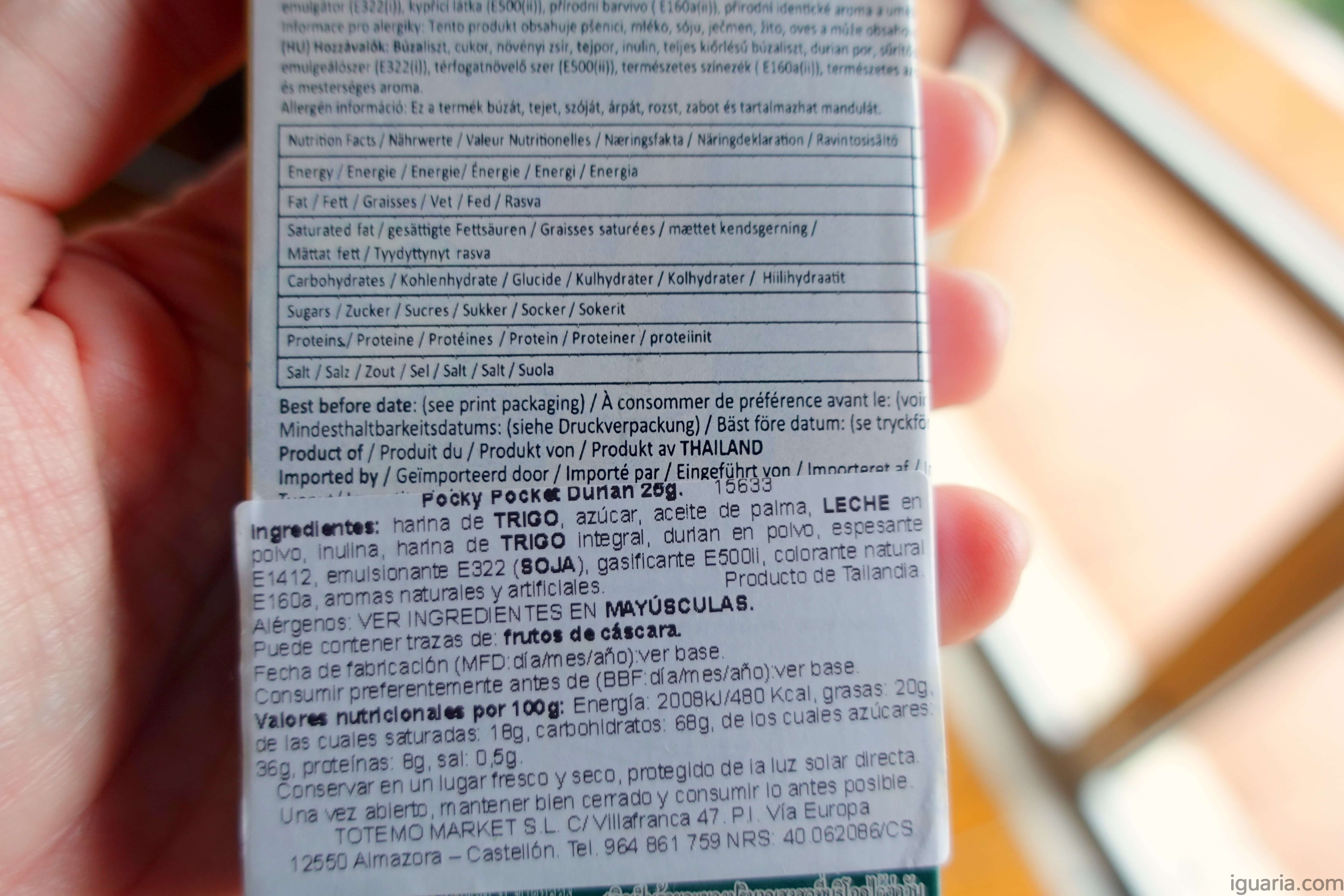 Os ingredientes são: farinha de trigo (36%), açúcar (21%), óleo vegetal (15%), leite gordo em pó (9%), lactose (7%), inulina (2%), gordura vegetal (2%), farinha de trigo integral (2%), pó de durian (1%), espessante (INS 1412), emulsionante, fermento e corante natural. Com 480 kcal por cada 100gr (mesmo que a embalagem inteira são apenas 25gr), este é claramente um produto calórico que deve ser consumido com moderação.