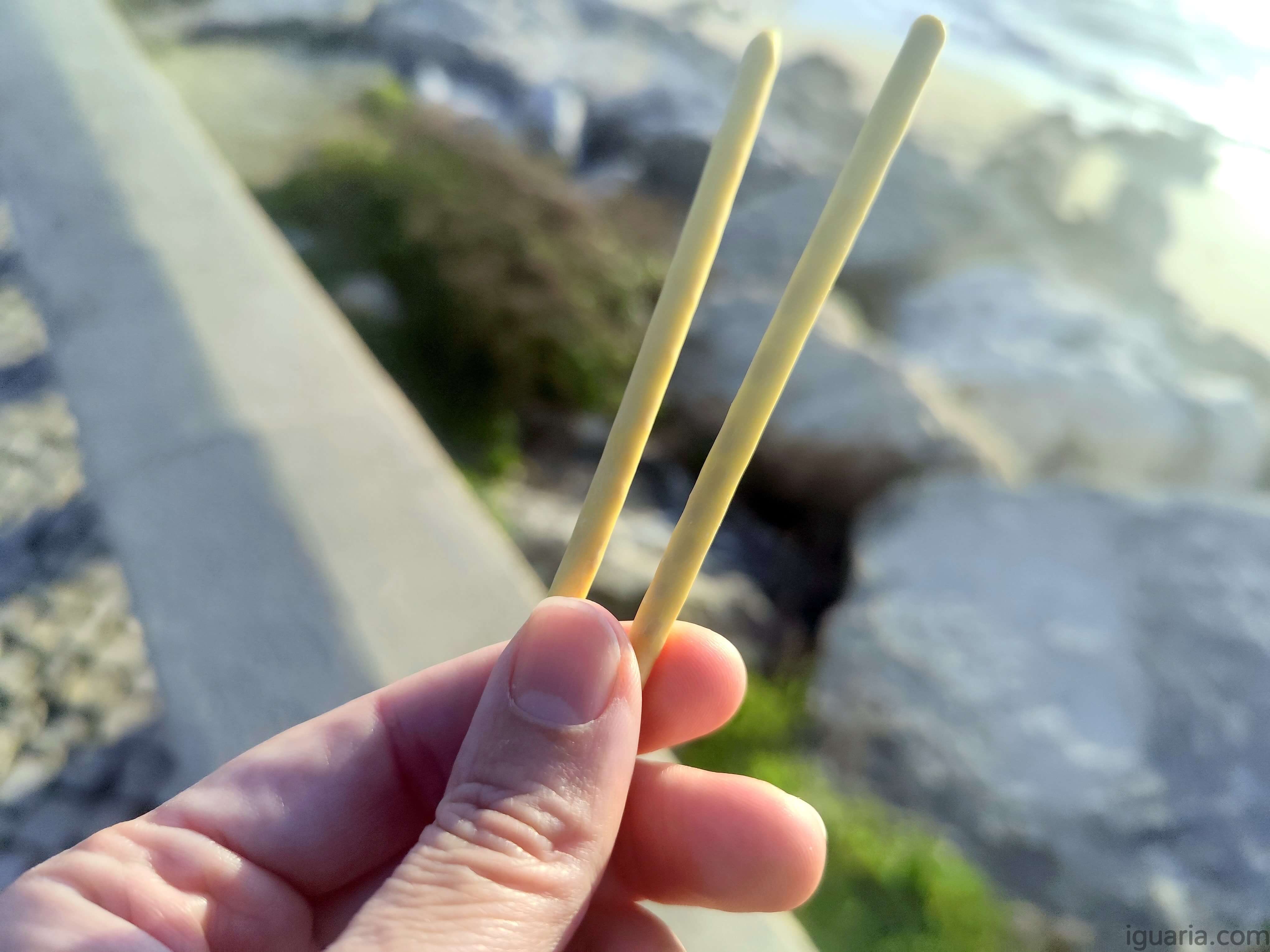 Não tem nada do cheiro dos durian, que aliás é o único problema, porque em sabor até é um fruto saboroso, eu diria que… estes Pocky Durian sabem como um Durian cheira hahahaha, eu explico o sabor é doce e floral com um ligeiro aroma “funk” no fundo, algo como queijo ou alho, mas muito ténue, porque o sabor é acima de tudo doce e floral.