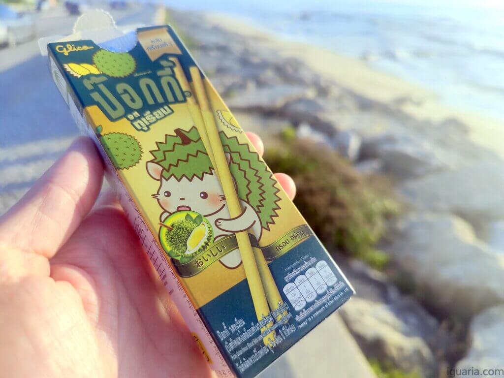 Também vi online que para estes Pocky eles usaram Durian Monthong, uma variedade de durian mais popular na Tailândia, também conhecida como “almofada dourada”, é a mais exportada e menos pungente do que as outras variedades tailandesas.