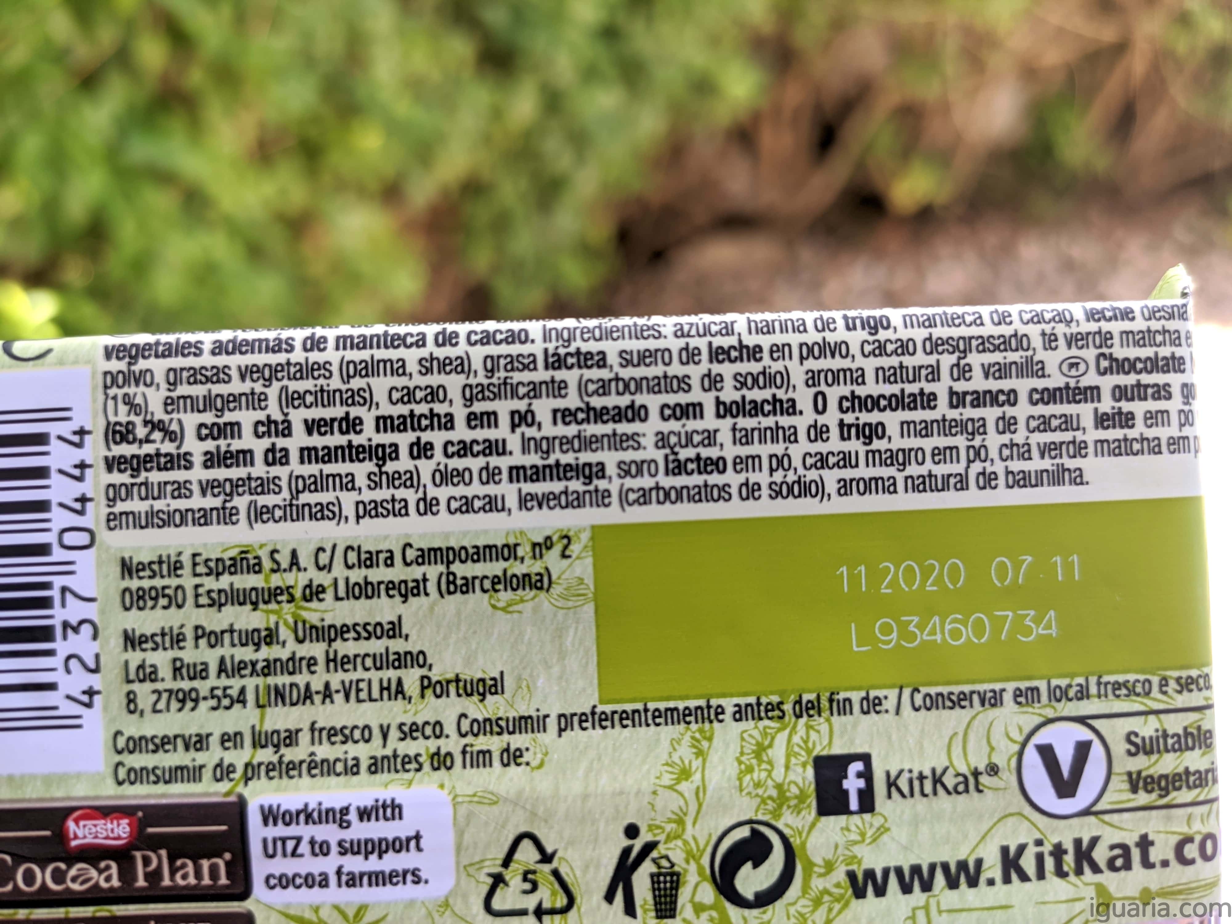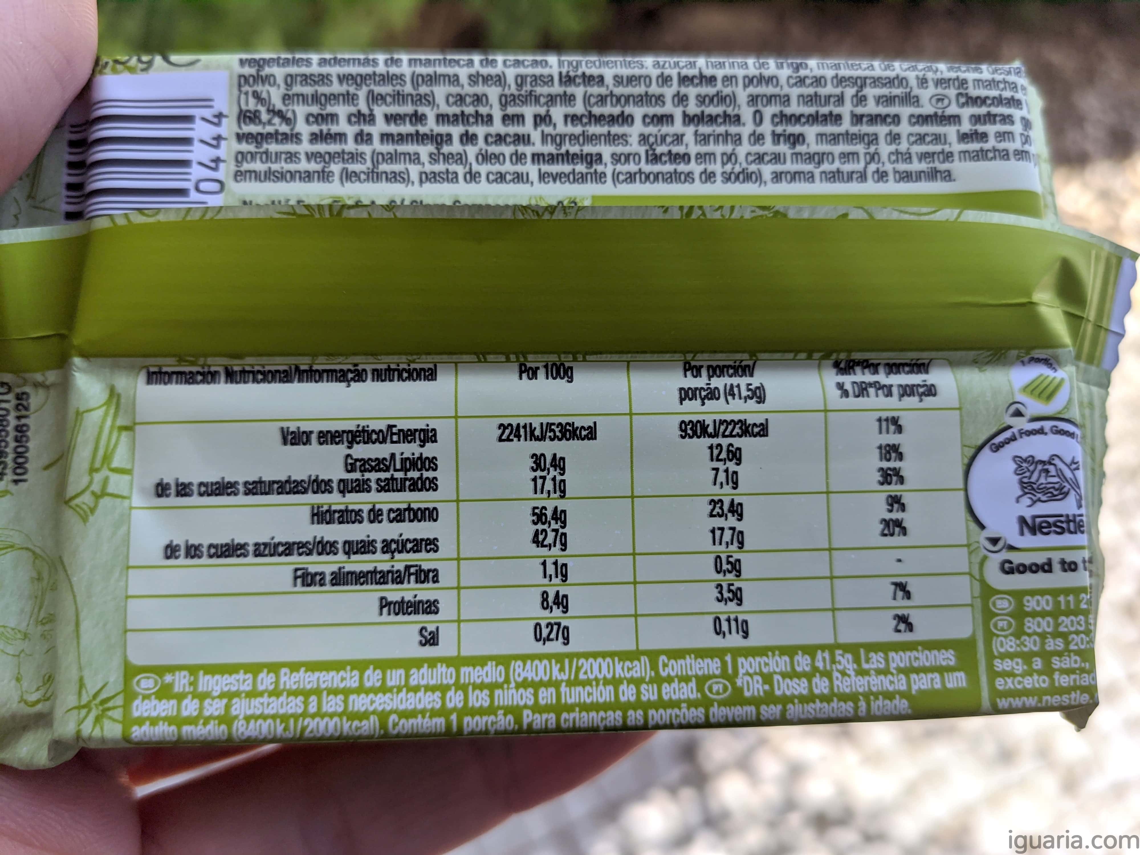 Os ingredientes são: Açúcar, farinha de trigo, manteiga de cacau, leite em pó, gorduras vegetais (palma, shea), óleo de manteiga, soro lácteo em pó, cacau magro em pó, chá verde matcha em pó, emulsionate (lecitinas), pasta de cacau, levedante (carbonatos de sódio), aroma natural de baunilha. Com 536kcal por 100gr claramente é um doce e como tal deve ser consumido com moderação.