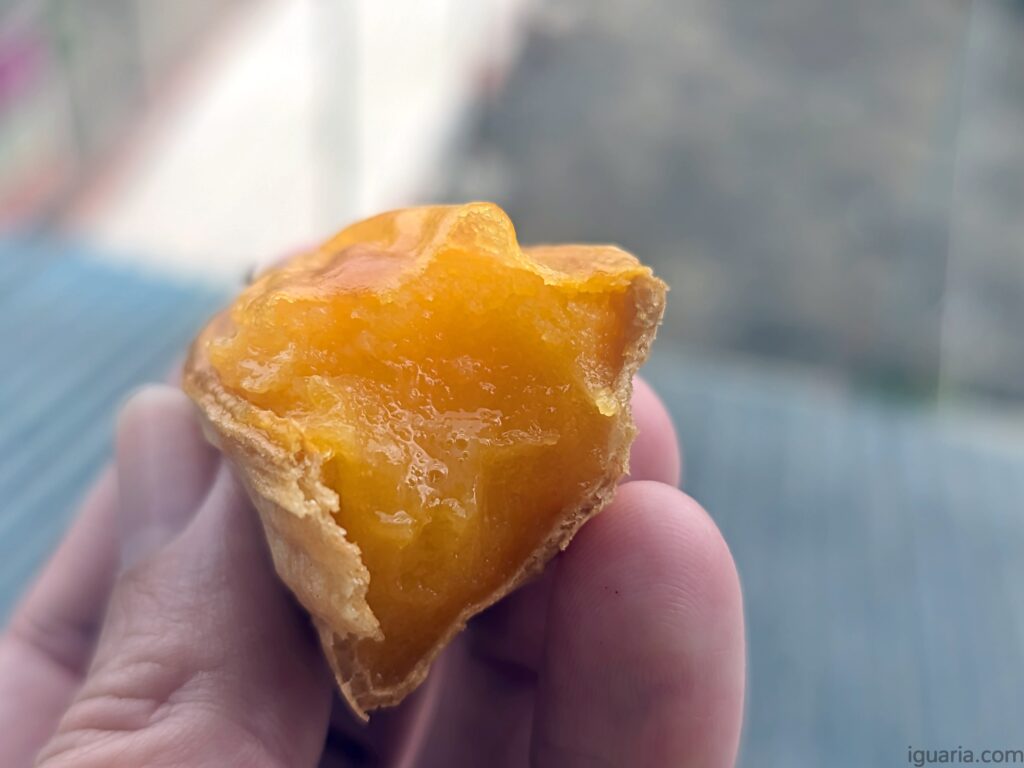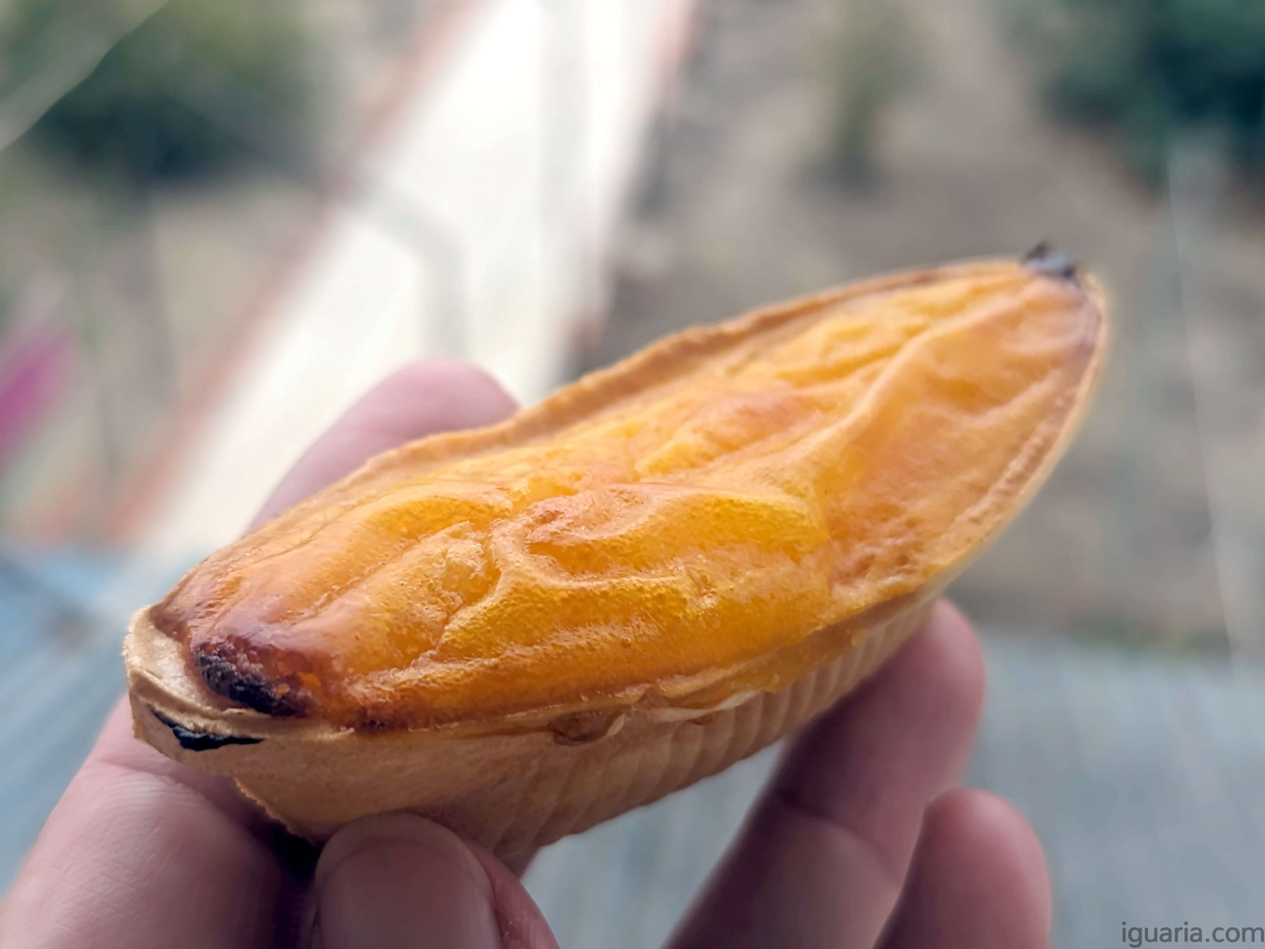Vamos ao que interessa, o sabor, sim é mais hóstia que bolacha, estaladiça, fina, sem grande sabor, é mais um “veículo” para os ovos moles ;D E claro no interior temos uns belos ovos moles, eu gosto da versão da Massas Vouga é denso e rico e não cortaram na quantidade, estes barquinhos estão absolutamente recheados.