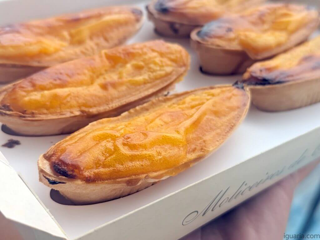 Ora então cá estamos com uns Moliceiros de Ovos Moles, este é um daqueles doces complementares aos Ovos Moles de Aveiro, que são servidos em pequenos barris, dentro de hóstias ou neste caso por cima de uma bolacha crocante no formato de um típico barco moliceiro de Aveiro, os famosos barcos da Ria de Aveiro, talvez o símbolo mais icónico de Aveiro, com as suas proas pintadas cheias de cor e … digamos trocadilhos heheheh, e vê-lo representado numa bolacha tipo hóstia recheada de ovos moles é uma bela fusão entre a cultura da cidade e a sua doçaria, estes são produzidos pelas Massas de Vouga em Sever do Vouga em Aveiro.