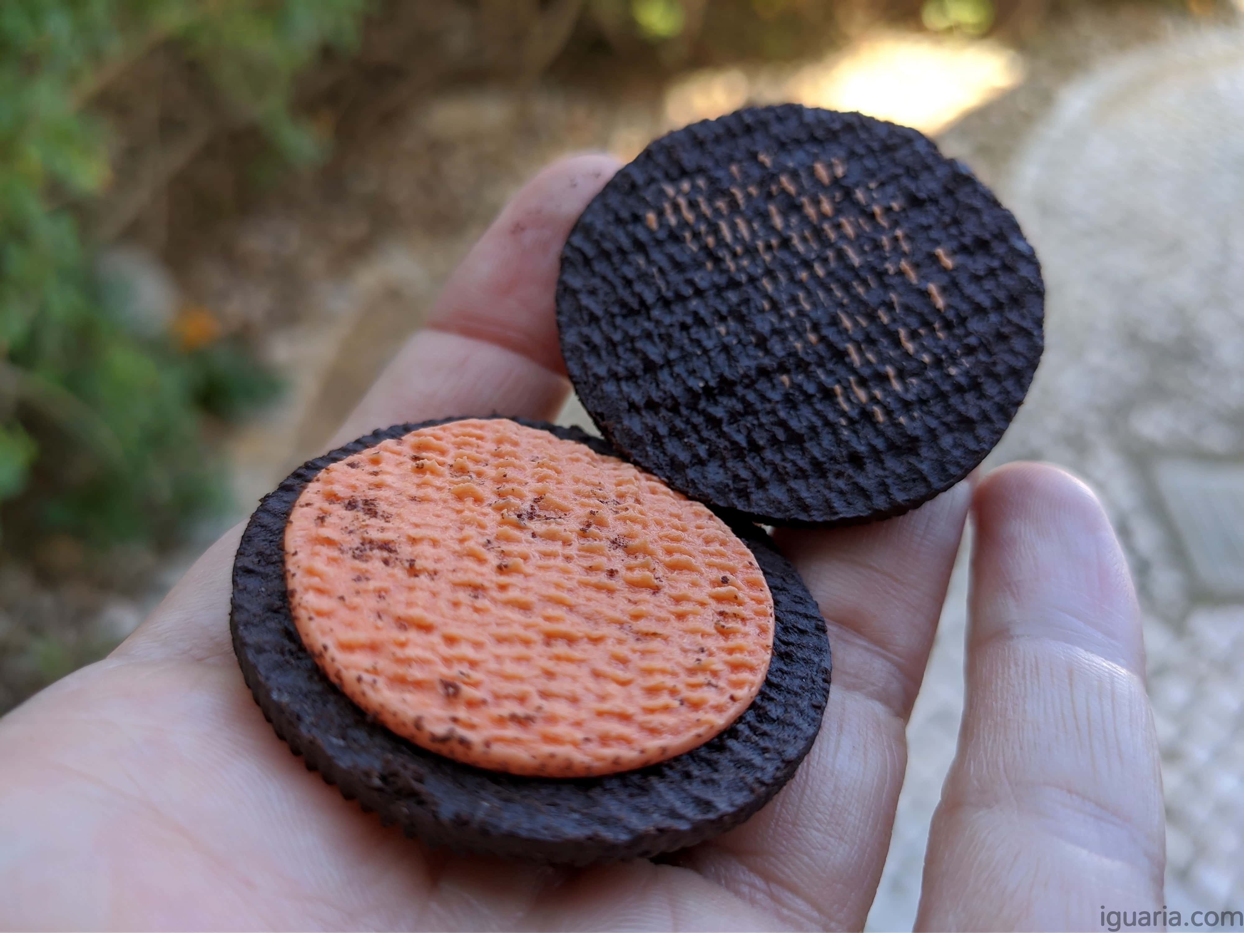 Vamos então as bolachas, em si muito similares as típicas oreos, a bolacha de fora mesmo tendo menos cacau que o pacote de oreo original sabia-me ao mesmo eu provei, e aliás das oreo eu até gosto da bolacha de cacau, tem um sabor intenso e pouco doce, por isso por vezes até uso num ou outro doce, o problema é sempre o creme.