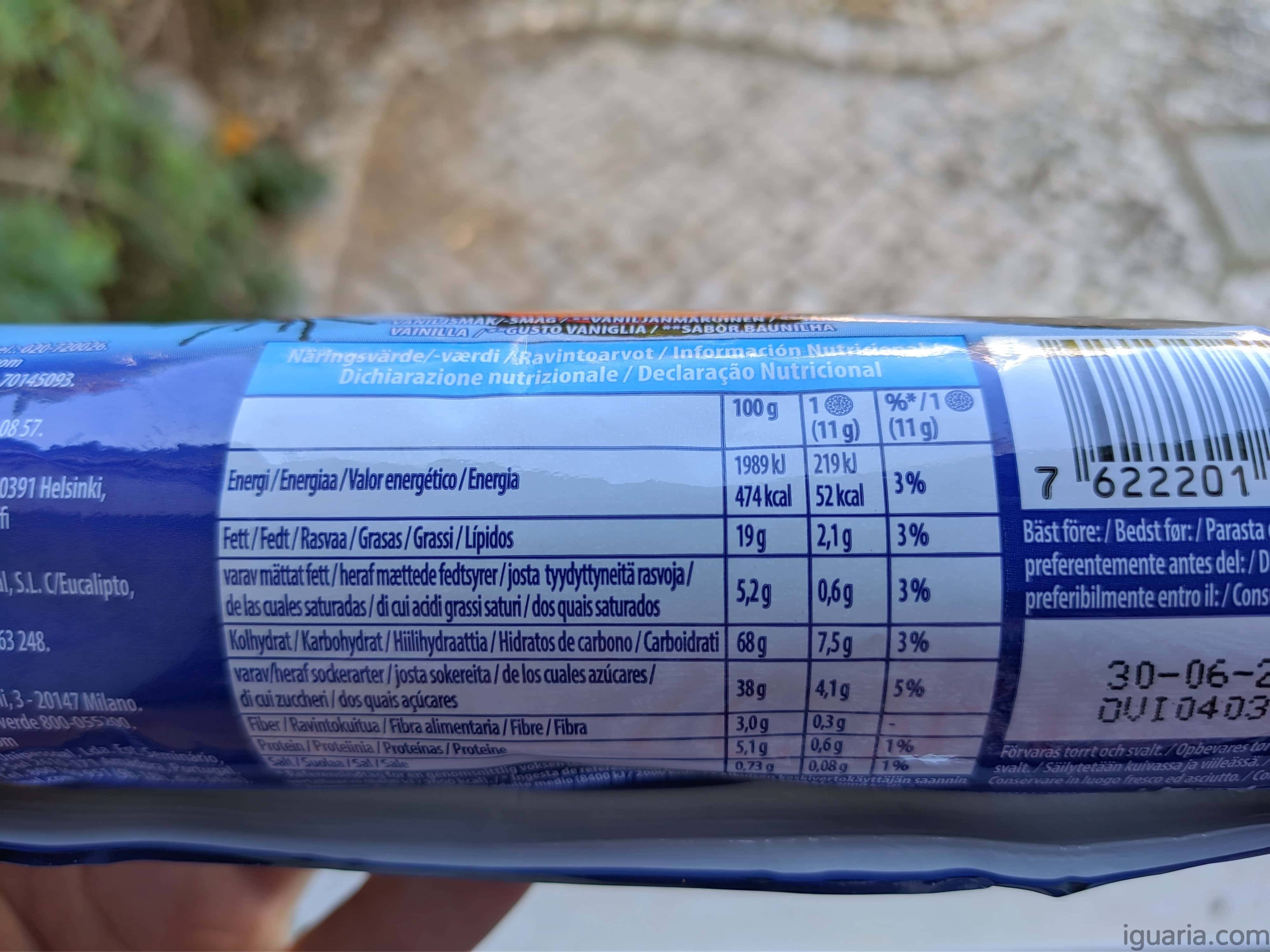 Os ingredientes são: Farinha de trigo, açúcar, gordura de palma, óleo de colza, cacau magro em pó 4,3%, amido de trigo, xarope de glucose-frutose, levedantes, sal, lecitina de soja, regulador de acidez hidróxido de sódio, concentrado de rabanete, aroma, corante extrato de pimentão. Com 474kcal por cada 100gr é um produto altamente calórico e deve ser consumido com moderação.
