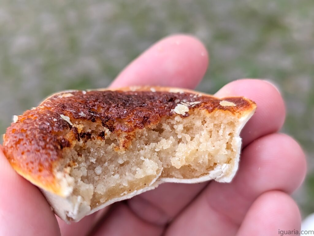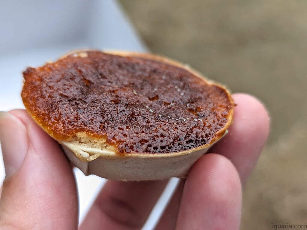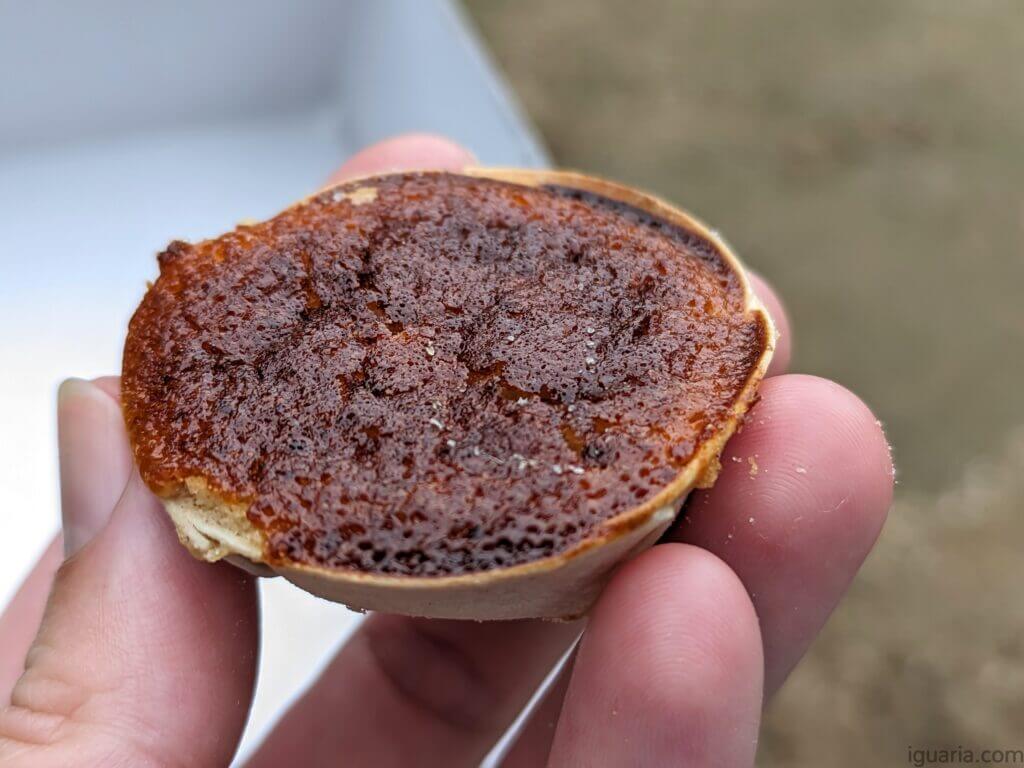A queijada em si é bem pequenina, cabe facilmente na palma da mão, tem uma base de massa fina e estaladiça bem rústica que serve quase como uma taça para o recheio. O topo está bem caramelizado quase preto, tudo junto é uma combinação deliciosa, doce, denso, crocante, cremoso com um ligeiro aroma agridoce é realmente um doce interessante.