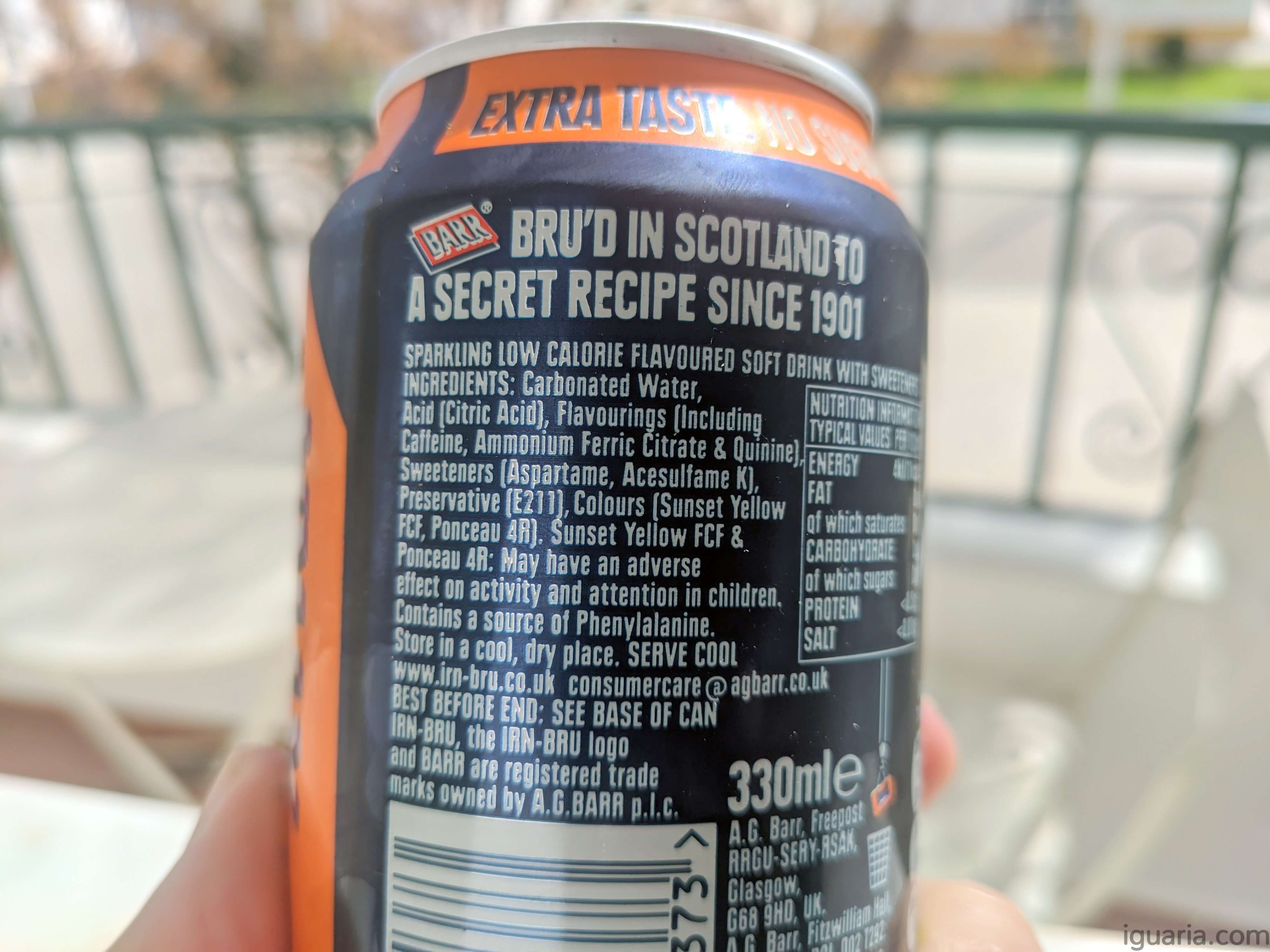 Então o que é o Irn Bru? Caso não conheças é o refrigerante oficial da Escócia, têm uma côr alaranjada como vês na lata e tem um sabor algo entre uma coca-cola com toques de rebuçado de limão é um aroma interessante, produzido na Escócia desde 1901 com uma receita… uhhhh secreta, então o que é esta versão Xtra, bem é a versão sem açúcar heheheh, mas a Irn Bru apenas diz que têm “extra” sabor, claro produzido pela A.G. Barr na Escócia.