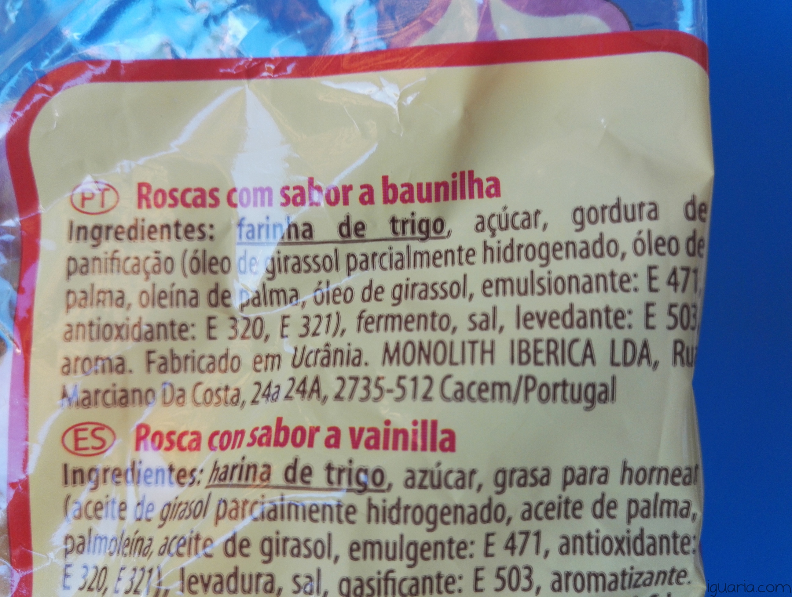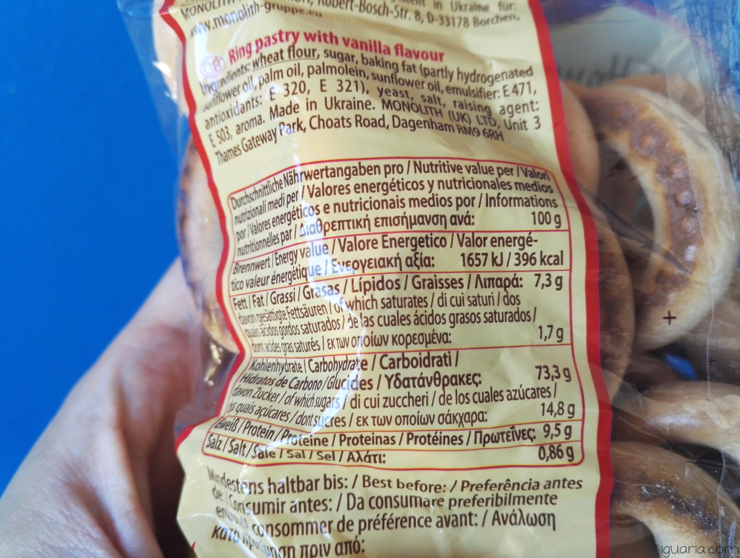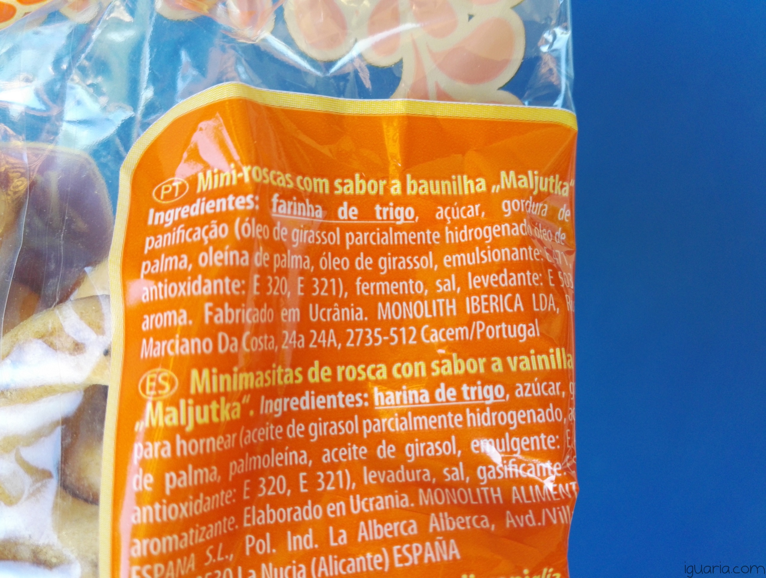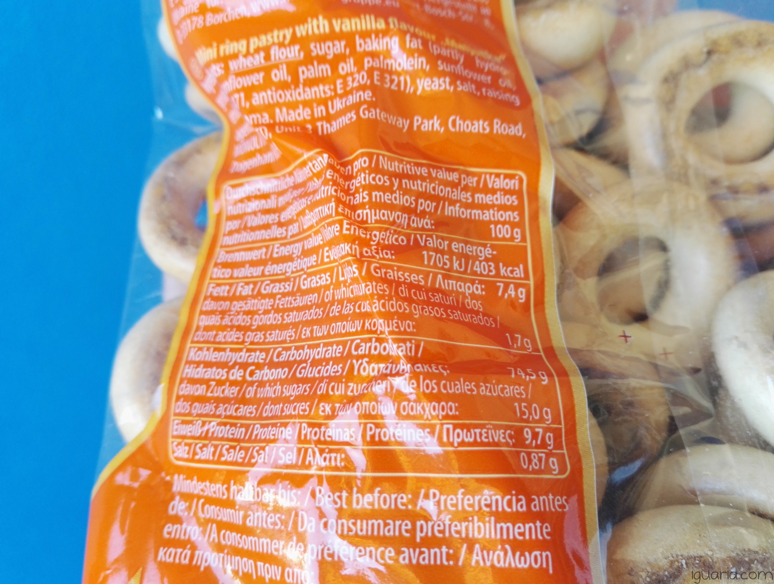 Vamos então a estes, eu arranjei dois pacotes diferentes ambos de baunilha, ambos produzidos na Ucrania, mas existem diversos sabores para experimentar, estes são ambos de baunilha e tem os mesmos ingredientes (eu ia comprar dois sabores diferentes mas sem querer comprei a versão normal e a versão mini com o mesmo sabor de baunilha), aqui vão os ingredientes: Farinha de trigo, açúcar, gordura de panificação, fermento, sal, levedante e aroma. Nada a notar nos ingredientes são os mesmos que um pão doce.
