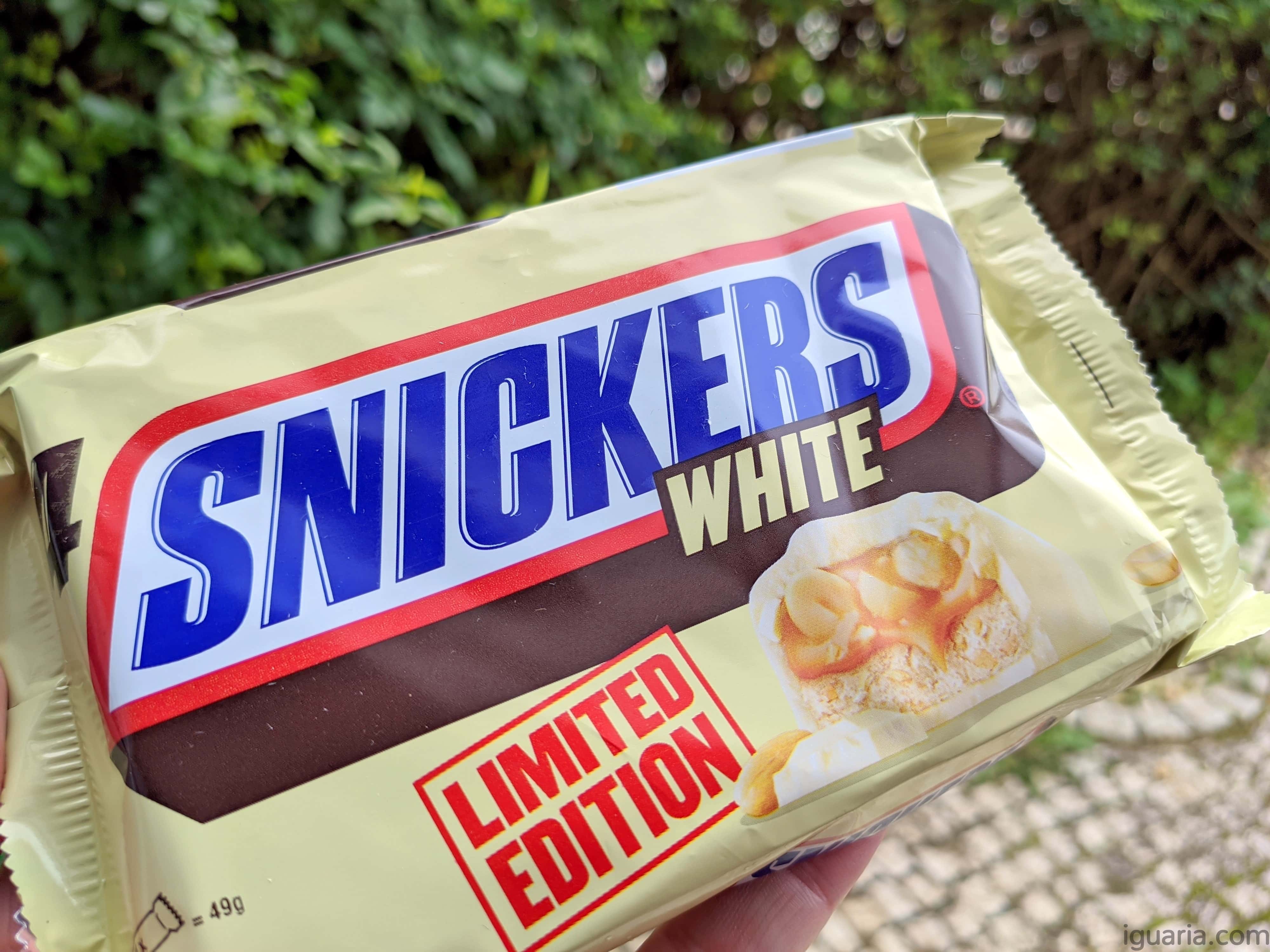 Eu sei…. EU SEI! Eu não sou grande adepto de chocolate branco por isso qualquer das minhas avaliações de um produto com chocolate branco tem de ser visto com uma pitada de sal, agora que já desabafei, para hoje temos o Chocolate Snickers White ou Snickers de Chocolate Branco uma edição limitada e pelo o que vi nos ingredientes é exatamente o que o pacote diz, tirar o chocolate de leite e substituir por chocolate branco, claro produzido pela Mars, Inc.