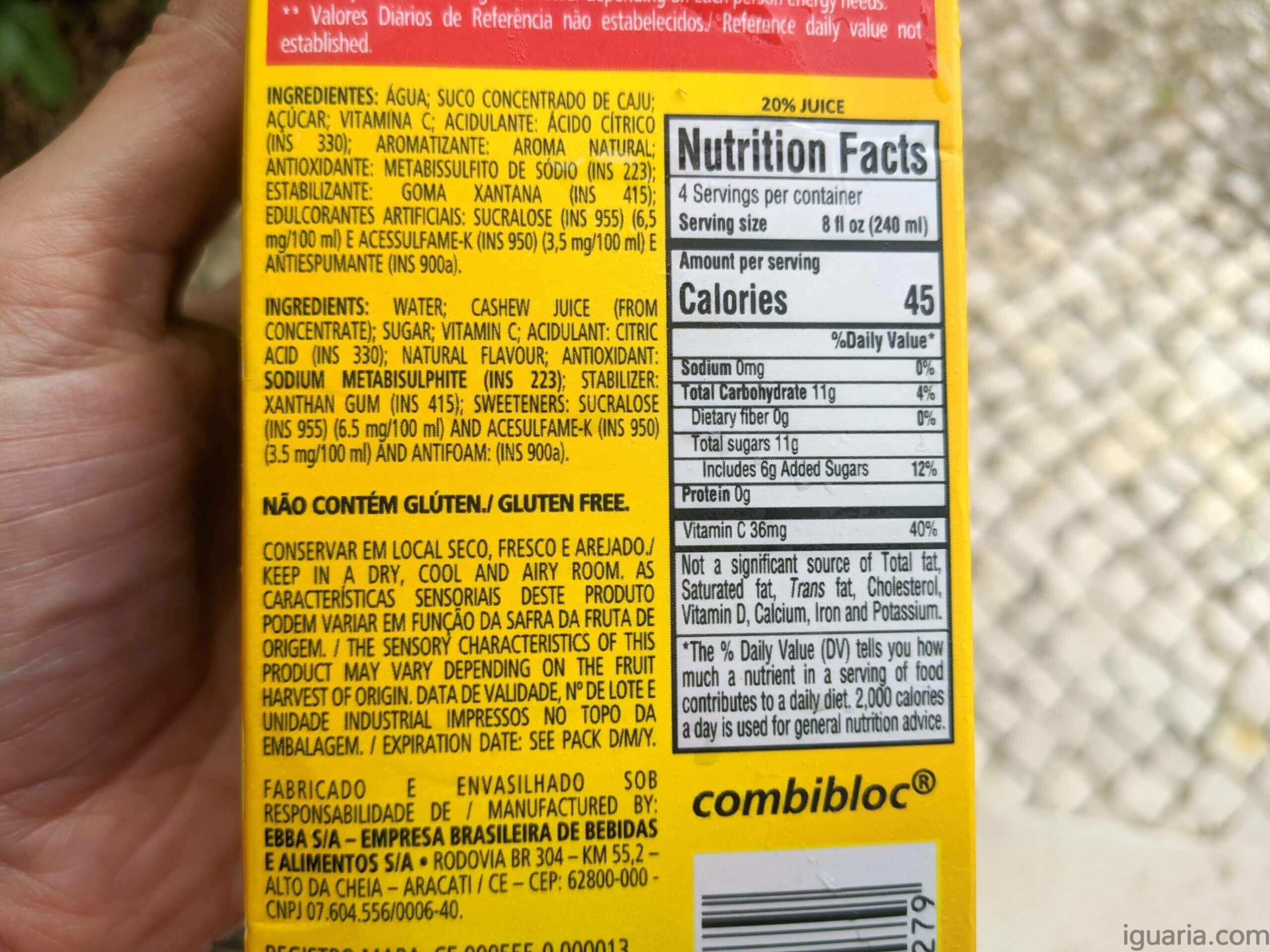 Os ingredientes são: Água, sumo concentrado de cajum, açúcar, vitamina c, ácido citrico (330), aroma natural, metabissuulfito de sódio (223), goma xantana (415), sucralose (955),acessulfame-k (950) e antiespumante (900a). Uffa se eu tivesse visto os ingredientes se calhar não comprava, temos concentrado, açúcar, adoçantes e aromas… até a Compal evita mistelas tão complexas, mas bem com 19 kcal por cada 100ml esta é uma bebida muito pouco calória, por isso nem sei.