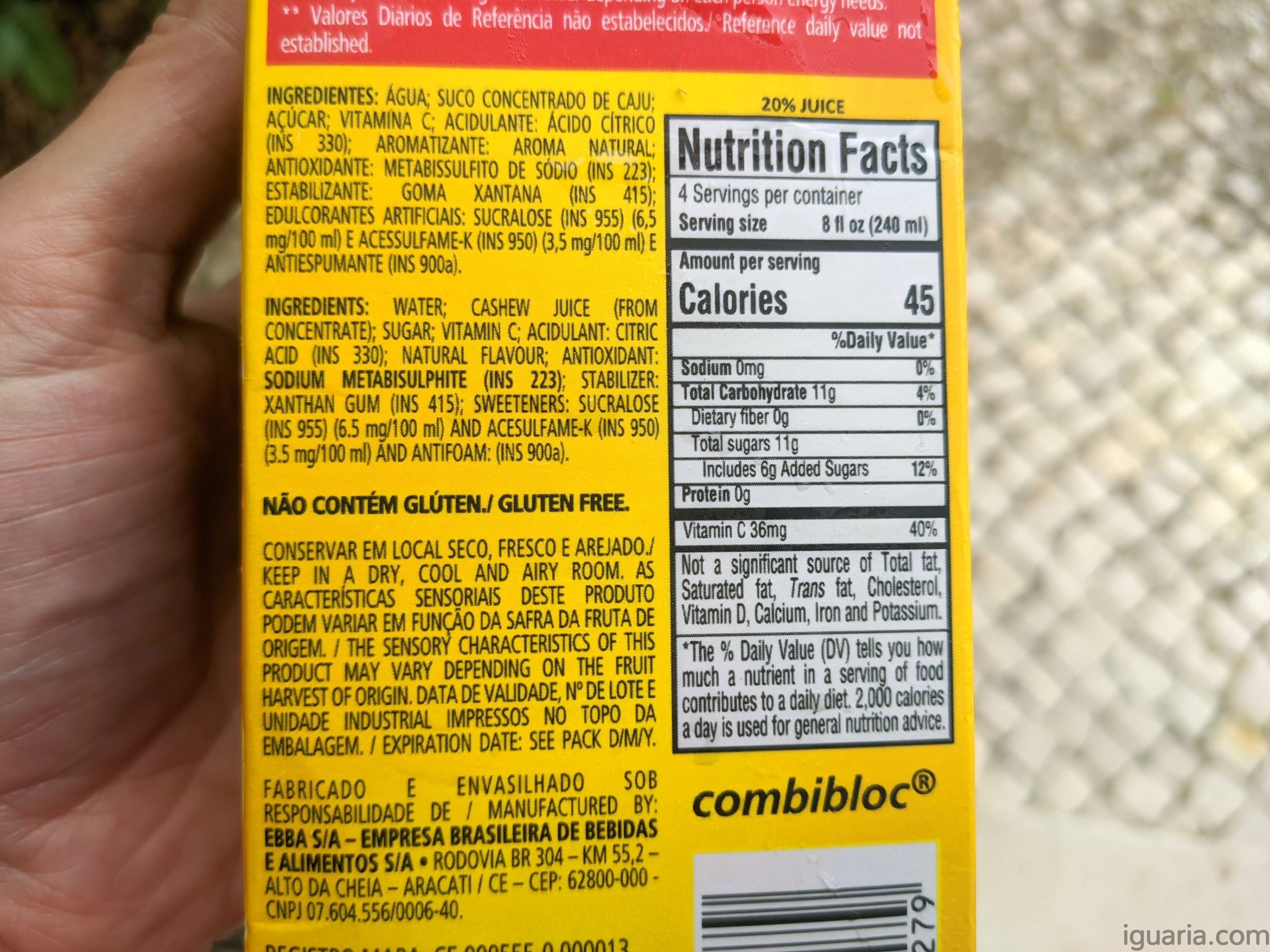 Os ingredientes são: Água, sumo concentrado de cajum, açúcar, vitamina c, ácido citrico (330), aroma natural, metabissuulfito de sódio (223), goma xantana (415), sucralose (955),acessulfame-k (950) e antiespumante (900a). Uffa se eu tivesse visto os ingredientes se calhar não comprava, temos concentrado, açúcar, adoçantes e aromas… até a Compal evita mistelas tão complexas, mas bem com 19 kcal por cada 100ml esta é uma bebida muito pouco calória, por isso nem sei.