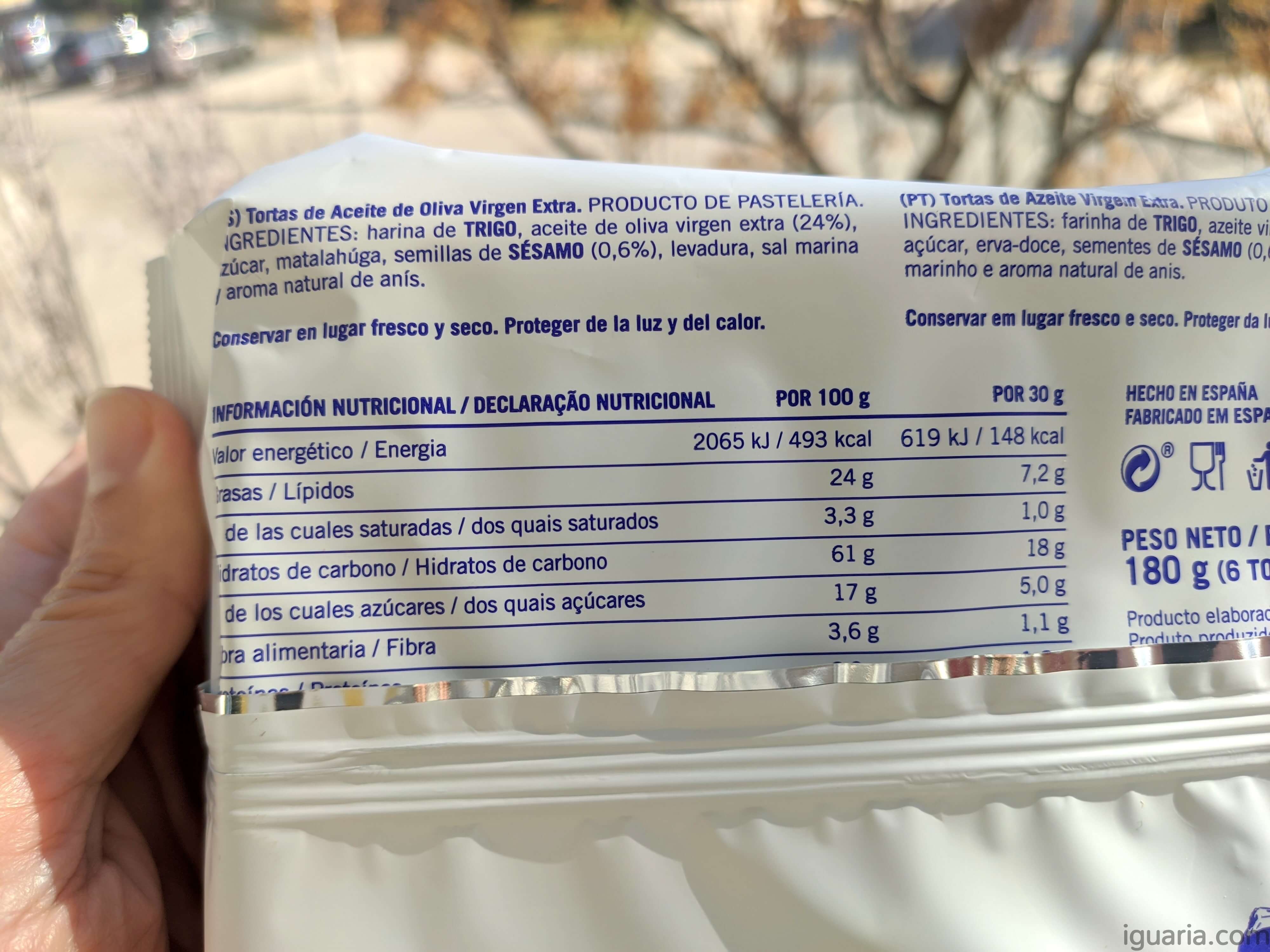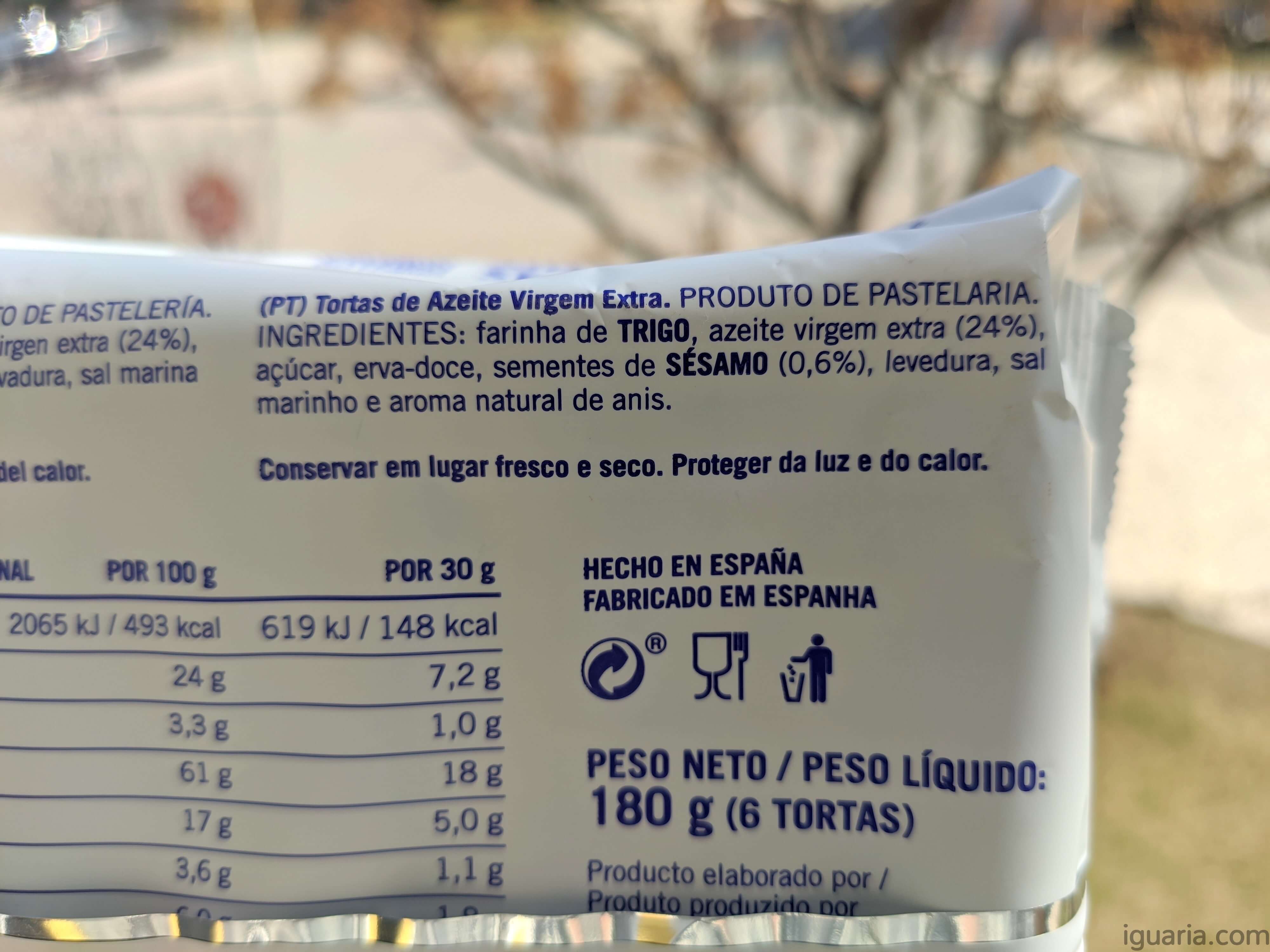 Os ingredientes são: Farinha de trigo, azeite virgem extra (24%), açúcar, erva-doce, sementes de sésamo (0,6%), levedura, sal marinho e aroma natural de anis. Com 483kcal por 100gr e 24gr de gordura e 17gr de açúcar este é um produto altamente calórico e como tal deve ser consumido com moderação.