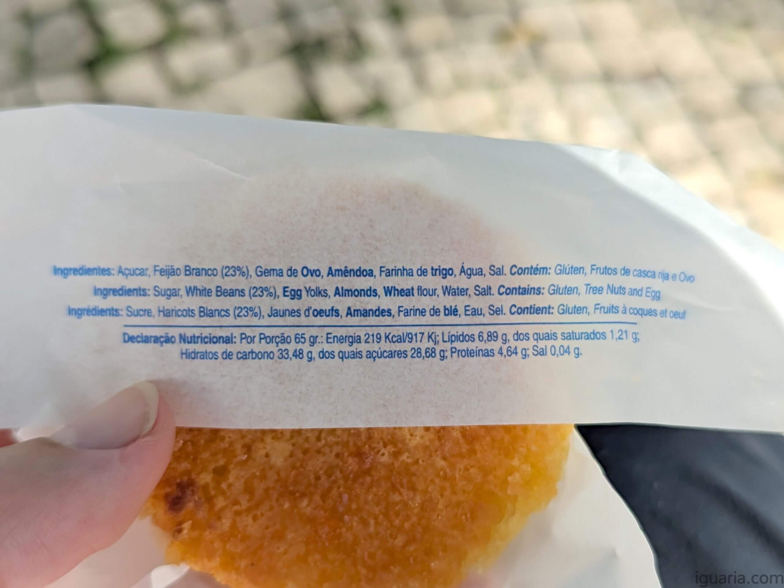 Os ingredientes são: Açúcar, Feijão Branco (23%), Gema de Ovo, Amêndoa, Farinha de Trigo, Água e Sal. Com 337kcal por 100gr este é um produto altamente calórico que deve ser consumido com moderação, mesmo que cada pastel são só 65gr ;D