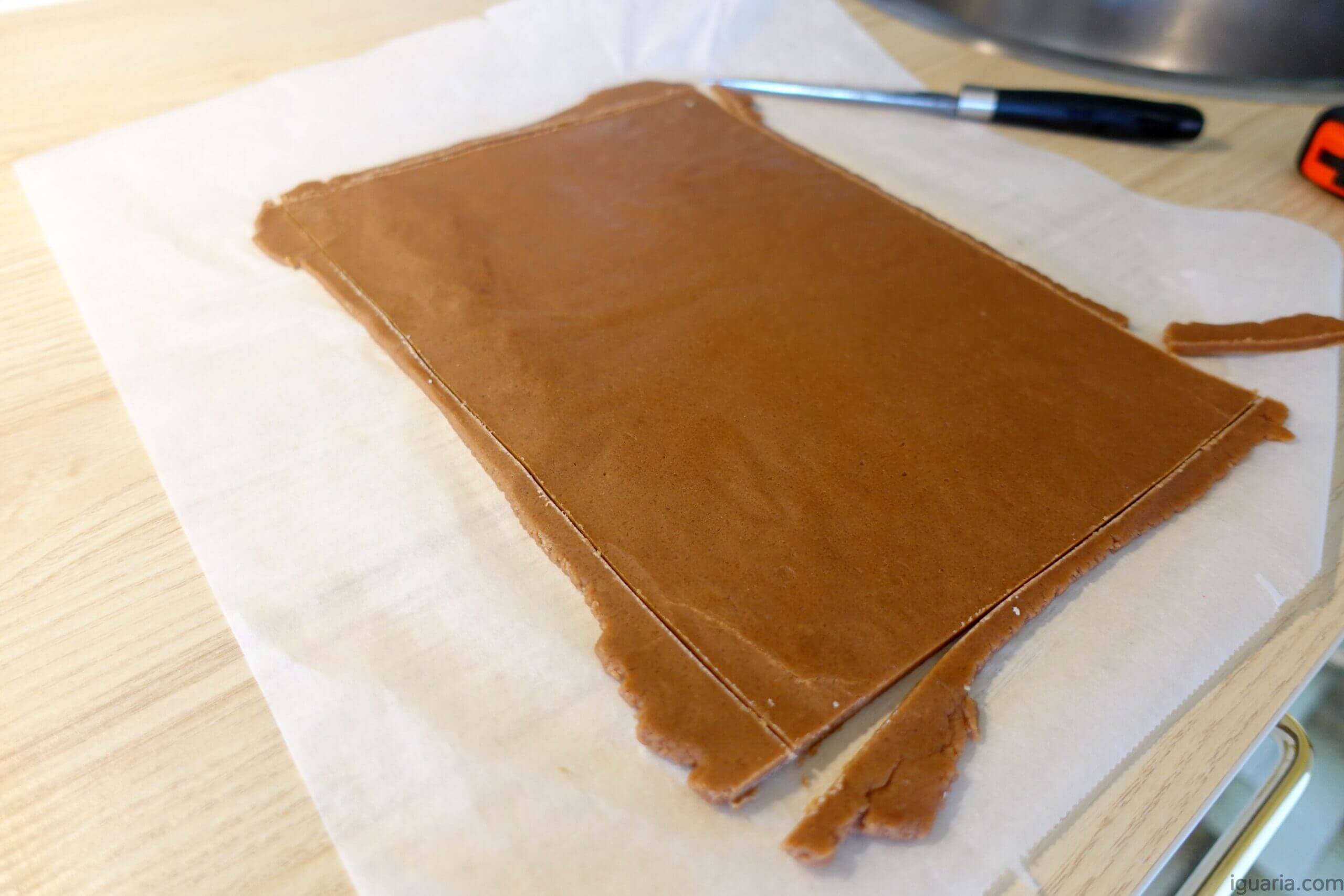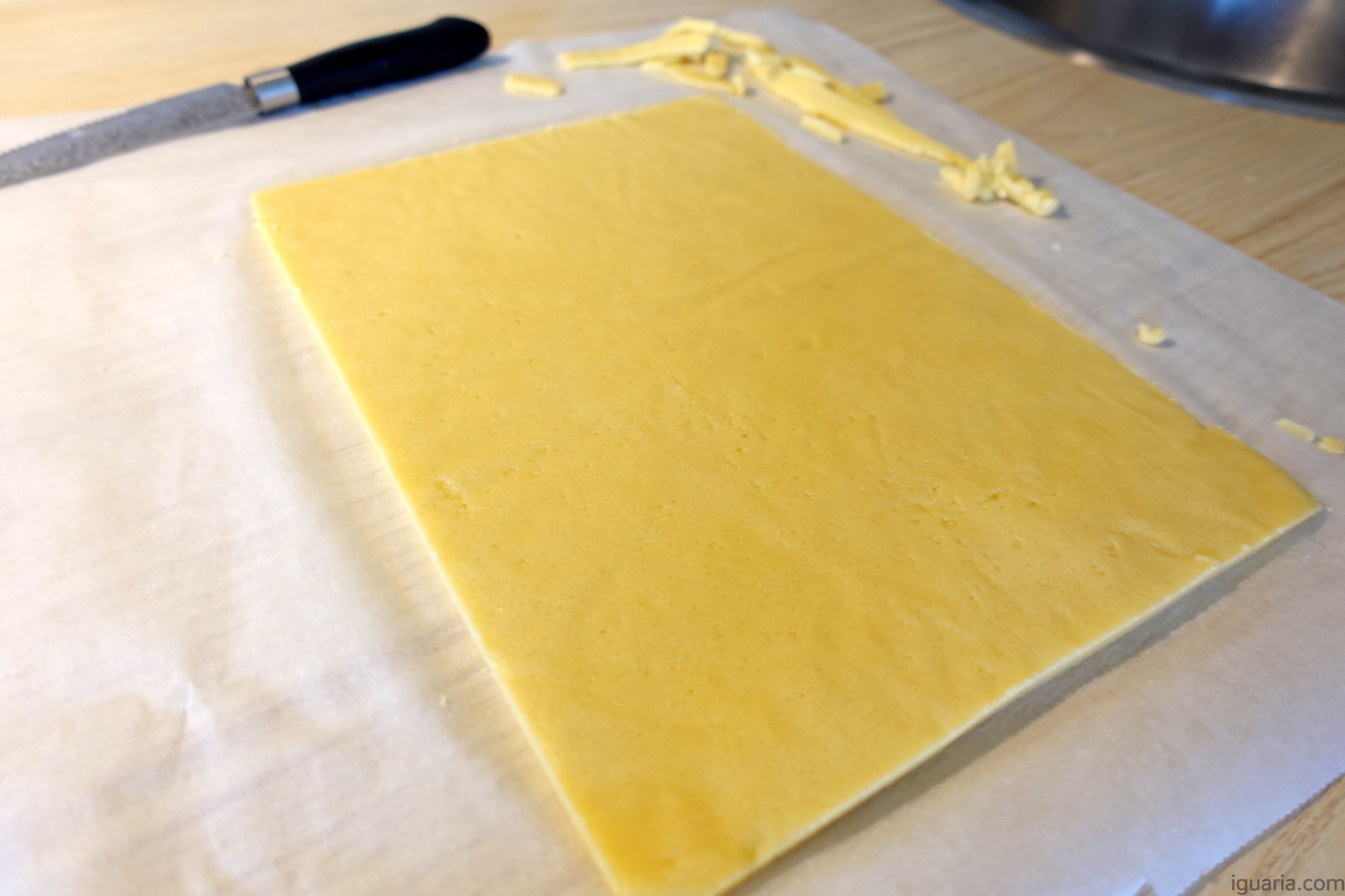7. Retira uma das massas do congelador e remove a folha de papel vegetal de cima. Usando uma folha A4 como molde e uma régua, corta cada massa num retângulo perfeito do tamanho da folha. Se as massas começarem a amolecer, volta a colocá-las no congelador.