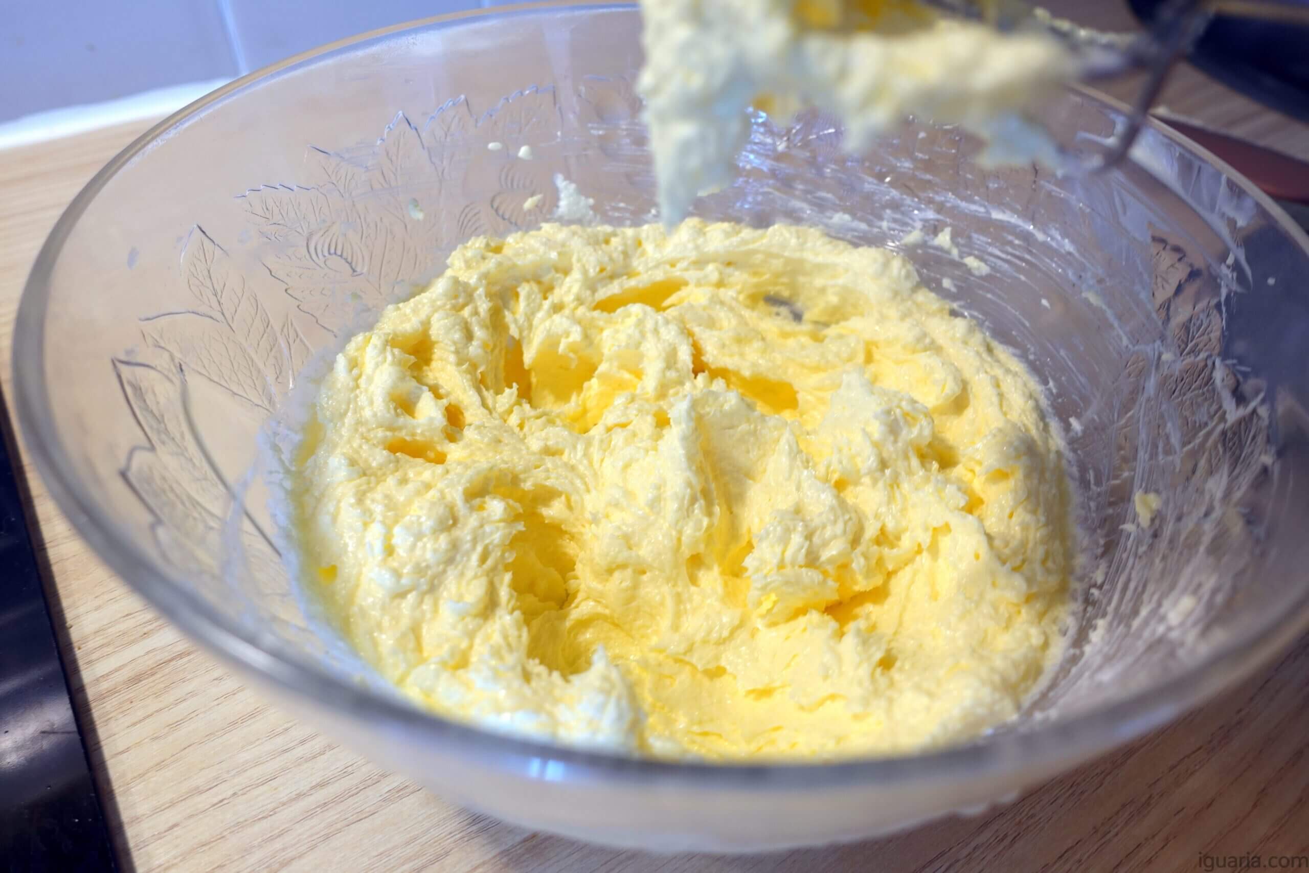 1. Começa por bater a manteiga com o açúcar e a baunilha numa velocidade média-alta até obteres um creme fofo e claro.