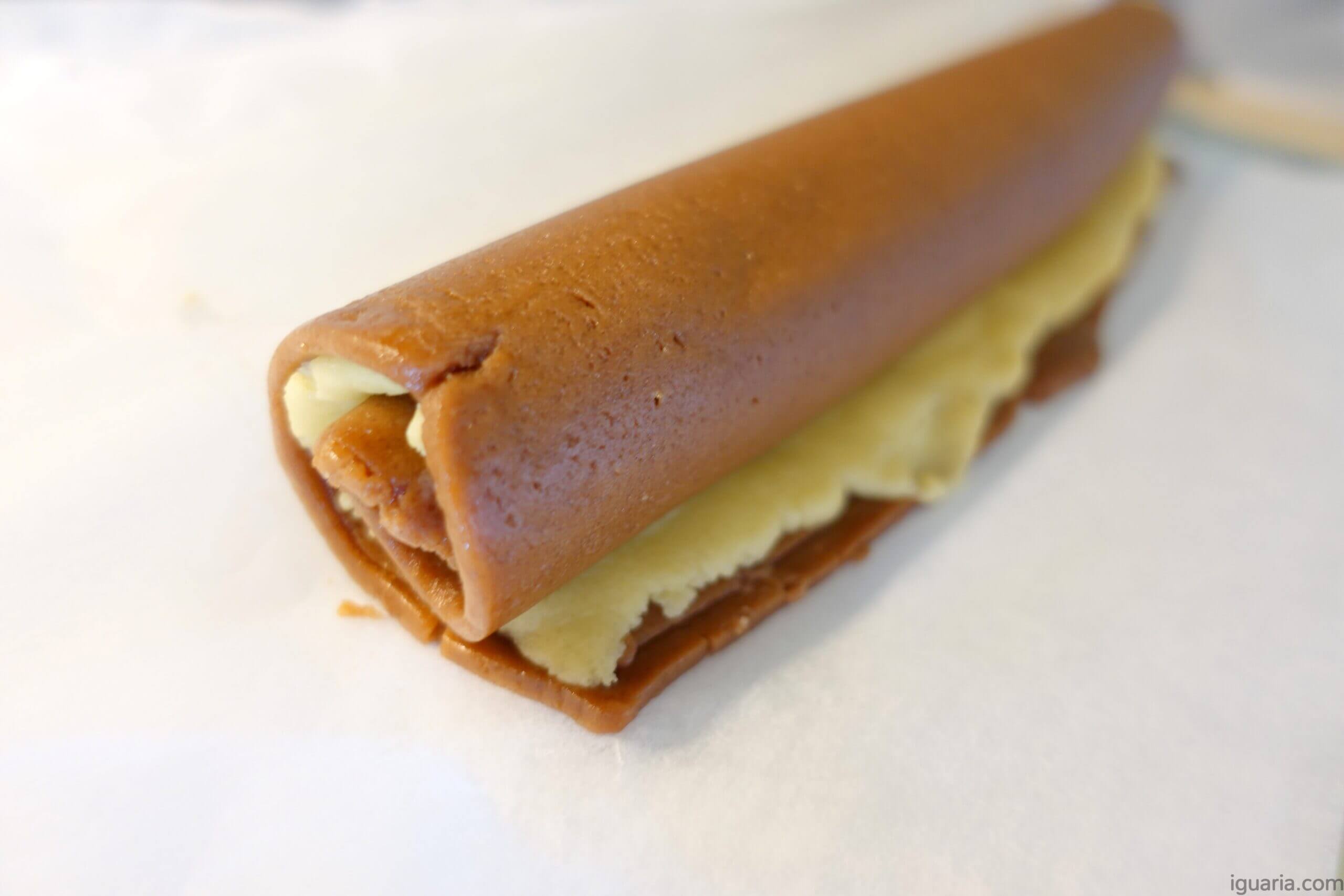 14. Se a massa rachar, simplesmente junta os pedaços com os dedos. Quando tiveres o rolo completo, rola-o suavemente na bancada para selar bem o rolo.