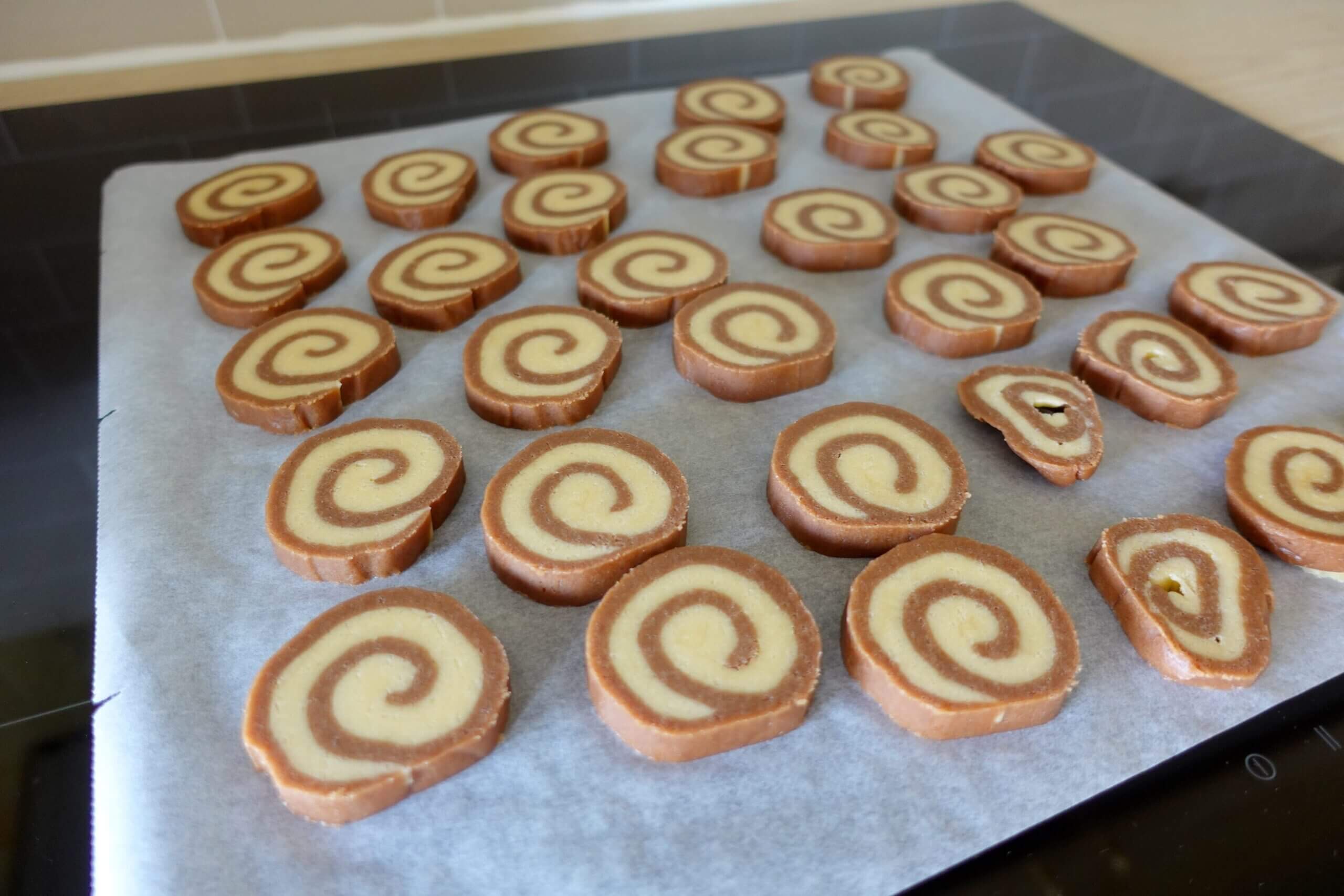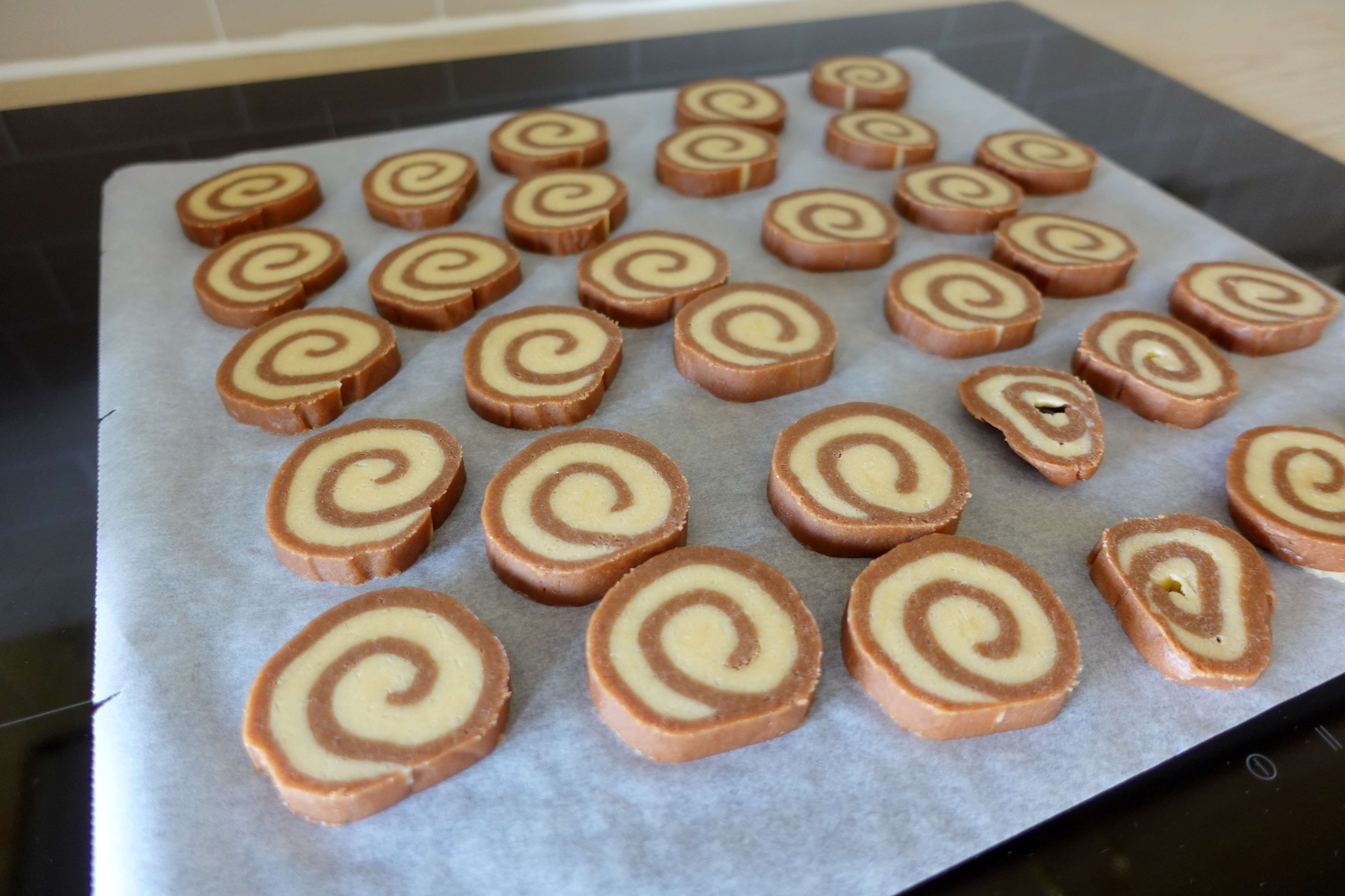 Quando cortas os biscoitos, usa uma faca bem afiada e faz um movimento rápido e limpo, se arrastares a faca ou serrares, vais desfazer o padrão de espiral.