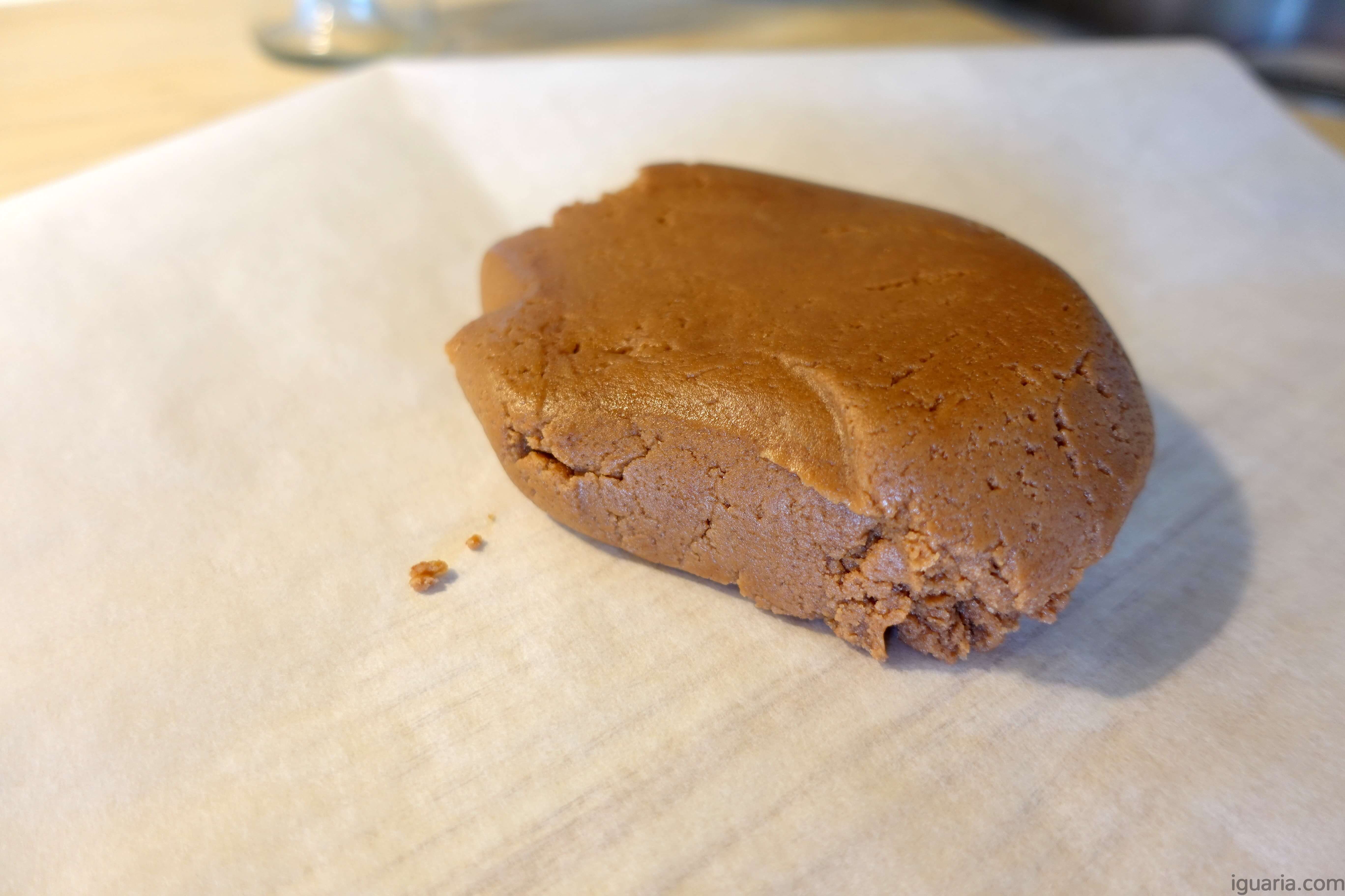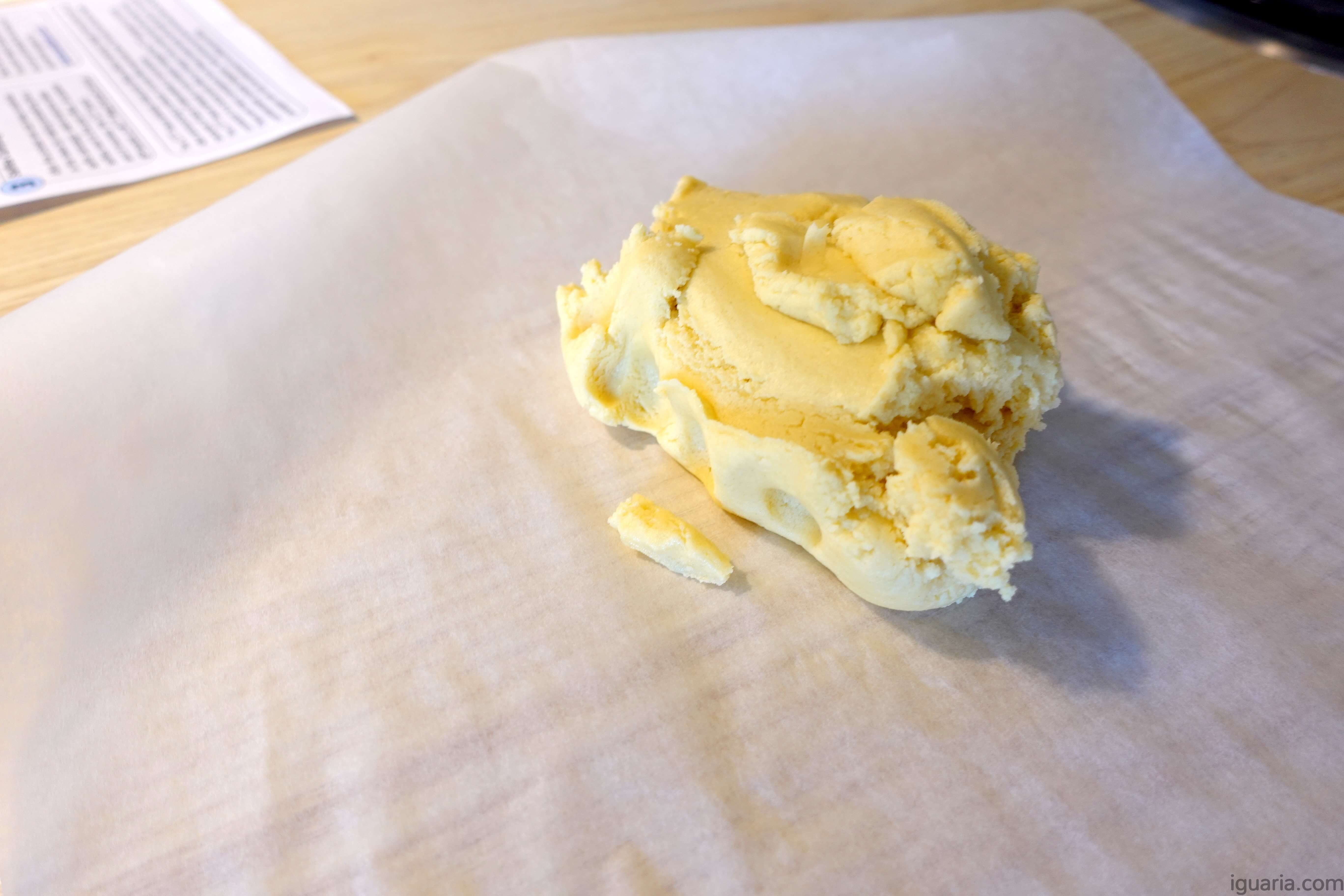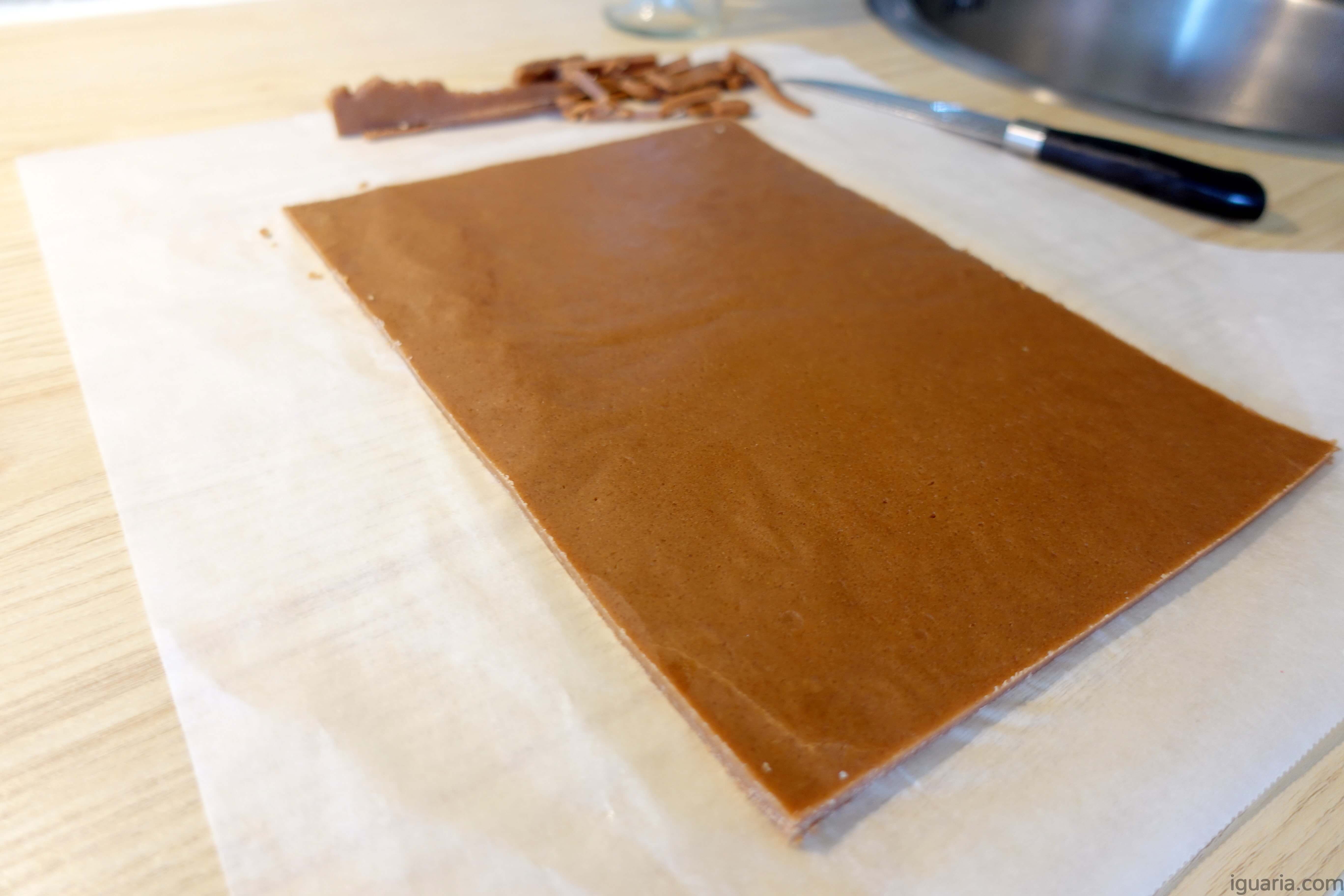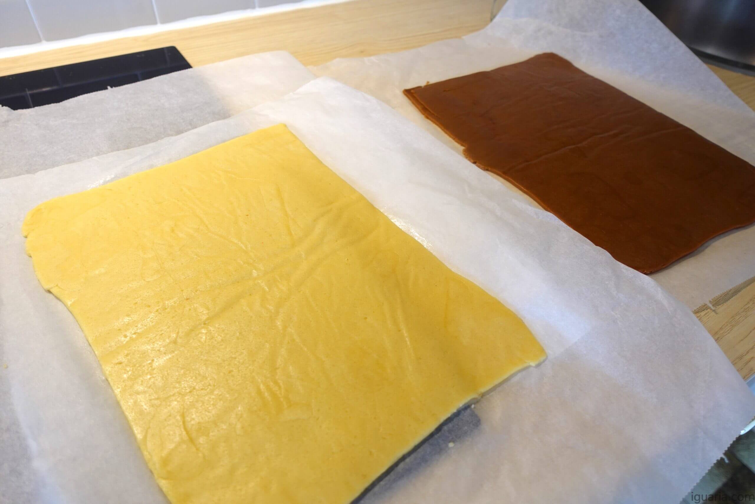 9. Agora retira ambas as massas do congelador e solta cuidadosamente cada massa do papel vegetal debaixo. Deixa a massa de baunilha sobre o papel.