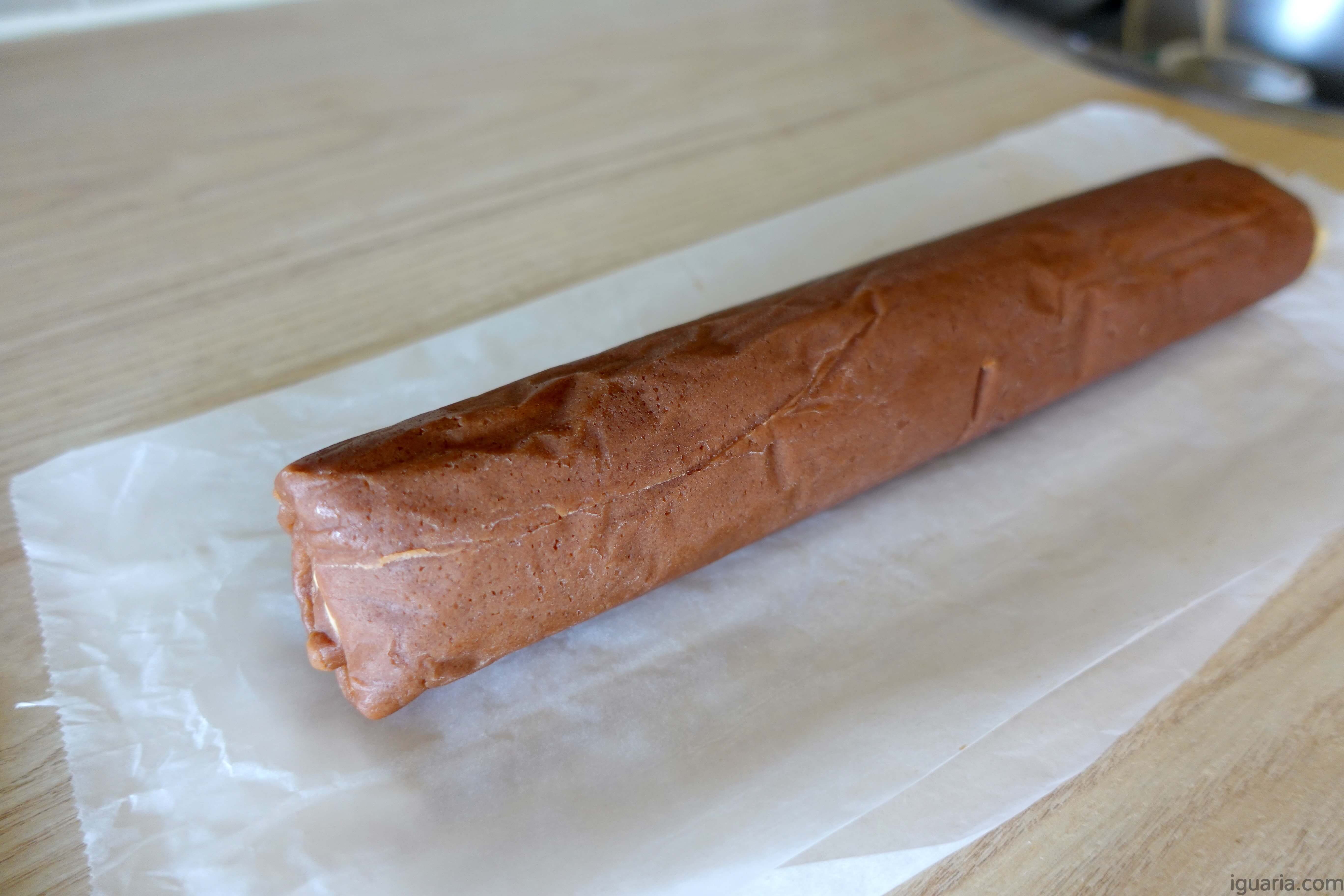15. Envolve o rolo firmemente em película aderente e refrigera por pelo menos 2 horas, ou até 5 dias. Para evitar que o rolo fique achatado de um lado, podes guardá-lo dentro de um tubo de papel de cozinha.