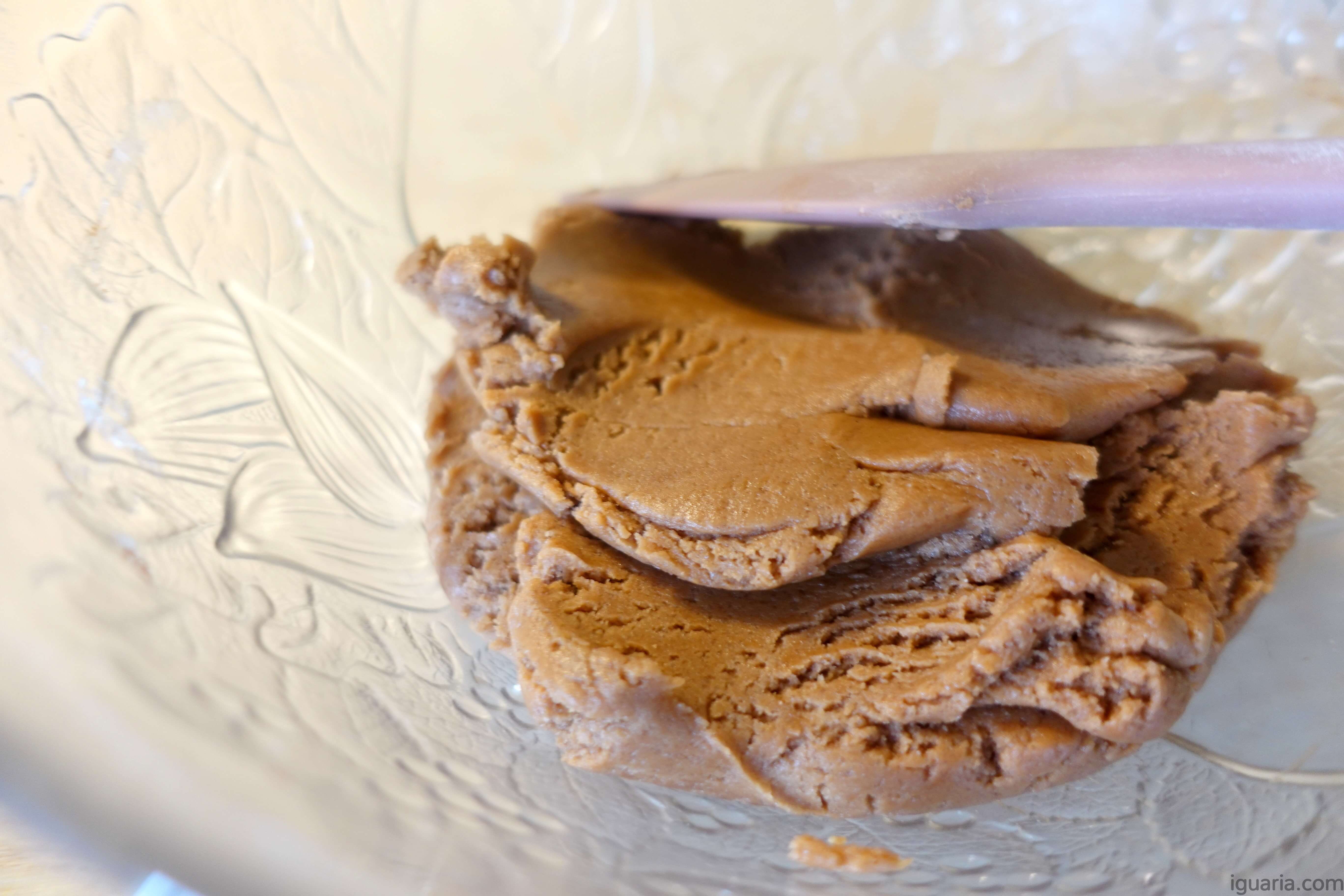4. Retira 360g da massa e reserva numa tigela pequena (esta será a massa de baunilha). Ao resto da massa adiciona o cacau peneirado e mistura até ficar uniforme na sua cor.