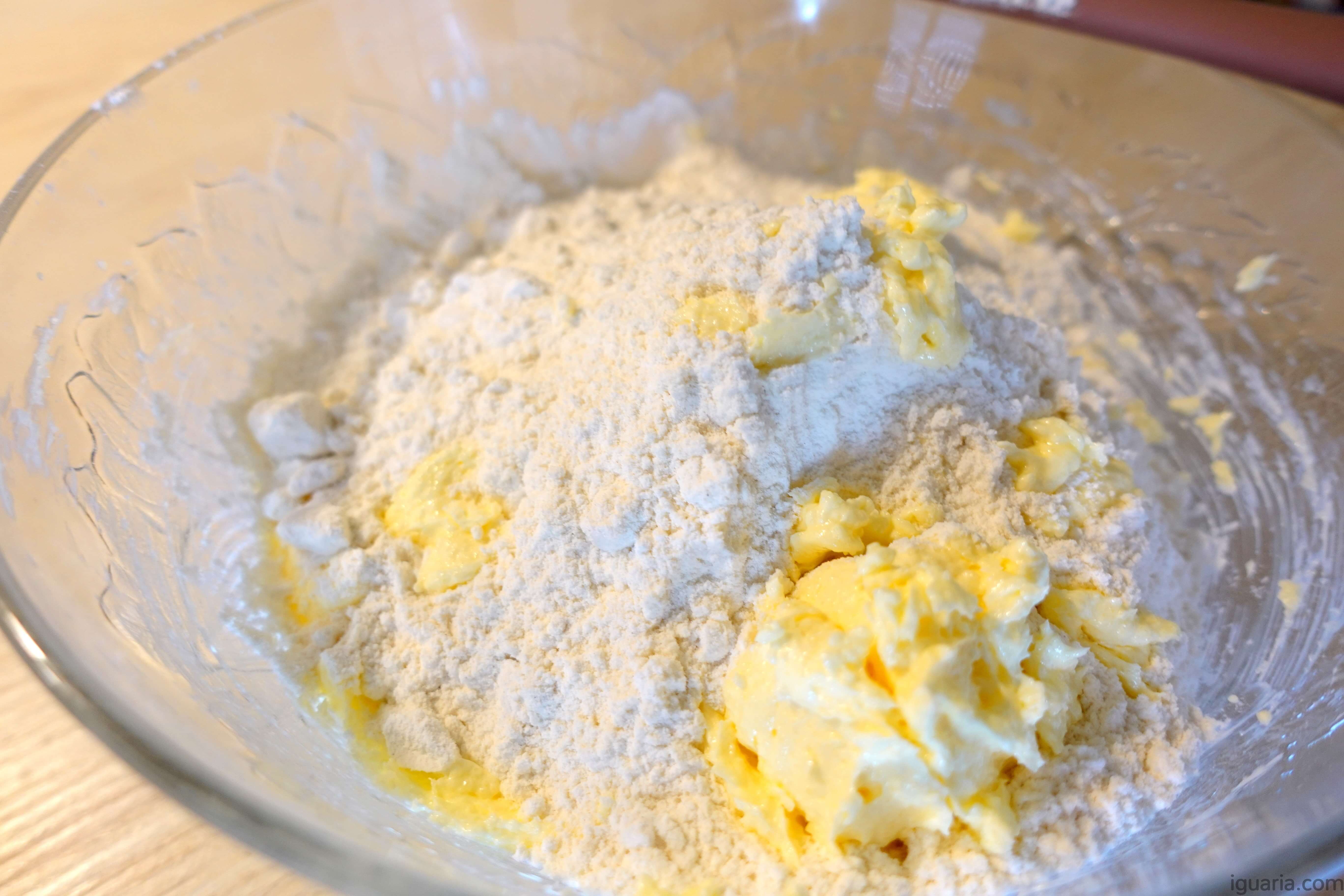 3. Junta então a farinha, o sal e o fermento em pó tudo peneirado. Mistura até formar uma massa homogénea.