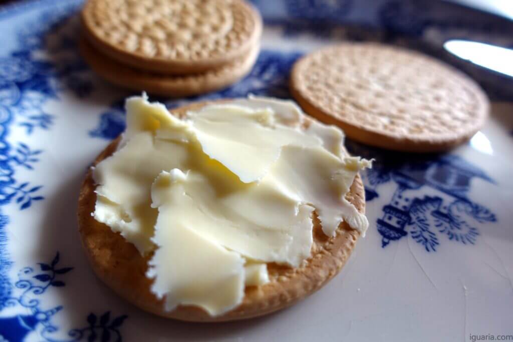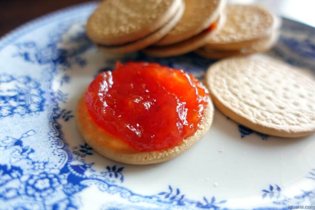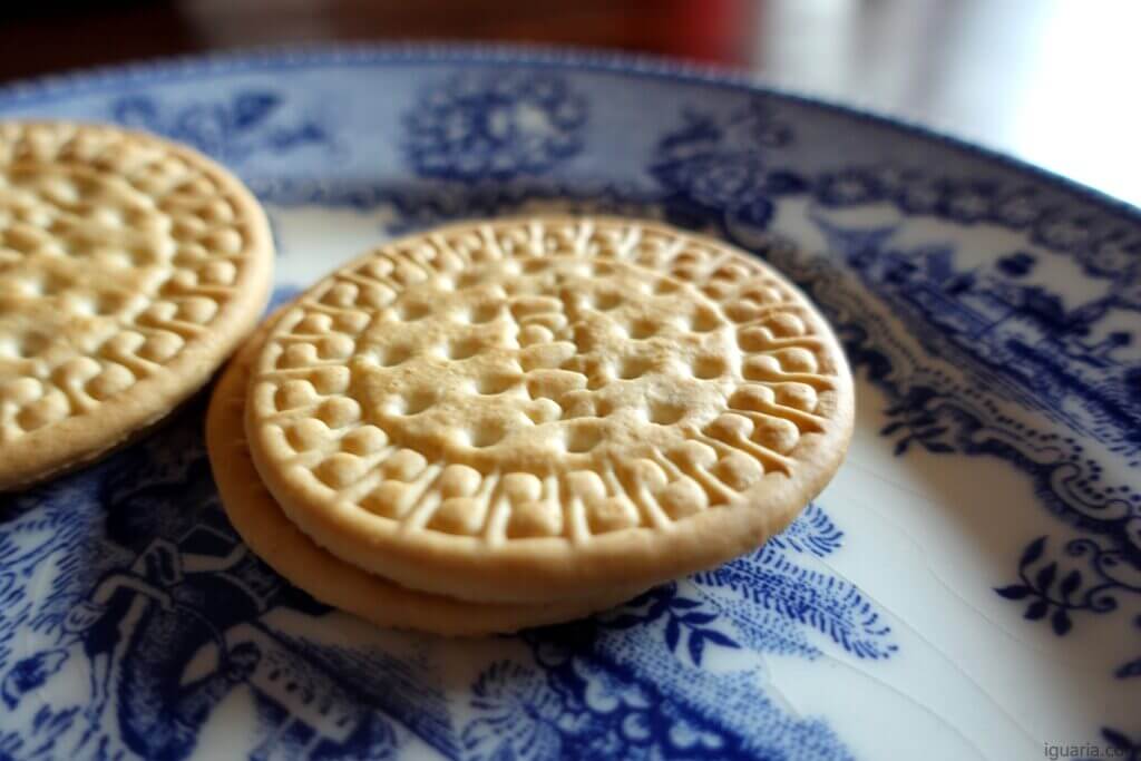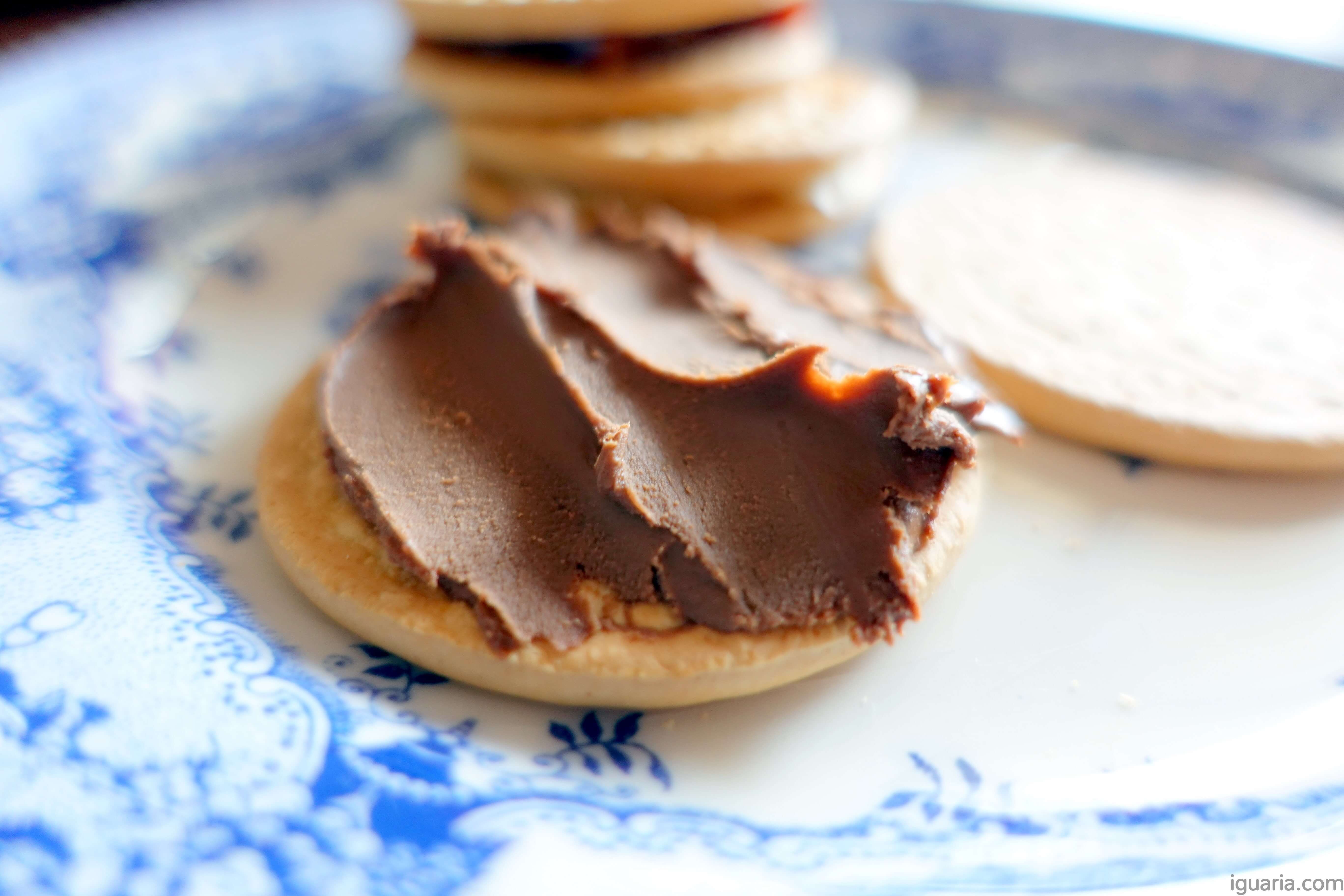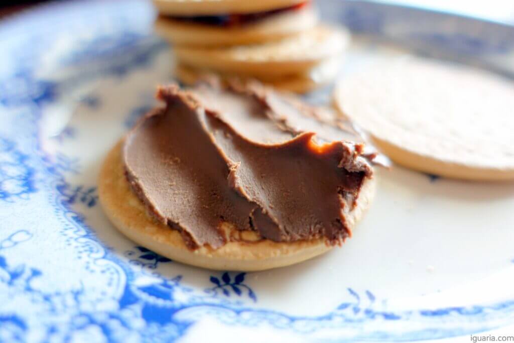 - Ok agarra numa bolacha maria, escolhe a parte rugosa da bolacha para o interior deita uma boa quantidade do doce ao teu gosto e depois… agarra noutra bolacha maria e espeta a parte rugosa dessa bolacha no recheio de forma a fechar a sandes!