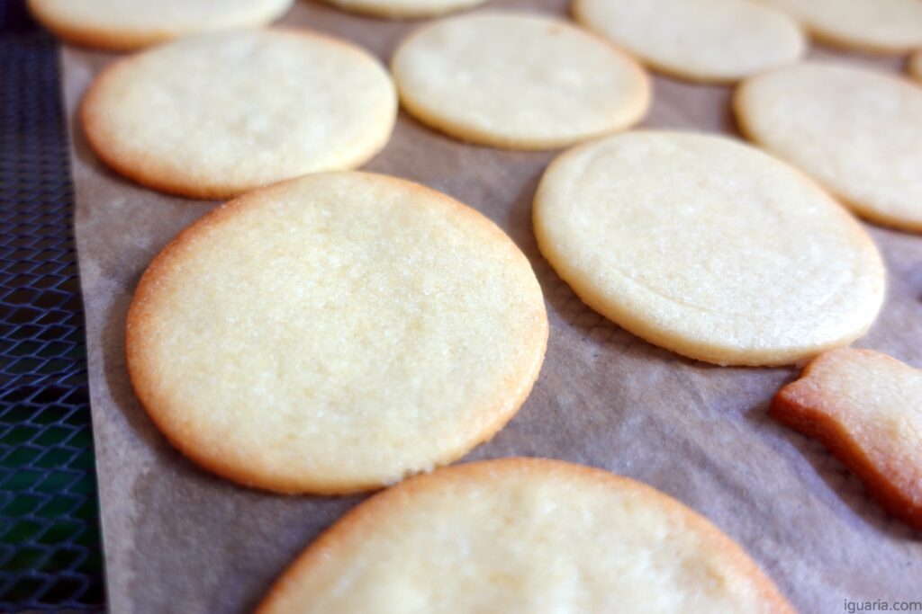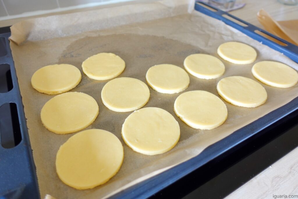 Podes também ajustar a grossura, eu queria umas bolachas substanciais, daí +/- 6mm mas se queres mais finas e crocantes vai para 4–5mm; se queres mais altas e macias quase shortcake aponta para 7–8mm.