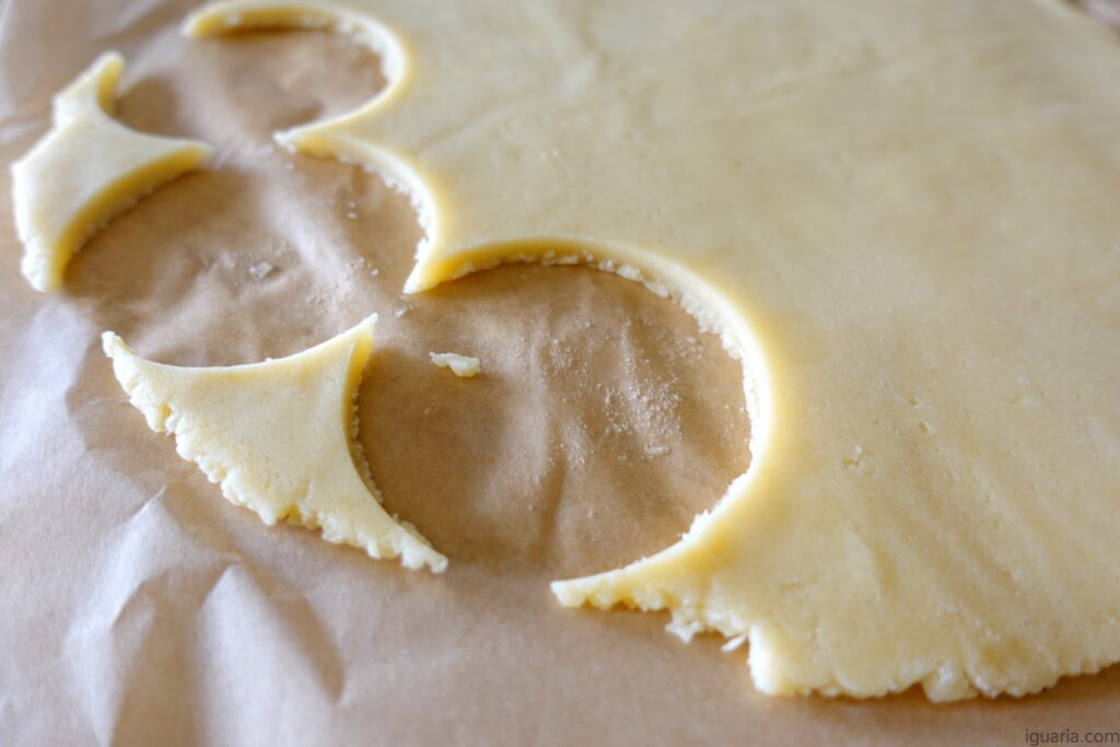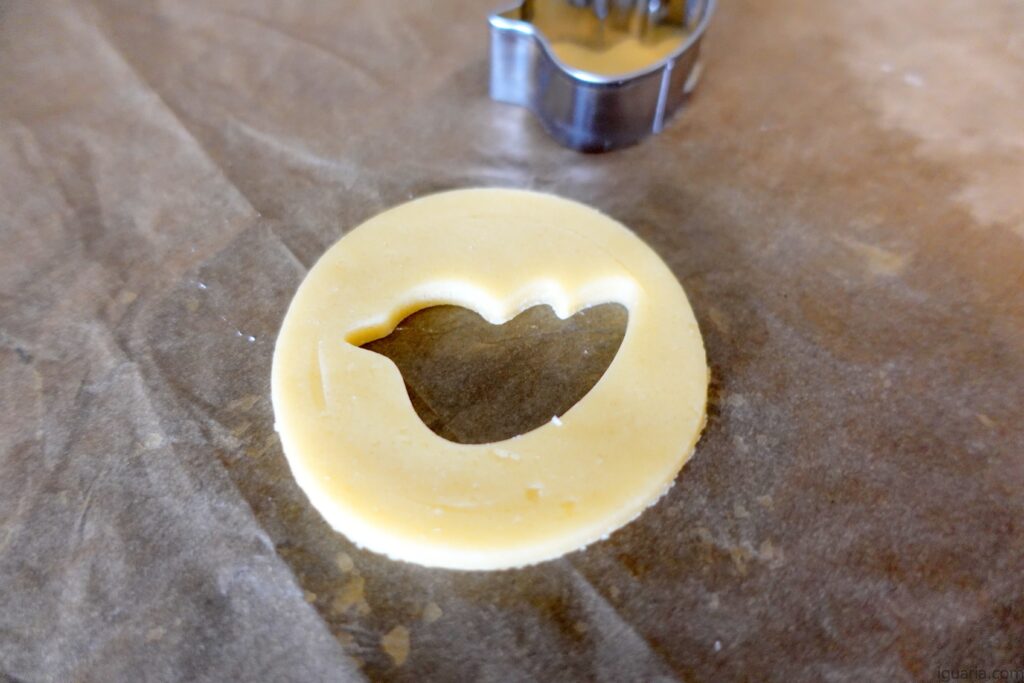 Se calhar não fui claro, mas o ideal é corta primeiro todas as bases redondas e depois usa o molde para retirar a forma no centro, assim evitas desperdício e manténs pares iguais.