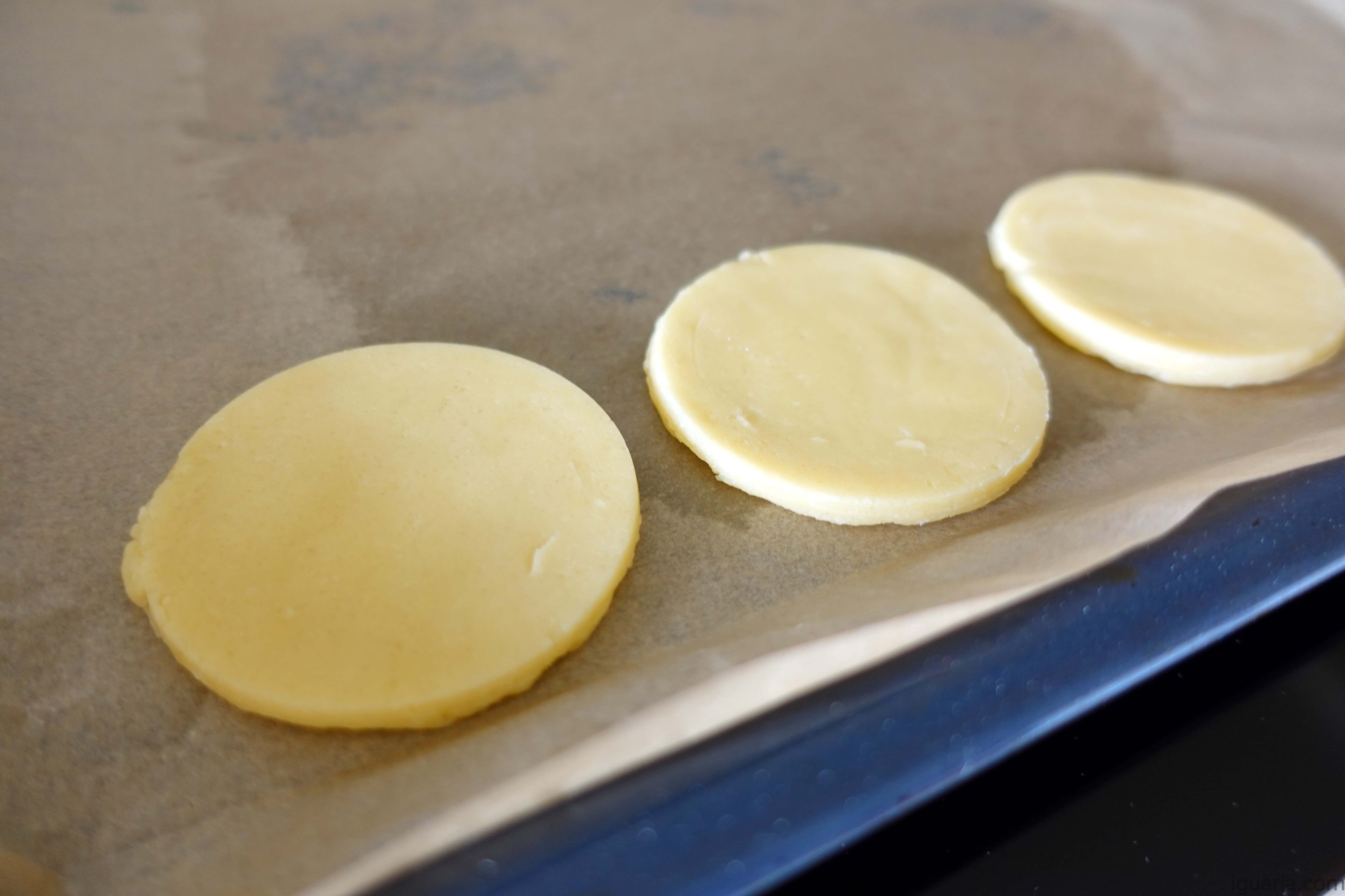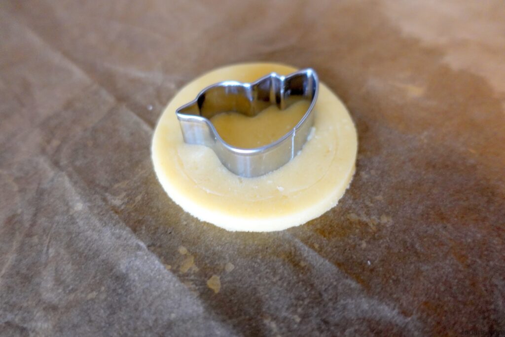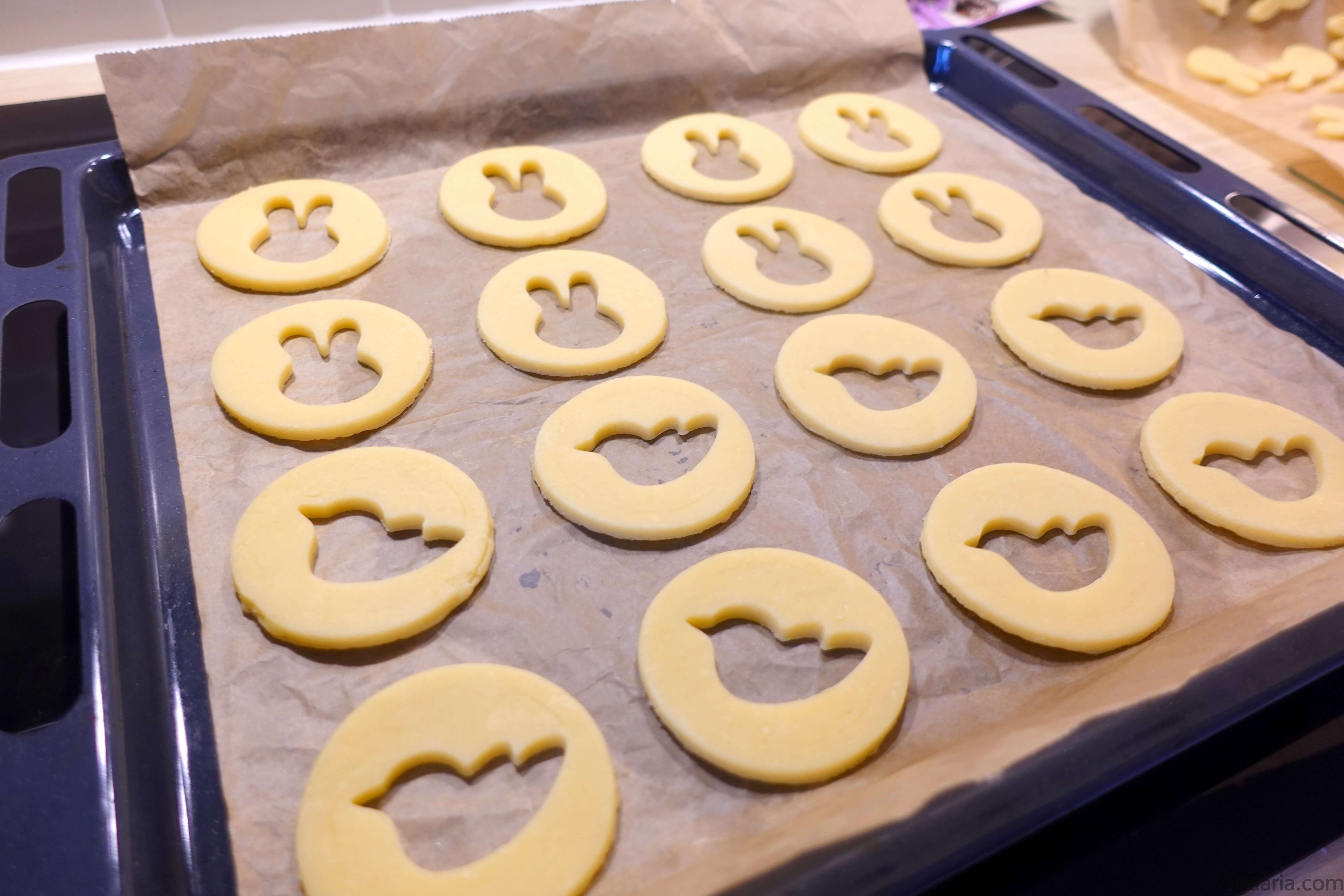 - Usa moldes, vais cortar primeiro círculos para as costas da bolacha e círculos que depois vais usar um molde para cortar formas giras, eu usei coelho e pássaro, nota que para cada circulo simples precisas de 1 círculo com um pássaro cortado ou coelho, dispõe numa folha de papel antiaderente e leva estas de volta ao frigorífico.