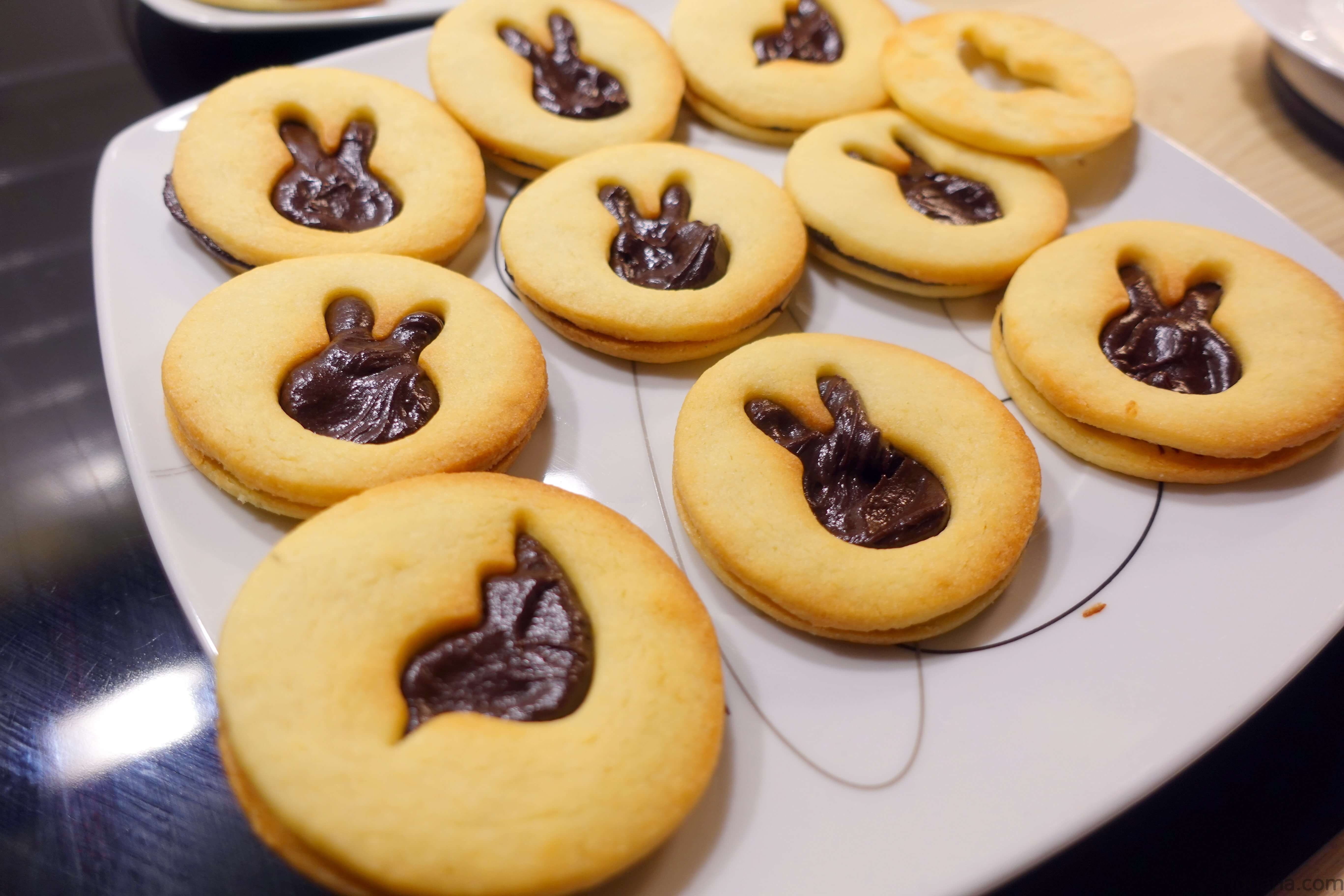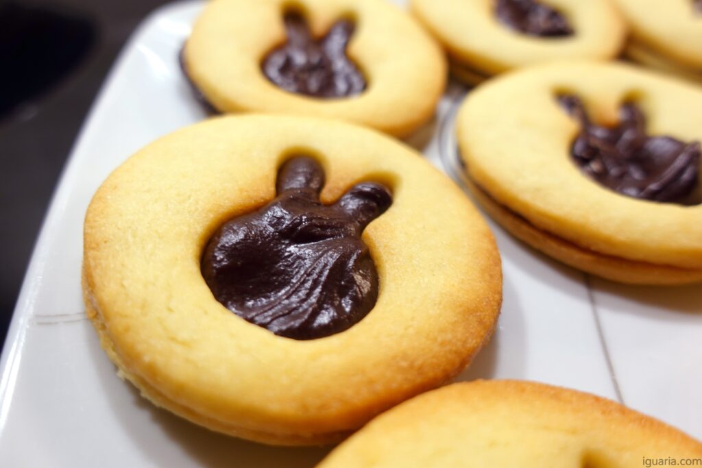 - Agora escolhe uma bolacha redonda e deita uma porção de ganache de chocolate, espalha e depois põe uma bolacha cortada com um coelho ou pássaro e põe por cima, pressionar ligeiramente e já está, repete até teres todas as bolachas recheadas.