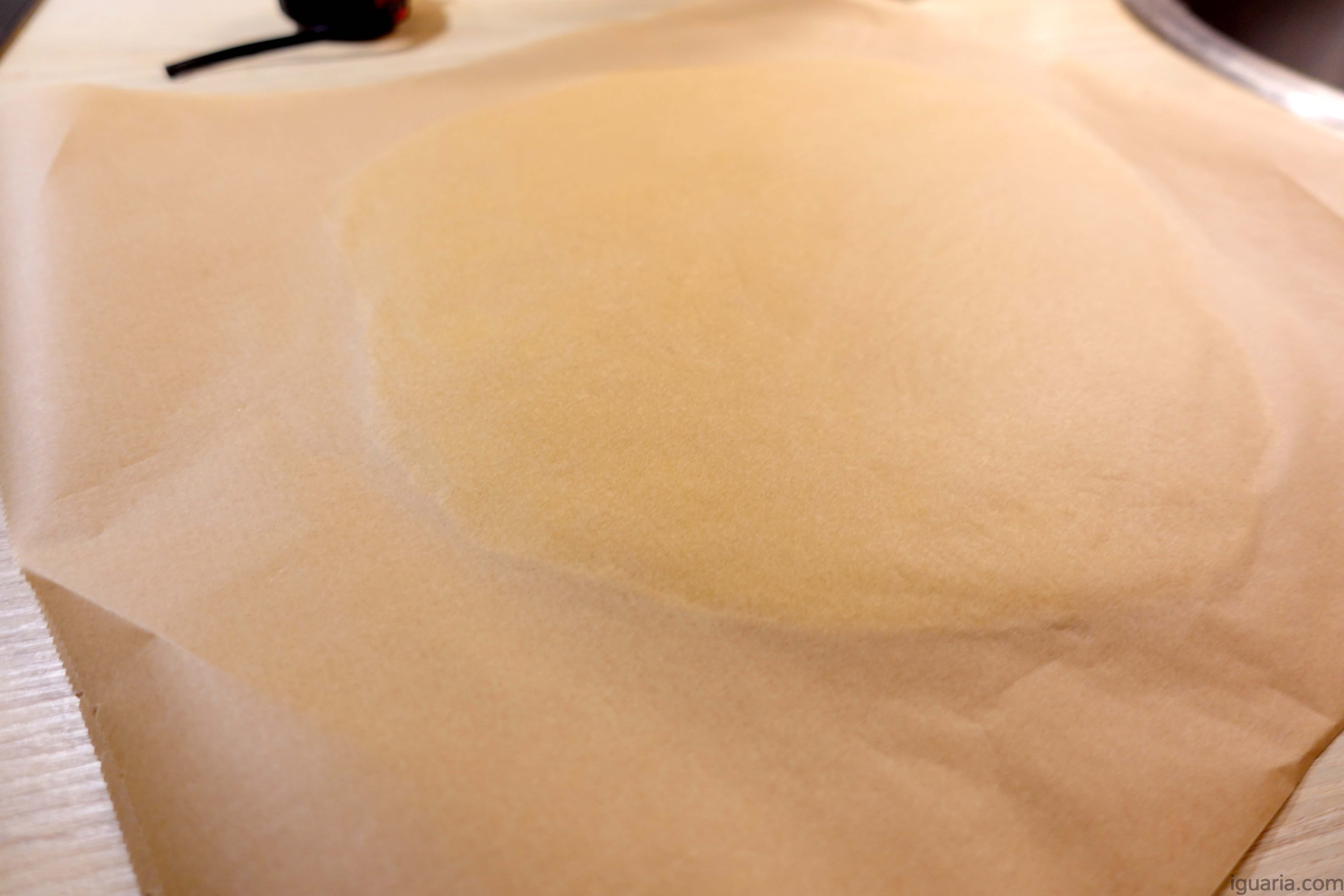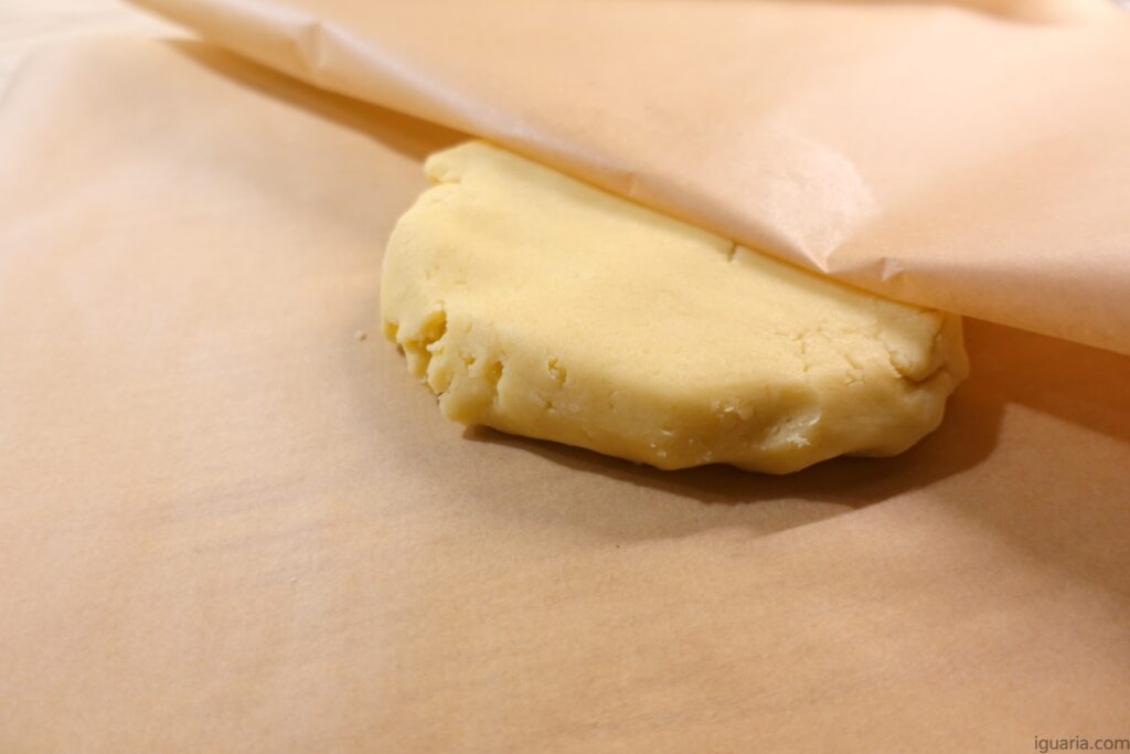 - Quando passar o tempo, retira a massa do frigorífico e estica esta (põe esta entre duas folhas de papel antiaderente para ajudar a não colar), até mais ou menos 6 mm de espessura.