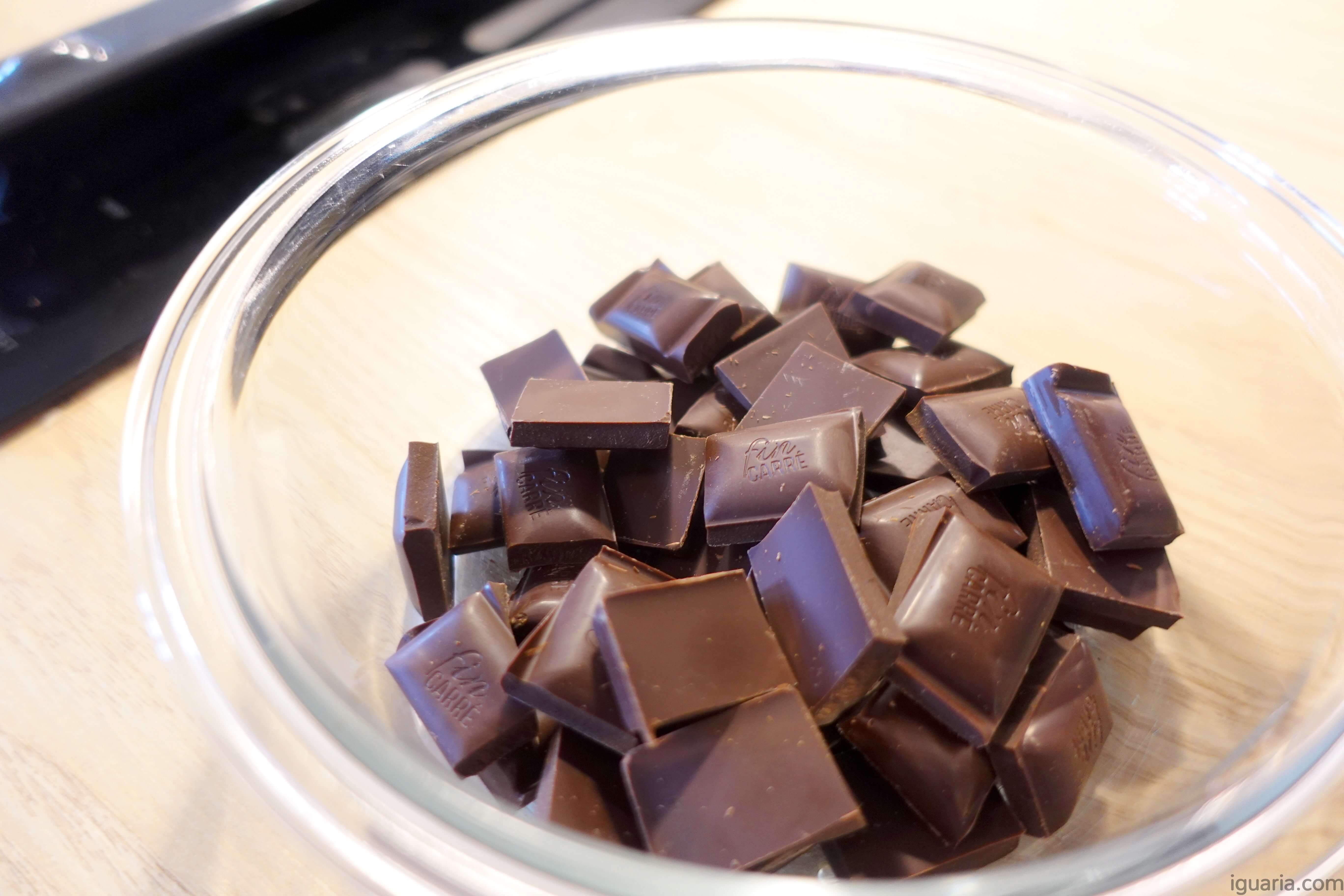 - Depois das bolachas estarem arrefecida (tu não queres rechear com elas quentes), vais fazer a ganache de chocolate, eu pico o chocolate numa tigela, junto as natas e levo ao microondas, por 10 segundos, tiro e mexo, e vou repetindo sempre em blocos de 10 segundos (assim não queimo o chocolate ou as natas), quando tiver tudo cremoso e derretido então está bom.