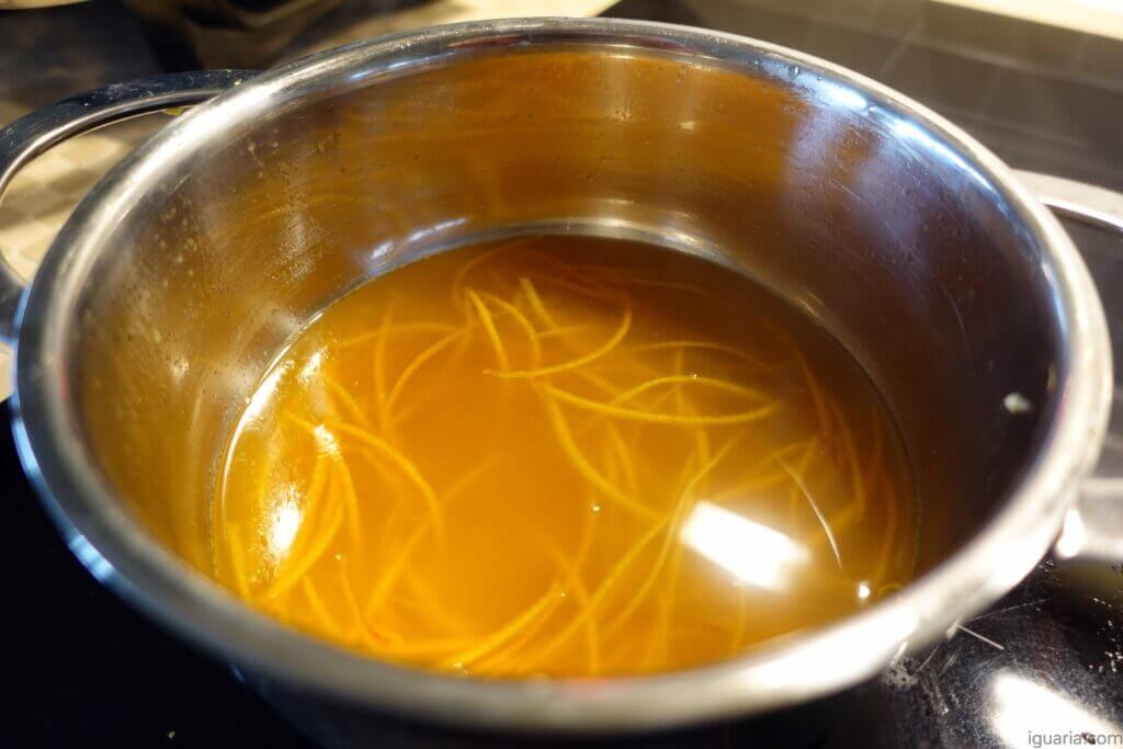 - Leva tudo a um lume brando, quando o açúcar dissolver completamente junta as tiras de casca em juliana e deixa cozinhar por uns 10 a 15 minutos até criar um xarope leve.